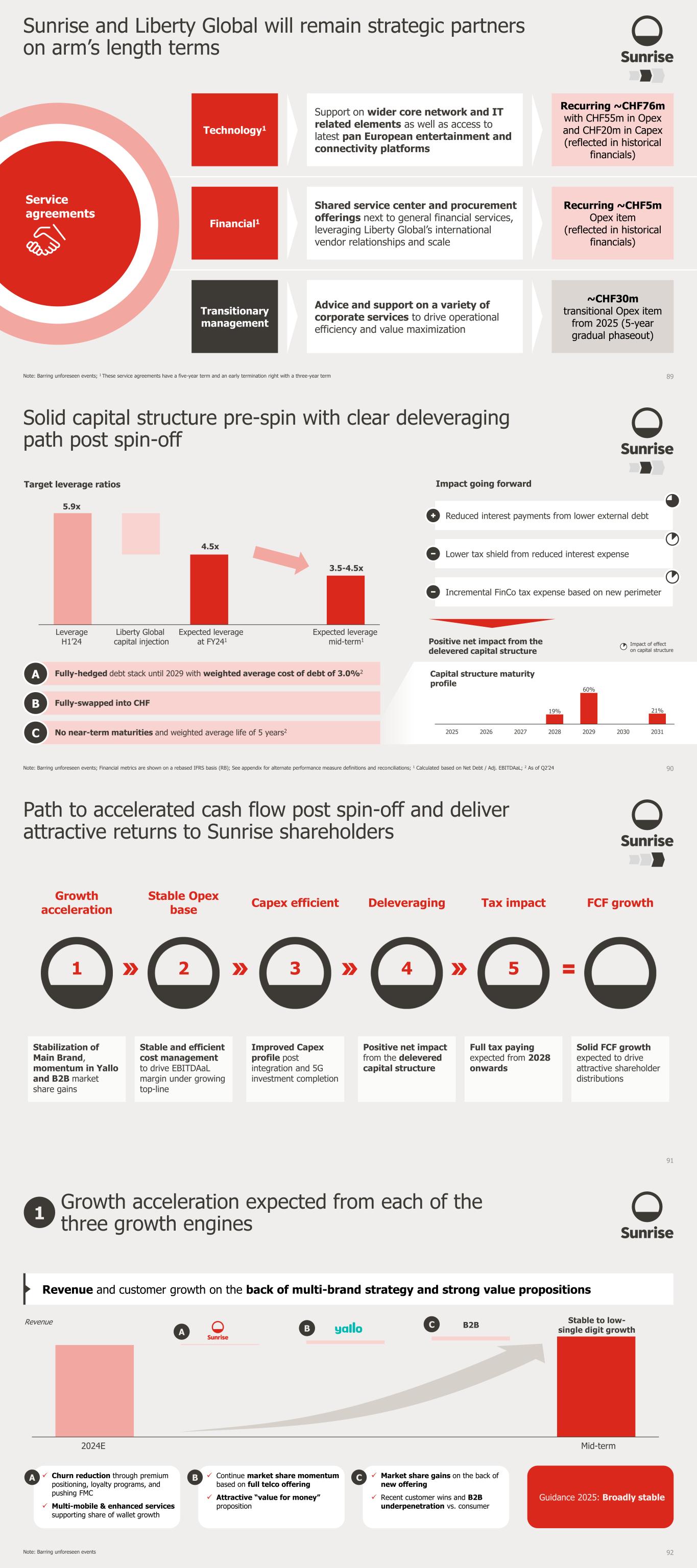 89 Sunrise and Liberty Global will remain strategic partners on arm’s length terms Service agreements Technology1 Financial1 Transitionary management Support on wider core network and IT related elements as well as access to latest pan European entertainment and connectivity platforms Shared service center and procurement offerings next to general financial services, leveraging Liberty Global’s international vendor relationships and scale Advice and support on a variety of corporate services to drive operational efficiency and value maximization Recurring ~CHF76m with CHF55m in Opex and CHF20m in Capex (reflected in historical financials) Recurring ~CHF5m Opex item (reflected in historical financials) ~CHF30m transitional Opex item from 2025 (5-year gradual phaseout) Note: Barring unforeseen events; 1 These service agreements have a five-year term and an early termination right with a three-year term 90 No near-term maturities and weighted average life of 5 years2 Fully-swapped into CHF Fully-hedged debt stack until 2029 with weighted average cost of debt of 3.0%2 Note: Barring unforeseen events; Financial metrics are shown on a rebased IFRS basis (RB); See appendix for alternate performance measure definitions and reconciliations; 1 Calculated based on Net Debt / Adj. EBITDAaL; 2 As of Q2’24 Target leverage ratios Expected leverage mid-term1 Leverage H1’24 4.5x Impact going forward Liberty Global capital injection Solid capital structure pre-spin with clear deleveraging path post spin-off A B C Reduced interest payments from lower external debt Positive net impact from the delevered capital structure Lower tax shield from reduced interest expense Incremental FinCo tax expense based on new perimeter Impact of effect on capital structure 19% 60% 21% 2025 2026 2027 2028 2029 2030 2031 Capital structure maturity profile 5.9x Expected leverage at FY241 3.5-4.5x 91 1 Growth acceleration Stabilization of Main Brand, momentum in Yallo and B2B market share gains 2 Stable Opex base Stable and efficient cost management to drive EBITDAaL margin under growing top-line 3 Capex efficient Improved Capex profile post integration and 5G investment completion 4 Deleveraging Positive net impact from the delevered capital structure FCF growth Solid FCF growth expected to drive attractive shareholder distributions Path to accelerated cash flow post spin-off and deliver attractive returns to Sunrise shareholders 5 Tax impact Full tax paying expected from 2028 onwards 92 1 2024E Mid-term Stable to low- single digit growth ✓ Churn reduction through premium positioning, loyalty programs, and pushing FMC ✓ Multi-mobile & enhanced services supporting share of wallet growth ✓ Continue market share momentum based on full telco offering ✓ Attractive “value for money” proposition B2B ✓ Market share gains on the back of new offering ✓ Recent customer wins and B2B underpenetration vs. consumer Growth acceleration expected from each of the three growth engines Revenue and customer growth on the back of multi-brand strategy and strong value propositions Guidance 2025: Broadly stable Revenue A B C A B C Note: Barring unforeseen events
