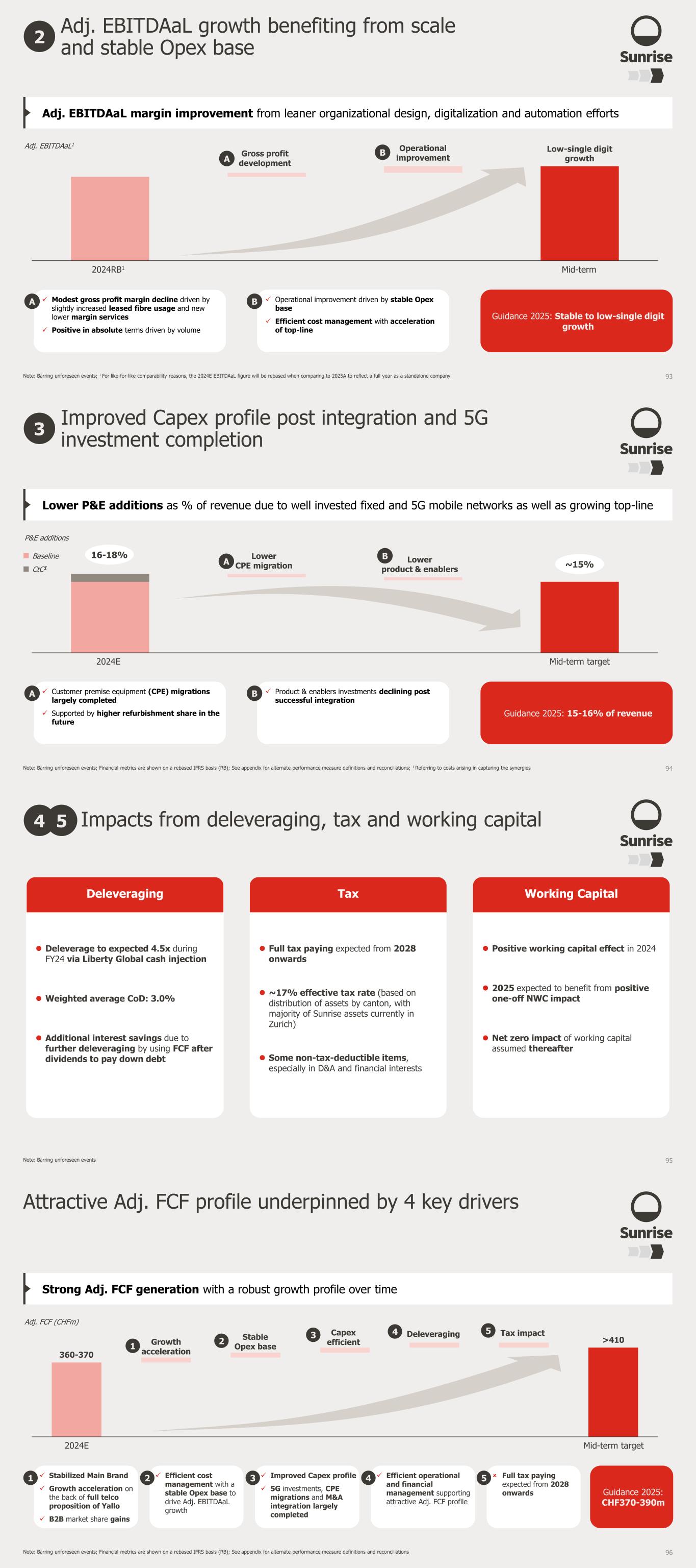 93 ✓ Modest gross profit margin decline driven by slightly increased leased fibre usage and new lower margin services ✓ Positive in absolute terms driven by volume ✓ Operational improvement driven by stable Opex base ✓ Efficient cost management with acceleration of top-line Adj. EBITDAaL growth benefiting from scale and stable Opex base Gross profit development Low-single digit growth Operational improvement 2 Adj. EBITDAaL margin improvement from leaner organizational design, digitalization and automation efforts 2024RB1 Mid-term Guidance 2025: Stable to low-single digit growth Note: Barring unforeseen events; 1 For like-for-like comparability reasons, the 2024E EBITDAaL figure will be rebased when comparing to 2025A to reflect a full year as a standalone company A B Adj. EBITDAaL1 A B 94Note: Barring unforeseen events; Financial metrics are shown on a rebased IFRS basis (RB); See appendix for alternate performance measure definitions and reconciliations; 1 Referring to costs arising in capturing the synergies 16-18% ~15% Lower CPE migration Lower product & enablers Lower P&E additions as % of revenue due to well invested fixed and 5G mobile networks as well as growing top-line 2024E ✓ Product & enablers investments declining post successful integration ✓ Customer premise equipment (CPE) migrations largely completed ✓ Supported by higher refurbishment share in the future Mid-term target Guidance 2025: 15-16% of revenue Improved Capex profile post integration and 5G investment completion 3 P&E additions A B A B Baseline CtC1 95 Impacts from deleveraging, tax and working capital4 ⚫ Deleverage to expected 4.5x during FY24 via Liberty Global cash injection ⚫ Weighted average CoD: 3.0% ⚫ Additional interest savings due to further deleveraging by using FCF after dividends to pay down debt Deleveraging ⚫ Full tax paying expected from 2028 onwards ⚫ ~17% effective tax rate (based on distribution of assets by canton, with majority of Sunrise assets currently in Zurich) ⚫ Some non-tax-deductible items, especially in D&A and financial interests Tax ⚫ Positive working capital effect in 2024 ⚫ 2025 expected to benefit from positive one-off NWC impact ⚫ Net zero impact of working capital assumed thereafter Working Capital Note: Barring unforeseen events 5 96 360-370 >410Growth acceleration Stable Opex base DeleveragingCapex efficient Attractive Adj. FCF profile underpinned by 4 key drivers Strong Adj. FCF generation with a robust growth profile over time 2024E Mid-term target ✓ Stabilized Main Brand ✓ Growth acceleration on the back of full telco proposition of Yallo ✓ B2B market share gains ✓ Efficient cost management with a stable Opex base to drive Adj. EBITDAaL growth ✓ Improved Capex profile ✓ 5G investments, CPE migrations and M&A integration largely completed ✓ Efficient operational and financial management supporting attractive Adj. FCF profile Guidance 2025: CHF370-390m 1 2 2 3 4 3 Tax impact5 4 Full tax paying expected from 2028 onwards 5 Adj. FCF (CHFm) 1 Note: Barring unforeseen events; Financial metrics are shown on a rebased IFRS basis (RB); See appendix for alternate performance measure definitions and reconciliations