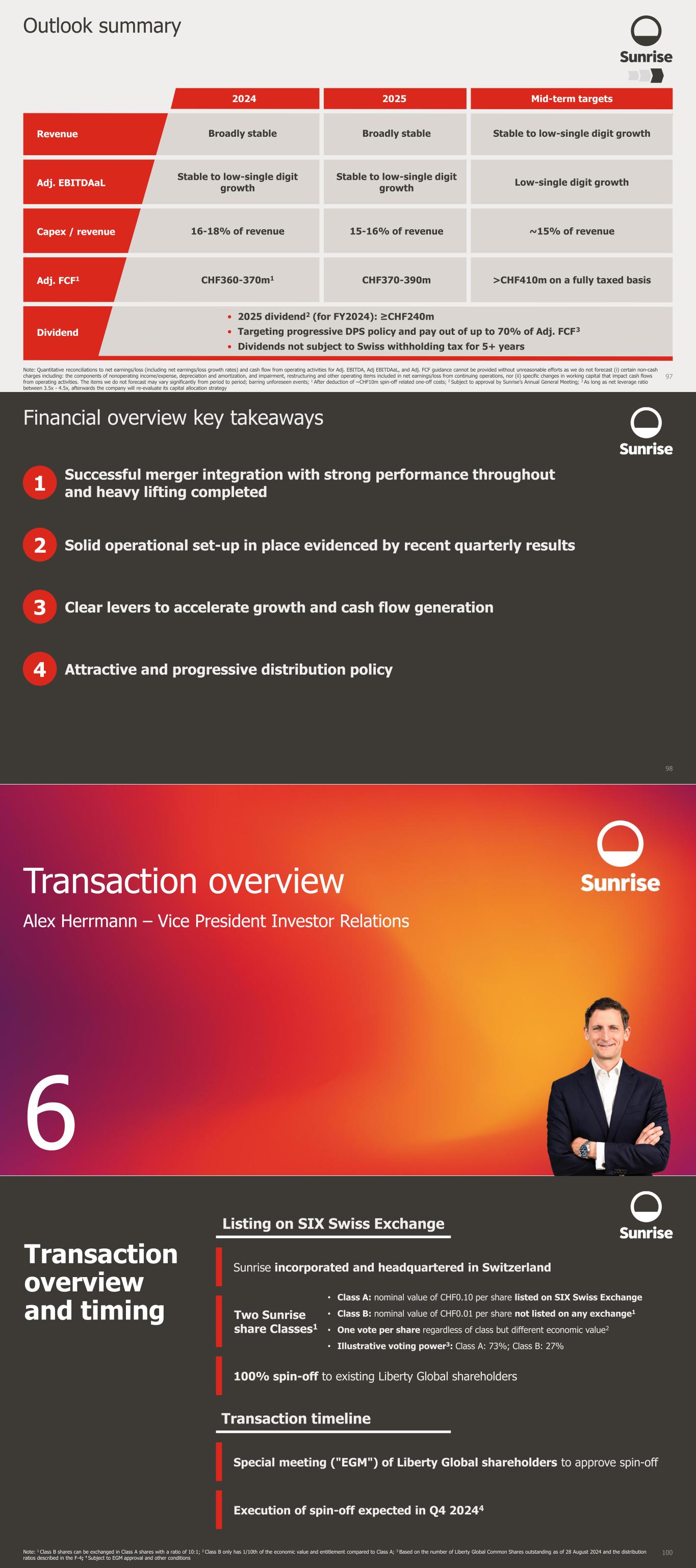 97 Outlook summary Note: Quantitative reconciliations to net earnings/loss (including net earnings/loss growth rates) and cash flow from operating activities for Adj. EBITDA, Adj EBITDAaL, and Adj. FCF guidance cannot be provided without unreasonable efforts as we do not forecast (i) certain non-cash charges including: the components of nonoperating income/expense, depreciation and amortization, and impairment, restructuring and other operating items included in net earnings/loss from continuing operations, nor (ii) specific changes in working capital that impact cash flows from operating activities. The items we do not forecast may vary significantly from period to period; barring unforeseen events; 1 After deduction of ~CHF10m spin-off related one-off costs; 2 Subject to approval by Sunrise’s Annual General Meeting; 3 As long as net leverage ratio between 3.5x - 4.5x, afterwards the company will re-evaluate its capital allocation strategy 16-18% of revenue Stable to low-single digit growth Broadly stable CHF360-370m1 2024 Mid-term targets Revenue Adj. EBITDAaL Capex / revenue Adj. FCF1 Dividend • 2025 dividend2 (for FY2024): ≥CHF240m • Targeting progressive DPS policy and pay out of up to 70% of Adj. FCF3 • Dividends not subject to Swiss withholding tax for 5+ years 15-16% of revenue Stable to low-single digit growth Broadly stable CHF370-390m 2025 ~15% of revenue Low-single digit growth Stable to low-single digit growth >CHF410m on a fully taxed basis 98 Switzerland’s premium and scaled challenger – primed for growth and cash returns Financial overvi w key takeaways Successful merger integration with strong performance throughout and heavy lifting completed Solid operational set-up in place evidenced by recent quarterly results Clear levers to accelerate growth and cash flow generation Attractive and progressive distribution policy 1 2 3 4 Transaction overview Alex Herrmann – Vice President Investor Relations 6 100 Sunrise incorporated and headquartered in Switzerland 100% spin-off to existing Liberty Global shareholders Special meeting ("EGM") of Liberty Global shareholders to approve spin-off Execution of spin-off expected in Q4 20244 Two Sunrise share Classes1 • Class A: nominal value of CHF0.10 per share listed on SIX Swiss Exchange • Class B: nominal value of CHF0.01 per share not listed on any exchange1 • One vote per share regardless of class but different economic value2 • Illustrative voting power3: Class A: 73%; Class B: 27% Transaction overview and timing Note: 1 Class B shares can be exchanged in Class A shares with a ratio of 10:1; 2 Class B only has 1/10th of the economic value and entitlement compared to Class A; 3 Based on the number of Liberty Global Common Shares outstanding as of 28 August 2024 and the distribution ratios described in the F-4; 4 Subject to EGM approval and other conditions Listing on SIX Swiss Exchange Transaction timeline