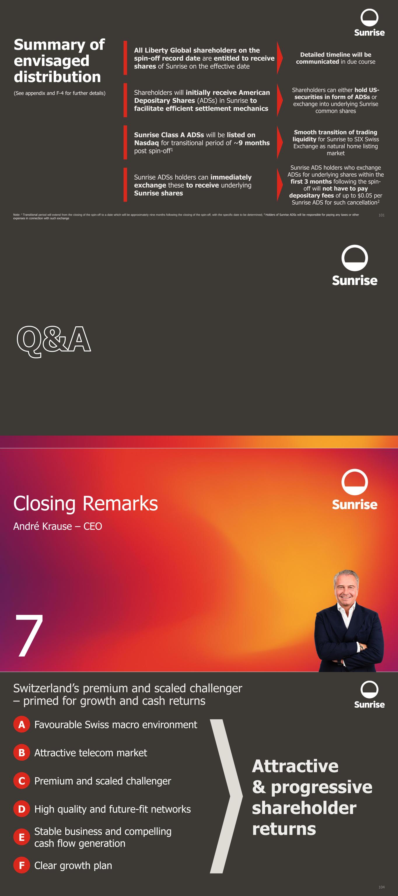 101Note: 1 Transitional period will extend from the closing of the spin-off to a date which will be approximately nine months following the closing of the spin-off, with the specific date to be determined; 2 Holders of Sunrise ADSs will be responsible for paying any taxes or other expenses in connection with such exchange Summary of envisaged distribution Shareholders will initially receive American Depositary Shares (ADSs) in Sunrise to facilitate efficient settlement mechanics Shareholders can either hold US- securities in form of ADSs or exchange into underlying Sunrise common shares Sunrise Class A ADSs will be listed on Nasdaq for transitional period of ~9 months post spin-off1 Smooth transition of trading liquidity for Sunrise to SIX Swiss Exchange as natural home listing market Sunrise ADSs holders can immediately exchange these to receive underlying Sunrise shares Sunrise ADS holders who exchange ADSs for underlying shares within the first 3 months following the spin- off will not have to pay depositary fees of up to $0.05 per Sunrise ADS for such cancellation2 (See appendix and F-4 for further details) All Liberty Global shareholders on the spin-off record date are entitled to receive shares of Sunrise on the effective date Detailed timeline will be communicated in due course 102 Q&A Closing Remarks André Krause – CEO 7 104 Switzerland’s premium and scaled challenger – primed for growth and cash returns it rl ’ r i l ll r ri f r r t r t r A B C D E F Favourable Swiss macro environment Attractive & progressive shareholder returns Attractive telecom market Premium and scaled challenger High quality and future-fit networks Stable business and compelling cash flow generation Clear growth plan