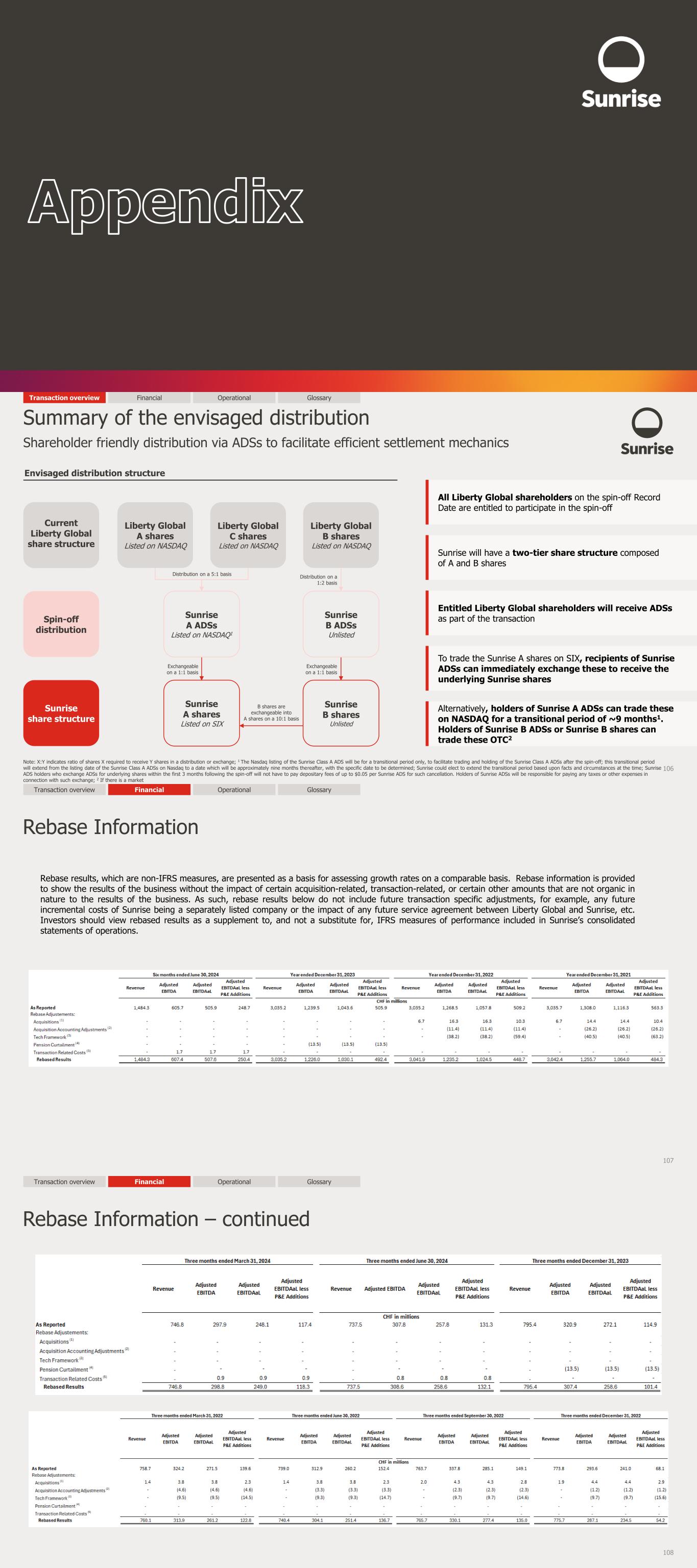 105 Appendix 106 Summary of the envisaged distribution Shareholder friendly distribution via ADSs to facilitate efficient settlement mechanics Note: X:Y indicates ratio of shares X required to receive Y shares in a distribution or exchange; 1 The Nasdaq listing of the Sunrise Class A ADS will be for a transitional period only, to facilitate trading and holding of the Sunrise Class A ADSs after the spin-off; this transitional period will extend from the listing date of the Sunrise Class A ADSs on Nasdaq to a date which will be approximately nine months thereafter, with the specific date to be determined; Sunrise could elect to extend the transitional period based upon facts and circumstances at the time; Sunrise ADS holders who exchange ADSs for underlying shares within the first 3 months following the spin-off will not have to pay depositary fees of up to $0.05 per Sunrise ADS for such cancellation. Holders of Sunrise ADSs will be responsible for paying any taxes or other expenses in connection with such exchange; 2 If there is a market All Liberty Global shareholders on the spin-off Record Date are entitled to participate in the spin-off Sunrise will have a two-tier share structure composed of A and B shares Entitled Liberty Global shareholders will receive ADSs as part of the transaction To trade the Sunrise A shares on SIX, recipients of Sunrise ADSs can immediately exchange these to receive the underlying Sunrise shares Alternatively, holders of Sunrise A ADSs can trade these on NASDAQ for a transitional period of ~9 months1. Holders of Sunrise B ADSs or Sunrise B shares can trade these OTC2 Current Liberty Global share structure Liberty Global A shares Listed on NASDAQ Liberty Global C shares Listed on NASDAQ Liberty Global B shares Listed on NASDAQ Spin-off distribution Sunrise A ADSs Listed on NASDAQ1 Sunrise B ADSs Unlisted Sunrise share structure Sunrise A shares Listed on SIX Sunrise B shares Unlisted Distribution on a 5:1 basis Distribution on a 1:2 basis B shares are exchangeable into A shares on a 10:1 basis Exchangeable on a 1:1 basis Exchangeable on a 1:1 basis Envisaged distribution structure Transaction overview Financial Operational Glossary 107 Rebase Information Rebase results, which are non-IFRS measures, are presented as a basis for assessing growth rates on a comparable basis. Rebase information is provided to show the results of the business without the impact of certain acquisition-related, transaction-related, or certain other amounts that are not organic in nature to the results of the business. As such, rebase results below do not include future transaction specific adjustments, for example, any future incremental costs of Sunrise being a separately listed company or the impact of any future service agreement between Liberty Global and Sunrise, etc. Investors should view rebased results as a supplement to, and not a substitute for, IFRS measures of performance included in Sunrise’s consolidated statements of operations. Transaction overview Financial Operational Glossary 108 Rebase Information – continued Transaction overview Financial Operational Glossary