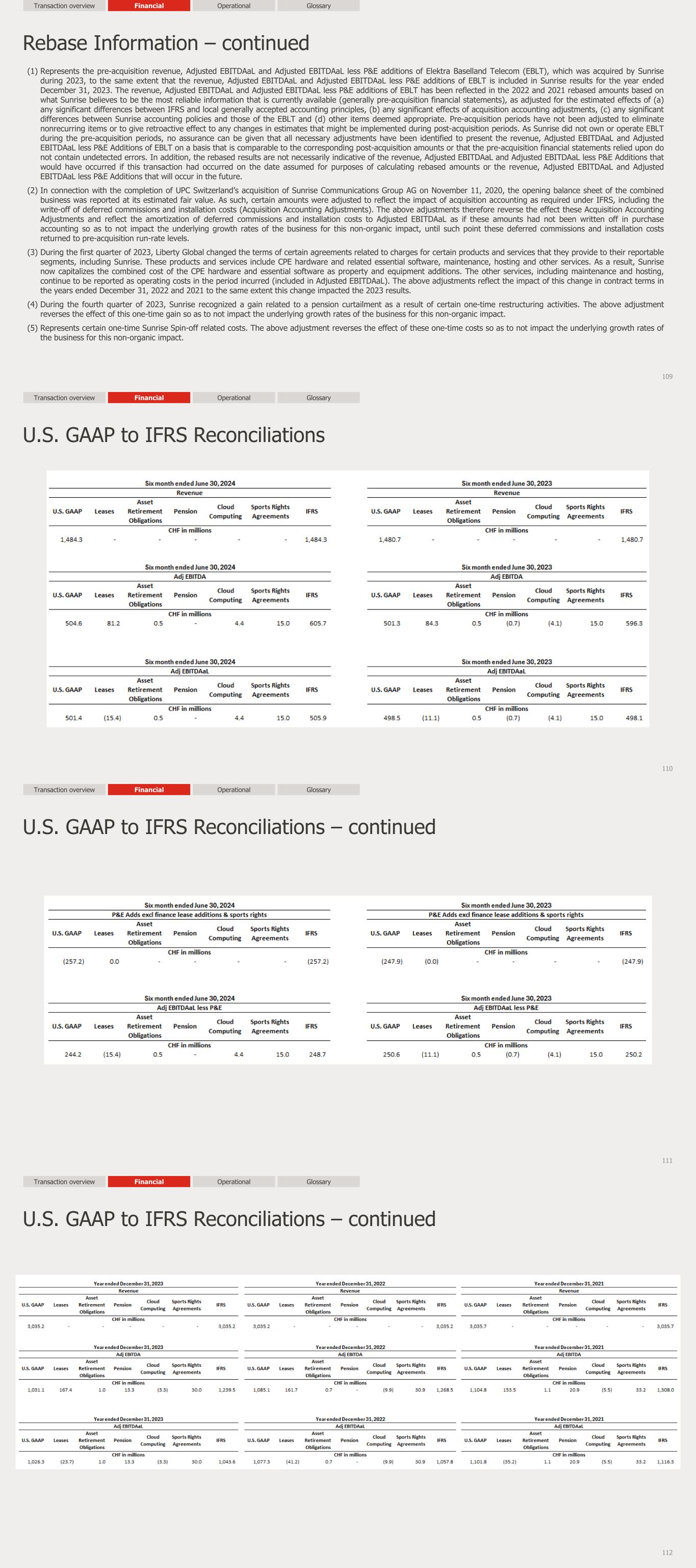 109 Rebase Information – continued (1) Represents the pre-acquisition revenue, Adjusted EBITDAaL and Adjusted EBITDAaL less P&E additions of Elektra Baselland Telecom (EBLT), which was acquired by Sunrise during 2023, to the same extent that the revenue, Adjusted EBITDAaL and Adjusted EBITDAaL less P&E additions of EBLT is included in Sunrise results for the year ended December 31, 2023. The revenue, Adjusted EBITDAaL and Adjusted EBITDAaL less P&E additions of EBLT has been reflected in the 2022 and 2021 rebased amounts based on what Sunrise believes to be the most reliable information that is currently available (generally pre-acquisition financial statements), as adjusted for the estimated effects of (a) any significant differences between IFRS and local generally accepted accounting principles, (b) any significant effects of acquisition accounting adjustments, (c) any significant differences between Sunrise accounting policies and those of the EBLT and (d) other items deemed appropriate. Pre-acquisition periods have not been adjusted to eliminate nonrecurring items or to give retroactive effect to any changes in estimates that might be implemented during post-acquisition periods. As Sunrise did not own or operate EBLT during the pre-acquisition periods, no assurance can be given that all necessary adjustments have been identified to present the revenue, Adjusted EBITDAaL and Adjusted EBITDAaL less P&E Additions of EBLT on a basis that is comparable to the corresponding post-acquisition amounts or that the pre-acquisition financial statements relied upon do not contain undetected errors. In addition, the rebased results are not necessarily indicative of the revenue, Adjusted EBITDAaL and Adjusted EBITDAaL less P&E Additions that would have occurred if this transaction had occurred on the date assumed for purposes of calculating rebased amounts or the revenue, Adjusted EBITDAaL and Adjusted EBITDAaL less P&E Additions that will occur in the future. (2) In connection with the completion of UPC Switzerland’s acquisition of Sunrise Communications Group AG on November 11, 2020, the opening balance sheet of the combined business was reported at its estimated fair value. As such, certain amounts were adjusted to reflect the impact of acquisition accounting as required under IFRS, including the write-off of deferred commissions and installation costs (Acquisition Accounting Adjustments). The above adjustments therefore reverse the effect these Acquisition Accounting Adjustments and reflect the amortization of deferred commissions and installation costs to Adjusted EBITDAaL as if these amounts had not been written off in purchase accounting so as to not impact the underlying growth rates of the business for this non-organic impact, until such point these deferred commissions and installation costs returned to pre-acquisition run-rate levels. (3) During the first quarter of 2023, Liberty Global changed the terms of certain agreements related to charges for certain products and services that they provide to their reportable segments, including Sunrise. These products and services include CPE hardware and related essential software, maintenance, hosting and other services. As a result, Sunrise now capitalizes the combined cost of the CPE hardware and essential software as property and equipment additions. The other services, including maintenance and hosting, continue to be reported as operating costs in the period incurred (included in Adjusted EBITDAaL). The above adjustments reflect the impact of this change in contract terms in the years ended December 31, 2022 and 2021 to the same extent this change impacted the 2023 results. (4) During the fourth quarter of 2023, Sunrise recognized a gain related to a pension curtailment as a result of certain one-time restructuring activities. The above adjustment reverses the effect of this one-time gain so as to not impact the underlying growth rates of the business for this non-organic impact. (5) Represents certain one-time Sunrise Spin-off related costs. The above adjustment reverses the effect of these one-time costs so as to not impact the underlying growth rates of the business for this non-organic impact. Transaction overview Financial Operational Glossary 110 U.S. GAAP to IFRS Reconciliations Transaction overview Financial Operational Glossary 111 U.S. GAAP to IFRS Reconciliations – continued Transaction overview Financial Operational Glossary 112 U.S. GAAP to IFRS Reconciliations – continued Transaction overview Financial Operational Glossary