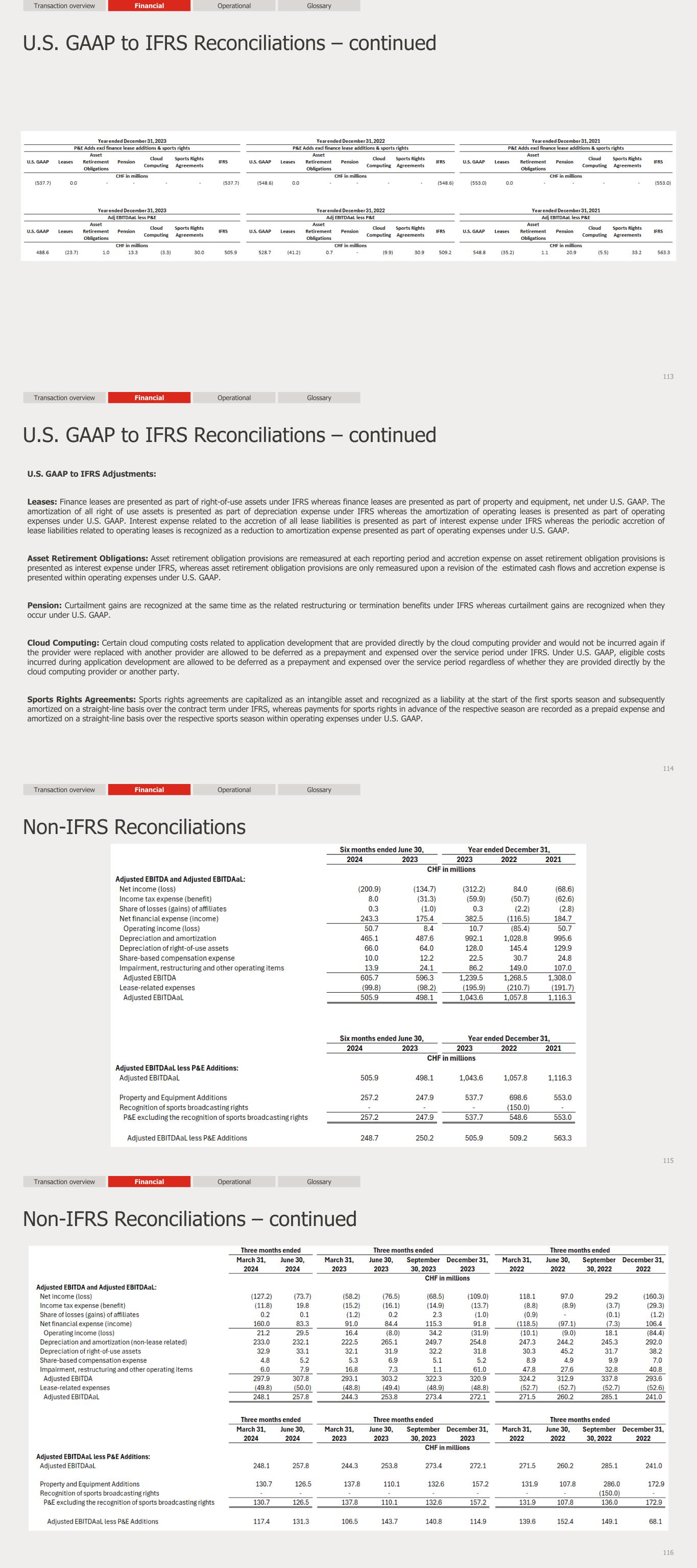 113 U.S. GAAP to IFRS Reconciliations – continued Transaction overview Financial Operational Glossary 114 U.S. GAAP to IFRS Reconciliations – continued U.S. GAAP to IFRS Adjustments: Leases: Finance leases are presented as part of right-of-use assets under IFRS whereas finance leases are presented as part of property and equipment, net under U.S. GAAP. The amortization of all right of use assets is presented as part of depreciation expense under IFRS whereas the amortization of operating leases is presented as part of operating expenses under U.S. GAAP. Interest expense related to the accretion of all lease liabilities is presented as part of interest expense under IFRS whereas the periodic accretion of lease liabilities related to operating leases is recognized as a reduction to amortization expense presented as part of operating expenses under U.S. GAAP. Asset Retirement Obligations: Asset retirement obligation provisions are remeasured at each reporting period and accretion expense on asset retirement obligation provisions is presented as interest expense under IFRS, whereas asset retirement obligation provisions are only remeasured upon a revision of the estimated cash flows and accretion expense is presented within operating expenses under U.S. GAAP. Pension: Curtailment gains are recognized at the same time as the related restructuring or termination benefits under IFRS whereas curtailment gains are recognized when they occur under U.S. GAAP. Cloud Computing: Certain cloud computing costs related to application development that are provided directly by the cloud computing provider and would not be incurred again if the provider were replaced with another provider are allowed to be deferred as a prepayment and expensed over the service period under IFRS. Under U.S. GAAP, eligible costs incurred during application development are allowed to be deferred as a prepayment and expensed over the service period regardless of whether they are provided directly by the cloud computing provider or another party. Sports Rights Agreements: Sports rights agreements are capitalized as an intangible asset and recognized as a liability at the start of the first sports season and subsequently amortized on a straight-line basis over the contract term under IFRS, whereas payments for sports rights in advance of the respective season are recorded as a prepaid expense and amortized on a straight-line basis over the respective sports season within operating expenses under U.S. GAAP. Transaction overview Financial Operational Glossary 115 Non-IFRS Reconciliations Transaction overview Financial Operational Glossary 116 Non-IFRS Reconciliations – continued Transaction overview Financial Operational Glossary