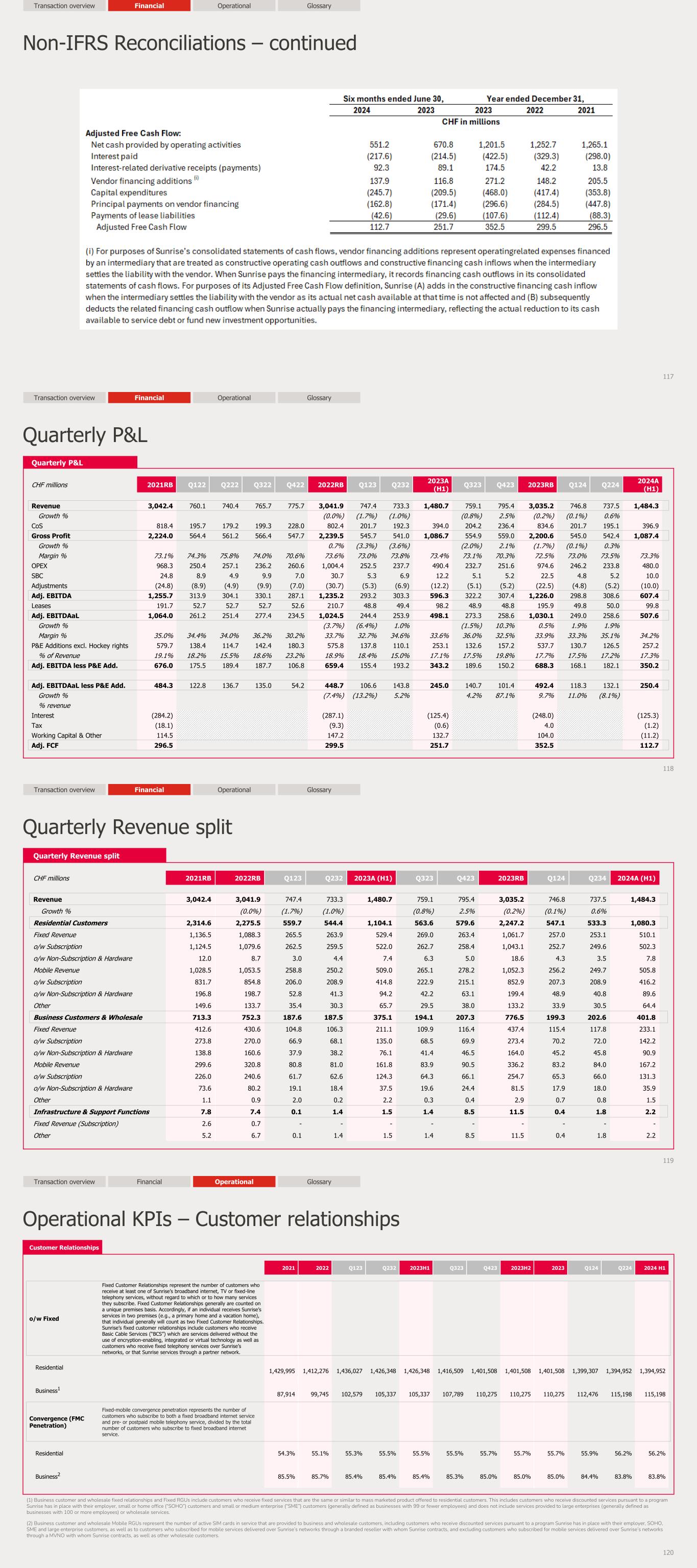 117 Non-IFRS Reconciliations – continued Transaction overview Financial Operational Glossary 118 Quarterly P&L Quarterly P&L CHF millions 2021RB Q122 Q222 Q322 Q422 2022RB Q123 Q232 2023A (H1) Q323 Q423 2023RB Q124 Q224 2024A (H1) Revenue 3,042.4 760.1 740.4 765.7 775.7 3,041.9 747.4 733.3 1,480.7 759.1 795.4 3,035.2 746.8 737.5 1,484.3 Growth % (0.0%) (1.7%) (1.0%) (0.8%) 2.5% (0.2%) (0.1%) 0.6% CoS 818.4 195.7 179.2 199.3 228.0 802.4 201.7 192.3 394.0 204.2 236.4 834.6 201.7 195.1 396.9 Gross Profit 2,224.0 564.4 561.2 566.4 547.7 2,239.5 545.7 541.0 1,086.7 554.9 559.0 2,200.6 545.0 542.4 1,087.4 Growth % 0.7% (3.3%) (3.6%) (2.0%) 2.1% (1.7%) (0.1%) 0.3% Margin % 73.1% 74.3% 75.8% 74.0% 70.6% 73.6% 73.0% 73.8% 73.4% 73.1% 70.3% 72.5% 73.0% 73.5% 73.3% OPEX 968.3 250.4 257.1 236.2 260.6 1,004.4 252.5 237.7 490.4 232.7 251.6 974.6 246.2 233.8 480.0 SBC 24.8 8.9 4.9 9.9 7.0 30.7 5.3 6.9 12.2 5.1 5.2 22.5 4.8 5.2 10.0 Adjustments (24.8) (8.9) (4.9) (9.9) (7.0) (30.7) (5.3) (6.9) (12.2) (5.1) (5.2) (22.5) (4.8) (5.2) (10.0) Adj. EBITDA 1,255.7 313.9 304.1 330.1 287.1 1,235.2 293.2 303.3 596.3 322.2 307.4 1,226.0 298.8 308.6 607.4 Leases 191.7 52.7 52.7 52.7 52.6 210.7 48.8 49.4 98.2 48.9 48.8 195.9 49.8 50.0 99.8 Adj. EBITDAaL 1,064.0 261.2 251.4 277.4 234.5 1,024.5 244.4 253.9 498.1 273.3 258.6 1,030.1 249.0 258.6 507.6 Growth % (3.7%) (6.4%) 1.0% (1.5%) 10.3% 0.5% 1.9% 1.9% Margin % 35.0% 34.4% 34.0% 36.2% 30.2% 33.7% 32.7% 34.6% 33.6% 36.0% 32.5% 33.9% 33.3% 35.1% 34.2% P&E Additions excl. Hockey rights 579.7 138.4 114.7 142.4 180.3 575.8 137.8 110.1 253.1 132.6 157.2 537.7 130.7 126.5 257.2 % of Revenue 19.1% 18.2% 15.5% 18.6% 23.2% 18.9% 18.4% 15.0% 17.1% 17.5% 19.8% 17.7% 17.5% 17.2% 17.3% Adj. EBITDA less P&E Add. 676.0 175.5 189.4 187.7 106.8 659.4 155.4 193.2 343.2 189.6 150.2 688.3 168.1 182.1 350.2 Adj. EBITDAaL less P&E Add. 484.3 122.8 136.7 135.0 54.2 448.7 106.6 143.8 245.0 140.7 101.4 492.4 118.3 132.1 250.4 Growth % (7.4%) (13.2%) 5.2% 4.2% 87.1% 9.7% 11.0% (8.1%) % revenue Interest (284.2) (287.1) (125.4) (248.0) (125.3) Tax (18.1) (9.3) (0.6) 4.0 (1.2) Working Capital & Other 114.5 147.2 132.7 104.0 (11.2) Adj. FCF 296.5 299.5 251.7 352.5 112.7 Transaction overview Financial Operational Glossary 119 Quarterly Revenue split Quarterly Revenue split CHF millions 2021RB 2022RB Q123 Q232 2023A (H1) Q323 Q423 2023RB Q124 Q234 2024A (H1) Revenue 3,042.4 3,041.9 747.4 733.3 1,480.7 759.1 795.4 3,035.2 746.8 737.5 1,484.3 Growth % (0.0%) (1.7%) (1.0%) (0.8%) 2.5% (0.2%) (0.1%) 0.6% Residential Customers 2,314.6 2,275.5 559.7 544.4 1,104.1 563.6 579.6 2,247.2 547.1 533.3 1,080.3 Fixed Revenue 1,136.5 1,088.3 265.5 263.9 529.4 269.0 263.4 1,061.7 257.0 253.1 510.1 o/w Subscription 1,124.5 1,079.6 262.5 259.5 522.0 262.7 258.4 1,043.1 252.7 249.6 502.3 o/w Non-Subscription & Hardware 12.0 8.7 3.0 4.4 7.4 6.3 5.0 18.6 4.3 3.5 7.8 Mobile Revenue 1,028.5 1,053.5 258.8 250.2 509.0 265.1 278.2 1,052.3 256.2 249.7 505.8 o/w Subscription 831.7 854.8 206.0 208.9 414.8 222.9 215.1 852.9 207.3 208.9 416.2 o/w Non-Subscription & Hardware 196.8 198.7 52.8 41.3 94.2 42.2 63.1 199.4 48.9 40.8 89.6 Other 149.6 133.7 35.4 30.3 65.7 29.5 38.0 133.2 33.9 30.5 64.4 Business Customers & Wholesale 713.3 752.3 187.6 187.5 375.1 194.1 207.3 776.5 199.3 202.6 401.8 Fixed Revenue 412.6 430.6 104.8 106.3 211.1 109.9 116.4 437.4 115.4 117.8 233.1 o/w Subscription 273.8 270.0 66.9 68.1 135.0 68.5 69.9 273.4 70.2 72.0 142.2 o/w Non-Subscription & Hardware 138.8 160.6 37.9 38.2 76.1 41.4 46.5 164.0 45.2 45.8 90.9 Mobile Revenue 299.6 320.8 80.8 81.0 161.8 83.9 90.5 336.2 83.2 84.0 167.2 o/w Subscription 226.0 240.6 61.7 62.6 124.3 64.3 66.1 254.7 65.3 66.0 131.3 o/w Non-Subscription & Hardware 73.6 80.2 19.1 18.4 37.5 19.6 24.4 81.5 17.9 18.0 35.9 Other 1.1 0.9 2.0 0.2 2.2 0.3 0.4 2.9 0.7 0.8 1.5 Infrastructure & Support Functions 7.8 7.4 0.1 1.4 1.5 1.4 8.5 11.5 0.4 1.8 2.2 Fixed Revenue (Subscription) 2.6 0.7 - - - - - - - - - Other 5.2 6.7 0.1 1.4 1.5 1.4 8.5 11.5 0.4 1.8 2.2 Transaction overview Financial Operational Glossary 120 Operational KPIs – Customer relationships Transaction overview Financial Operational Customer Relationships 2021 2022 Q123 Q232 2023H1 Q323 Q423 2023H2 2023 Q124 Q224 2024 H1 o/w Fixed Fixed Customer Relationships represent the number of customers who receive at least one of Sunrise’s broadband internet, TV or fixed-line telephony services, without regard to which or to how many services they subscribe. Fixed Customer Relationships generally are counted on a unique premises basis. Accordingly, if an individual receives Sunrise’s services in two premises (e.g., a primary home and a vacation home), that individual generally will count as two Fixed Customer Relationships. Sunrise’s fixed customer relationships include customers who receive Basic Cable Services (“BCS”) which are services delivered without the use of encryption-enabling, integrated or virtual technology as well as customers who receive fixed telephony services over Sunrise’s networks, or that Sunrise services through a partner network. Residential 1,429,995 1,412,276 1,436,027 1,426,348 1,426,348 1,416,509 1,401,508 1,401,508 1,401,508 1,399,307 1,394,952 1,394,952 Business1 87,914 99,745 102,579 105,337 105,337 107,789 110,275 110,275 110,275 112,476 115,198 115,198 Convergence (FMC Penetration) Fixed-mobile convergence penetration represents the number of customers who subscribe to both a fixed broadband internet service and pre- or postpaid mobile telephony service, divided by the total number of customers who subscribe to fixed broadband internet service. Residential 54.3% 55.1% 55.3% 55.5% 55.5% 55.5% 55.7% 55.7% 55.7% 55.9% 56.2% 56.2% Business2 85.5% 85.7% 85.4% 85.4% 85.4% 85.3% 85.0% 85.0% 85.0% 84.4% 83.8% 83.8% (1) Business customer and wholesale fixed relationships and Fixed RGUs include customers who receive fixed services that are the same or similar to mass marketed product offered to resid