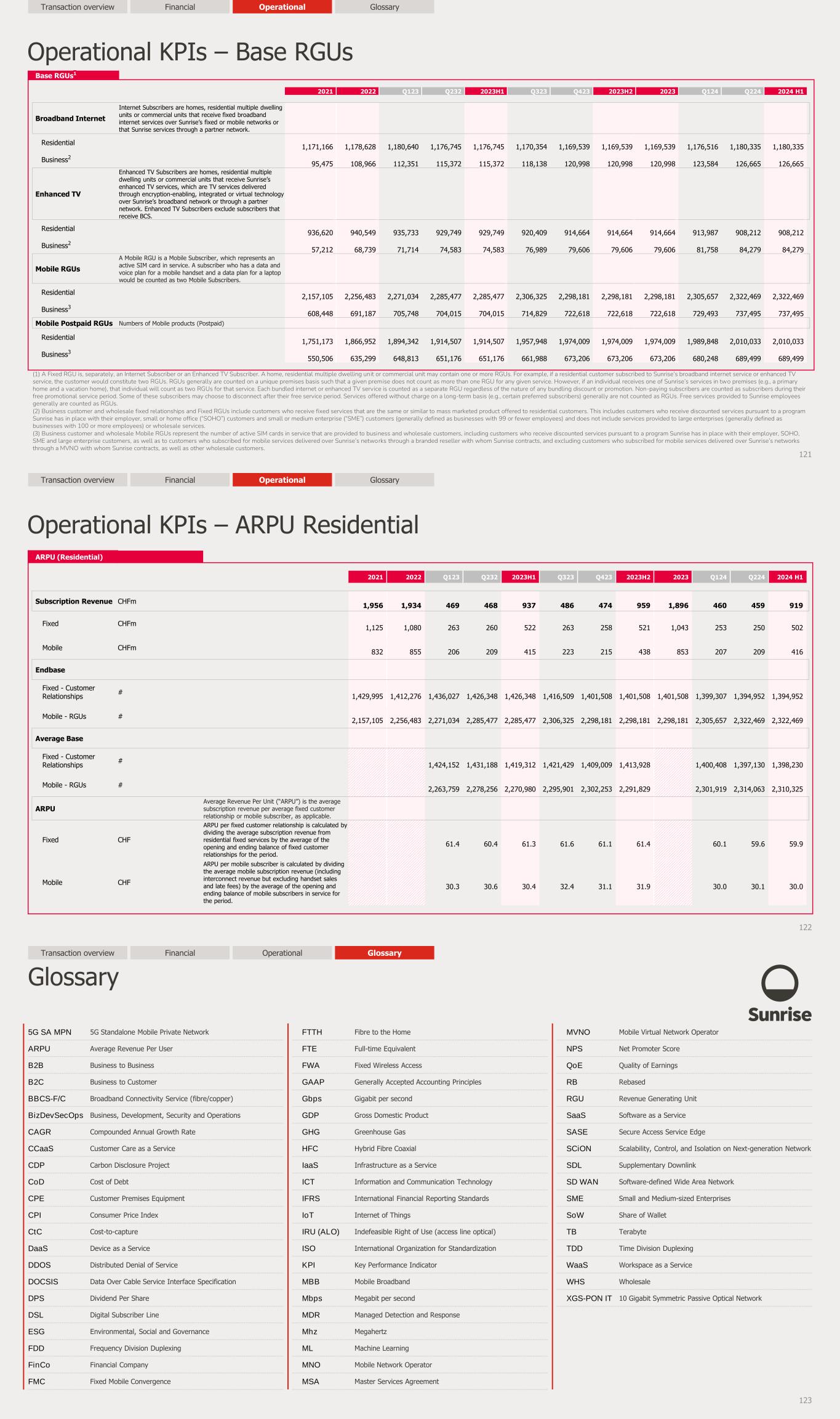 121 Operational KPIs – Base RGUs Transaction overview Financial Operational Glossary Base RGUs1 2021 2022 Q123 Q232 2023H1 Q323 Q423 2023H2 2023 Q124 Q224 2024 H1 Broadband Internet Internet Subscribers are homes, residential multiple dwelling units or commercial units that receive fixed broadband internet services over Sunrise’s fixed or mobile networks or that Sunrise services through a partner network. Residential 1,171,166 1,178,628 1,180,640 1,176,745 1,176,745 1,170,354 1,169,539 1,169,539 1,169,539 1,176,516 1,180,335 1,180,335 Business2 95,475 108,966 112,351 115,372 115,372 118,138 120,998 120,998 120,998 123,584 126,665 126,665 Enhanced TV Enhanced TV Subscribers are homes, residential multiple dwelling units or commercial units that receive Sunrise’s enhanced TV services, which are TV services delivered through encryption-enabling, integrated or virtual technology over Sunrise’s broadband network or through a partner network. Enhanced TV Subscribers exclude subscribers that receive BCS. Residential 936,620 940,549 935,733 929,749 929,749 920,409 914,664 914,664 914,664 913,987 908,212 908,212 Business2 57,212 68,739 71,714 74,583 74,583 76,989 79,606 79,606 79,606 81,758 84,279 84,279 Mobile RGUs A Mobile RGU is a Mobile Subscriber, which represents an active SIM card in service. A subscriber who has a data and voice plan for a mobile handset and a data plan for a laptop would be counted as two Mobile Subscribers. Residential 2,157,105 2,256,483 2,271,034 2,285,477 2,285,477 2,306,325 2,298,181 2,298,181 2,298,181 2,305,657 2,322,469 2,322,469 Business3 608,448 691,187 705,748 704,015 704,015 714,829 722,618 722,618 722,618 729,493 737,495 737,495 Mobile Postpaid RGUs Numbers of Mobile products (Postpaid) Residential 1,751,173 1,866,952 1,894,342 1,914,507 1,914,507 1,957,948 1,974,009 1,974,009 1,974,009 1,989,848 2,010,033 2,010,033 Business3 550,506 635,299 648,813 651,176 651,176 661,988 673,206 673,206 673,206 680,248 689,499 689,499 (1) A Fixed RGU is, separately, an Internet Subscriber or an Enhanced TV Subscriber. A home, residential multiple dwelling unit or commercial unit may contain one or more RGUs. For example, if a residential customer subscribed to Sunrise’s broadband internet service or enhanced TV service, the customer would constitute two RGUs. RGUs generally are counted on a unique premises basis such that a given premise does not count as more than one RGU for any given service. However, if an individual receives one of Sunrise’s services in two premises (e.g., a primary home and a vacation home), that individual will count as two RGUs for that service. Each bundled internet or enhanced TV service is counted as a separate RGU regardless of the nature of any bundling discount or promotion. Non-paying subscribers are counted as subscribers during their free promotional service period. Some of these subscribers may choose to disconnect after their free service period. Services offered without charge on a long-term basis (e.g., certain preferred subscribers) generally are not counted as RGUs. Free services provided to Sunrise employees generally are counted as RGUs. (2) Business customer and wholesale fixed relationships and Fixed RGUs include customers who receive fixed services that are the same or similar to mass marketed product offered to residential customers. This includes customers who receive discounted services pursuant to a program Sunrise has in place with their employer, small or home office (“SOHO”) customers and small or medium enterprise (“SME”) customers (generally defined as businesses with 99 or fewer employees) and does not include services provided to large enterprises (generally defined as businesses with 100 or more employees) or wholesale services. (3) Business customer and wholesale Mobile RGUs represent the number of active SIM cards in service that are provided to business and wholesale customers, including customers who receive discounted services pursuant to a program Sunrise has in place with their employer, SOHO, SME and large enterprise customers, as well as to customers who subscribed for mobile services delivered over Sunrise’s networks through a branded reseller with whom Sunrise contracts, and excluding customers who subscribed for mobile services delivered over Sunrise’s networks through a MVNO with whom Sunrise contracts, as well as other wholesale customers. 122 Operational KPIs – ARPU Residential Transaction overview Financial Operational Glossary ARPU (Residential) 2021 2022 Q123 Q232 2023H1 Q323 Q423 2023H2 2023 Q124 Q224 2024 H1 Subscription Revenue CHFm 1,956 1,934 469 468 937 486 474 959 1,896 460 459 919 Fixed CHFm 1,125 1,080 263 260 522 263 258 521 1,043 253 250 502 Mobile CHFm 832 855 206 209 415 223 215 438 853 207 209 416 Endbase Fixed - Customer Relationships # 1,429,995 1,412,276 1,436,027 1,426,348 1,426,348 1,416,509 1,401,508 1,401,508 1,401,508 1,399,307 1,394,952 1,394,952 Mobile - RGUs # 2,157,105 2,256,483 2,271,034 2,285,477 2,285,477 2,306,325 2,298,181 2,298,181 2,298,181 2,305,657 2,322,469 2,322,469 Average Base Fixed - Customer Relationships # 1,424,152 1,431,188 1,419,312 1,421,429 1,409,009 1,413,928 1,400,408 1,397,130 1,398,230 Mobile - RGUs # 2,263,759 2,278,256 2,270,980 2,295,901 2,302,253 2,291,829 2,301,919 2,314,063 2,310,325 ARPU Average Revenue Per Unit (“ARPU”) is the average subscription revenue per average fixed customer relationship or mobile subscriber, as applicable. Fixed CHF ARPU per fixed customer relationship is calculated by dividing the average subscription revenue from residential fixed services by the average of the opening and ending balance of fixed customer relationships for the period. 61.4 60.4 61.3 61.6 61.1 61.4 60.1 59.6 59.9 Mobile CHF ARPU per mobile subscriber is calculated by dividing the average mobile subscription revenue (including interconnect revenue but excluding handset sales and late fees) by the average of the opening a