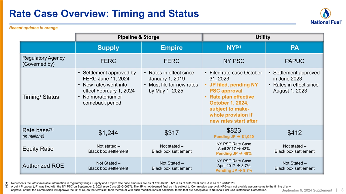 Utility NY Utility Rate Case Status th Joint Proposal Filed September 9 , 2024 – Pending NY PSC Approval ü Filed case on October 31, 2023 requesting base delivery revenue increase of $88.8 million (1) ü Filed a Joint Proposal (JP) with NY PSC on September 9, 2024 for 3-year settlement Rate Case Status ü Rate plan effective October 1, 2024. Start of new rates pending NY PSC approval and Timing ü JP includes standard make-whole language allowing for the recovery of authorized revenues between October 1, 2024 and the start of new rates Rate Case Drivers Requested JP ROE 9.8% 9.7% Equity Ratio 52% 48% Rate Base $1.03B $1.04B Utility ü 3-year revenue requirement increase: RY1 +$57.3M; RY2 +$15.8M; and RY3 +$12.7M Key Ratemaking § Includes amortized recovery of regulatory assets and liabilities (~$13M per year) Items ü Increasing rate base and depreciation expense associated with higher plant in-service § Maintain leak prone pipe replacement target at ~110 miles per year ü Ratemaking mechanisms: § Continuation of: weather normalization; revenue decoupling; industrial 90/10 symmetrical sharing; merchant function charge § New: uncollectible expense tracker; gas safety and customer service performance metrics; customer bill impact levelization (1) A Joint Proposal (JP) was filed with the NY PSC on September 9, 2024 (see Case 23-G-0627). The JP is not deemed final as it is subject to Commission approval. NFG can not provide assurance as to the timing of any approval or that the Commission will approve the JP at all, on the terms set forth therein or with such modifications or additional terms that are acceptable to National Fuel Gas Distribution Corporation. September 9, 2024 Supplement 2