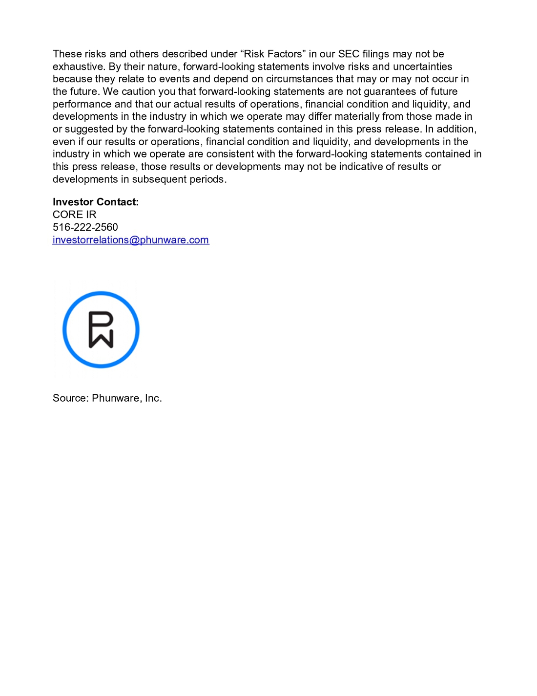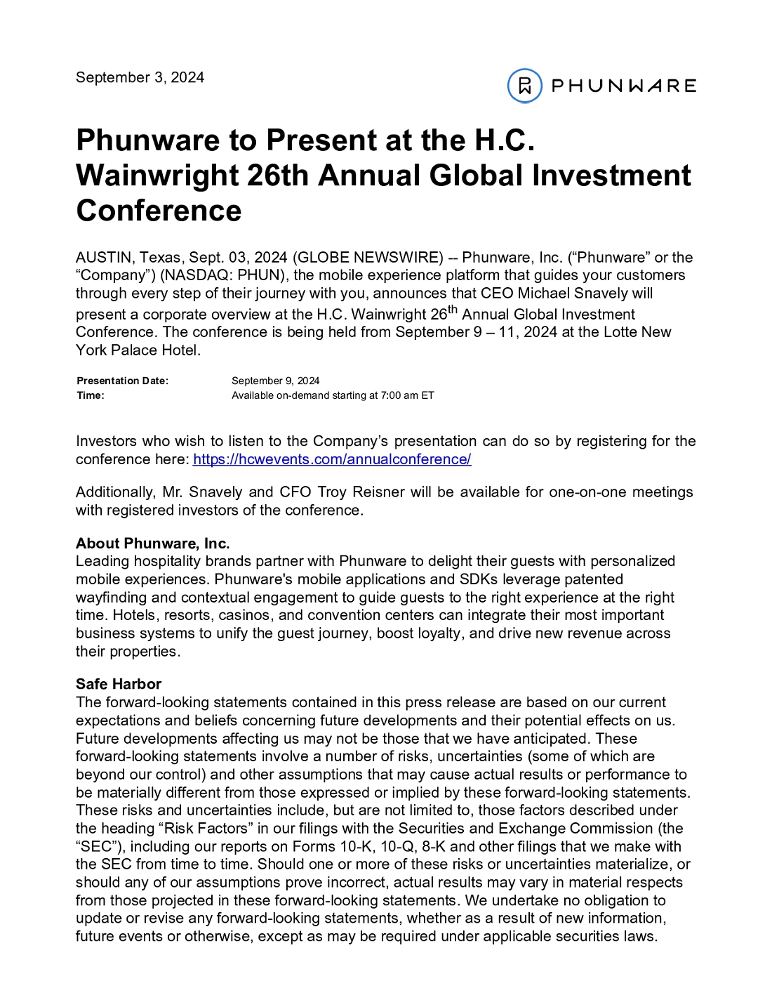 | 99.1* | Press Release dated September 3, 2024, titled “Phunware to Present at H.C. Wainwright 26th Annual Global Investment Conference” | |