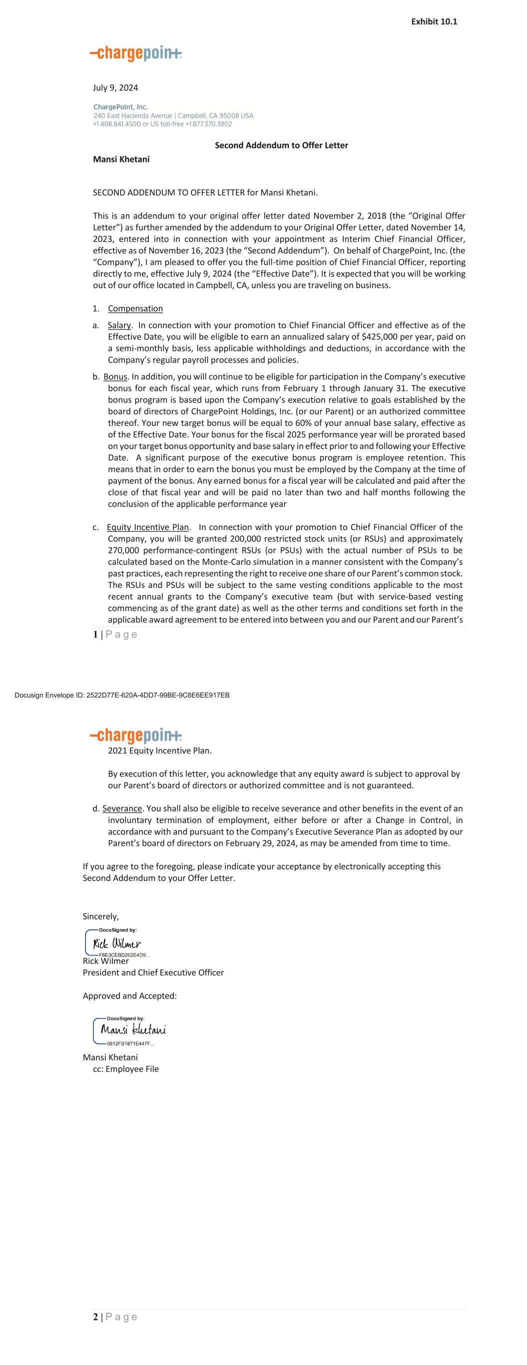 1 | P a g e July 9, 2024 Second Addendum to Offer Letter Mansi Khetani SECOND ADDENDUM TO OFFER LETTER for Mansi Khetani. This is an addendum to your original offer letter dated November 2, 2018 (the “Original Offer Letter”) as further amended by the addendum to your Original Offer Letter, dated November 14, 2023, entered into in connection with your appointment as Interim Chief Financial Officer, effective as of November 16, 2023 (the “Second Addendum”). On behalf of ChargePoint, Inc. (the “Company”), I am pleased to offer you the full-time position of Chief Financial Officer, reporting directly to me, effective July 9, 2024 (the “Effective Date”). It is expected that you will be working out of our office located in Campbell, CA, unless you are traveling on business. 1. Compensation a. Salary. In connection with your promotion to Chief Financial Officer and effective as of the Effective Date, you will be eligible to earn an annualized salary of $425,000 per year, paid on a semi-monthly basis, less applicable withholdings and deductions, in accordance with the Company’s regular payroll processes and policies. b. Bonus. In addition, you will continue to be eligible for participation in the Company’s executive bonus for each fiscal year, which runs from February 1 through January 31. The executive bonus program is based upon the Company’s execution relative to goals established by the board of directors of ChargePoint Holdings, Inc. (or our Parent) or an authorized committee thereof. Your new target bonus will be equal to 60% of your annual base salary, effective as of the Effective Date. Your bonus for the fiscal 2025 performance year will be prorated based on your target bonus opportunity and base salary in effect prior to and following your Effective Date. A significant purpose of the executive bonus program is employee retention. This means that in order to earn the bonus you must be employed by the Company at the time of payment of the bonus. Any earned bonus for a fiscal year will be calculated and paid after the close of that fiscal year and will be paid no later than two and half months following the conclusion of the applicable performance year c. Equity Incentive Plan. In connection with your promotion to Chief Financial Officer of the Company, you will be granted 200,000 restricted stock units (or RSUs) and approximately 270,000 performance-contingent RSUs (or PSUs) with the actual number of PSUs to be calculated based on the Monte-Carlo simulation in a manner consistent with the Company’s past practices, each representing the right to receive one share of our Parent’s common stock. The RSUs and PSUs will be subject to the same vesting conditions applicable to the most recent annual grants to the Company’s executive team (but with service-based vesting commencing as of the grant date) as well as the other terms and conditions set forth in the applicable award agreement to be entered into between you and our Parent and our Parent’s Exhibit 10.1 2 | P a g e 2021 Equity Incentive Plan. By execution of this letter, you acknowledge that any equity award is subject to approval by our Parent’s board of directors or authorized committee and is not guaranteed. d. Severance. You shall also be eligible to receive severance and other benefits in the event of an involuntary termination of employment, either before or after a Change in Control, in accordance with and pursuant to the Company’s Executive Severance Plan as adopted by our Parent’s board of directors on February 29, 2024, as may be amended from time to time. If you agree to the foregoing, please indicate your acceptance by electronically accepting this Second Addendum to your Offer Letter. Sincerely, Rick Wilmer President and Chief Executive Officer Approved and Accepted: Mansi Khetani cc: Employee File