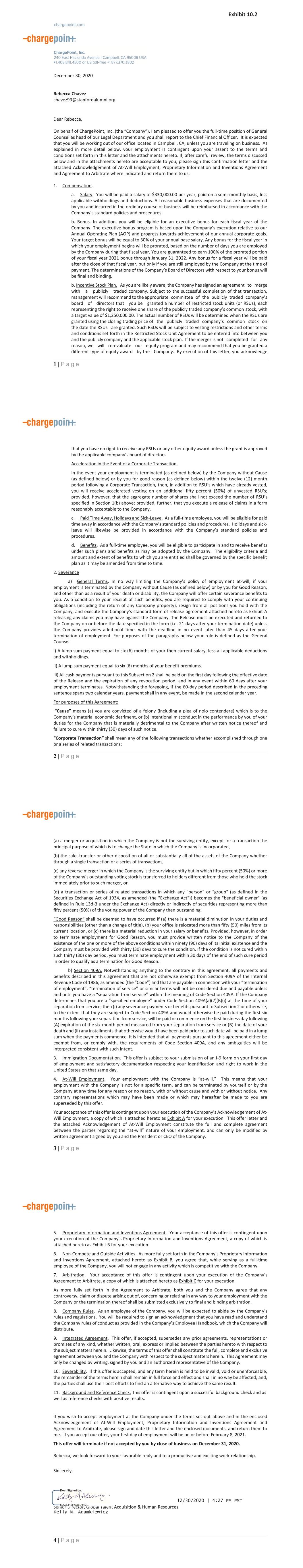 5 | P a g e Approved and Accepted: Rebecca Chavez cc: Employee File 21F-5300-01 Exhibit A ACKNOWLEDGEMENT OF AT-WILL EMPLOYMENT I understand and acknowledge that my employment with ChargePoint, Inc. (the “Company”) is at-will and for no specified term. I understand that I may resign at any time, for any reason or no reason, with or without cause and with or without notice. I further understand and agree that the Company may terminate my employment at any time, for any reason or no reason, with or without cause and with or without notice. I understand and acknowledge that this policy may only be modified in a signed, written document executed by the CEO or President of the Company. Rebecca Chavez