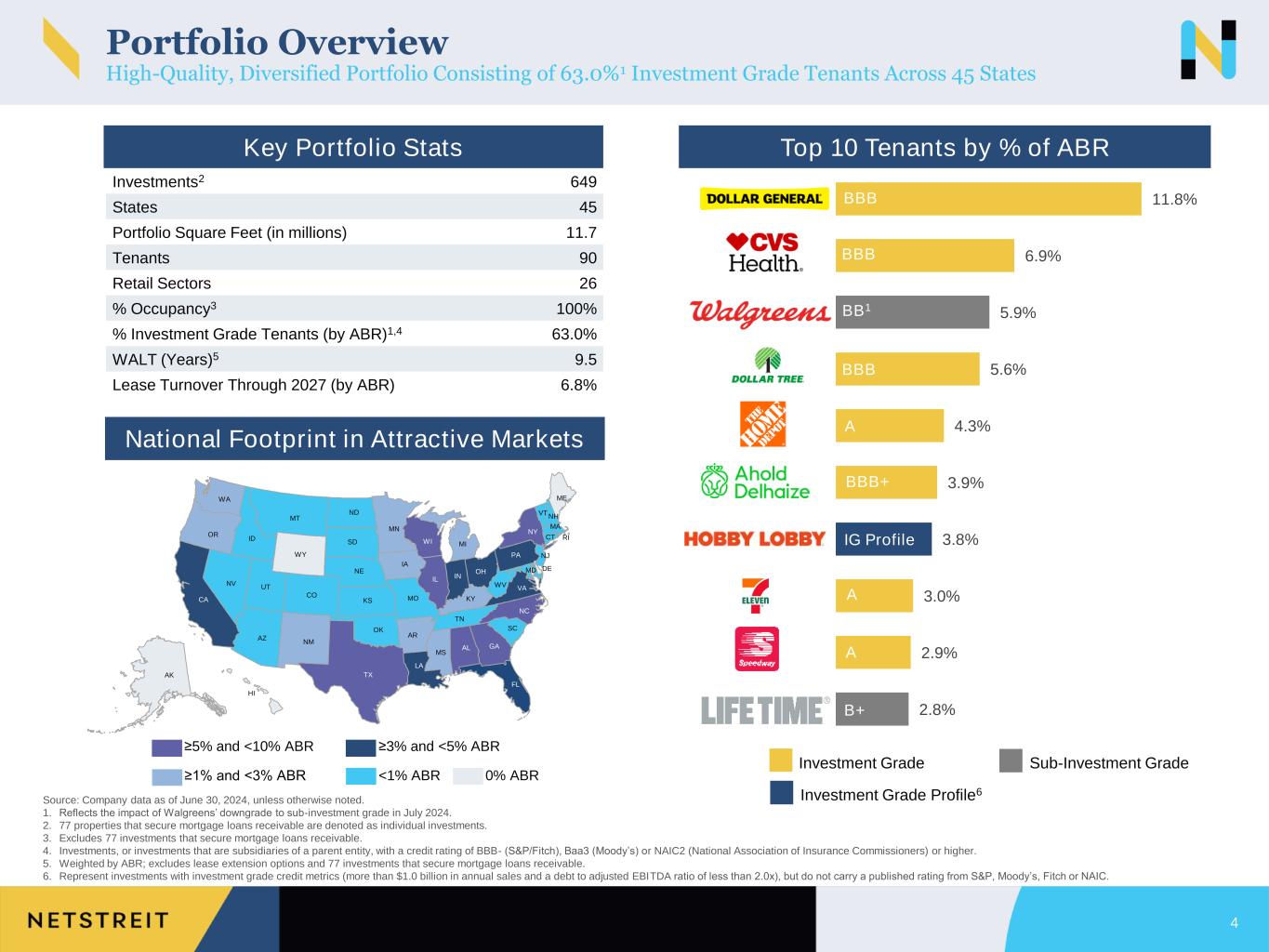 Investment Highlights & Business Update 3 Source: Company data and balance sheet as of June 30, 2024, unless otherwise noted. Figures represent percentage of ABR unless otherwise noted. 1. Reflects the impact of Walgreens’ downgrade to sub-investment grade in July 2024. 2. Represents tenants with investment grade credit metrics (more than $1.0 billion in annual sales and a debt to adjusted EBITDA ratio of less than 2.0x), but do not carry a published rating from S&P, Fitch, Moody's, or NAIC. 3. Reflects 14,766,811 of unsettled forward equity shares at the June 30, 2024, weighted average net settlement price of $17.17 per share. 4. Assumes Company exercises its one-year extension option to further extend maturity to January 2027. 88% Necessity, Discount, and Service-Oriented Tenants 100% Occupancy 100% Rent Collection $569.2 million Total Liquidity3 3.4x Adj. Net Debt3 / Annualized Adj. EBITDAre ✓Focused on growing portfolio with high quality tenants that offer strong credit profiles and provide consistent performance through various economic cycles ✓Proven track record of full occupancy and rent collection; NTST’s two expected Big Lots’ store closures have received strong interest from multiple retailers at or above current rent ✓Long weighted average lease term (WALT) and de minimis intermediate-term lease expirations within the pharmacy and dollar store industries ✓Low leverage with no immediate-term debt maturities ✓$253.6mm of unsettled forward equity provides ample capital runaway into 2025 ✓Strong liquidity supported by active ATM program High Credit Quality & Resilient Net Lease Portfolio Well Capitalized Balance Sheet 77%1 Investment Grade (IG) and Investment Grade Profile (IGP)2 6.8% Wtd. Avg. Cash Yield Since 3Q’20 ✓Strong investment pace since 2020 with a solid pipeline of investment opportunities at attractive cash yields ✓$115.7 million of gross investments completed in 2Q’24 Proven Ability to Source Attractive Investment Opportunities 2027 First Debt Maturity4 $106.0 million Avg. Net Investments Per Quarter Since 3Q’20 20% Adj. Net Debt3 / Undepreciated Gross Assets $208.3 million YTD Net Investments 7.5% YTD Cash Yield 9.5 Years Weighted Average Lease Term (WALT) 60bps Pharmacy & Dollar Store ABR Expiring Thru 2028