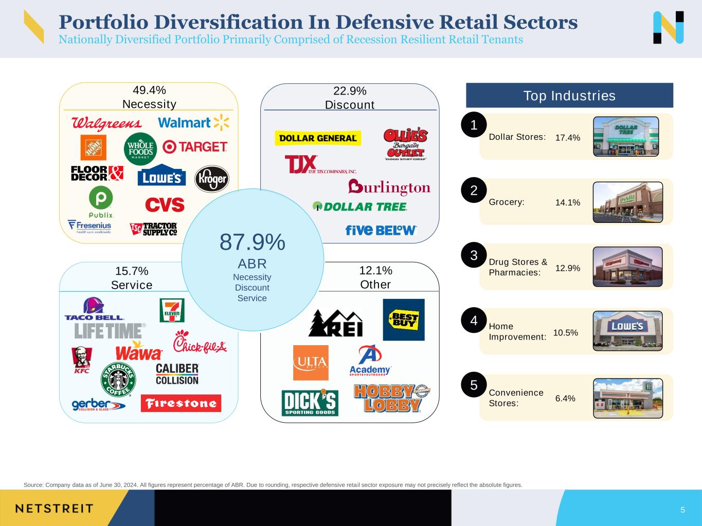 11.8% 6.9% 5.9% 5.6% 4.3% 3.9% 3.8% 3.0% 2.9% 2.8% Portfolio Overview High-Quality, Diversified Portfolio Consisting of 63.0%1 Investment Grade Tenants Across 45 States 4 Source: Company data as of June 30, 2024, unless otherwise noted. 1. Reflects the impact of Walgreens’ downgrade to sub-investment grade in July 2024. 2. 77 properties that secure mortgage loans receivable are denoted as individual investments. 3. Excludes 77 investments that secure mortgage loans receivable. 4. Investments, or investments that are subsidiaries of a parent entity, with a credit rating of BBB- (S&P/Fitch), Baa3 (Moody’s) or NAIC2 (National Association of Insurance Commissioners) or higher. 5. Weighted by ABR; excludes lease extension options and 77 investments that secure mortgage loans receivable. 6. Represent investments with investment grade credit metrics (more than $1.0 billion in annual sales and a debt to adjusted EBITDA ratio of less than 2.0x), but do not carry a published rating from S&P, Moody’s, Fitch or NAIC. Key Portfolio Stats Investments2 649 States 45 Portfolio Square Feet (in millions) 11.7 Tenants 90 Retail Sectors 26 % Occupancy3 100% % Investment Grade Tenants (by ABR)1,4 63.0% WALT (Years)5 9.5 Lease Turnover Through 2027 (by ABR) 6.8% National Footprint in Attractive Markets Top 10 Tenants by % of ABR Investment Grade BBB Sub-Investment Grade ≥1% and <3% ABR <1% ABR ≥5% and <10% ABR ≥3% and <5% ABR 0% ABR AK HI WA OR MT CA AZ WY NV ID UT CO NM TX OK ND SD NE KS LA AR MO IA MN WI IL IN MI OH KY TN FL MS AL GA SC NC VA WV PA DE NJ NY ME VT NH MA MD CT RI A BBB+ BBB IG Profile BBB A A BB1 B+ Investment Grade Profile6