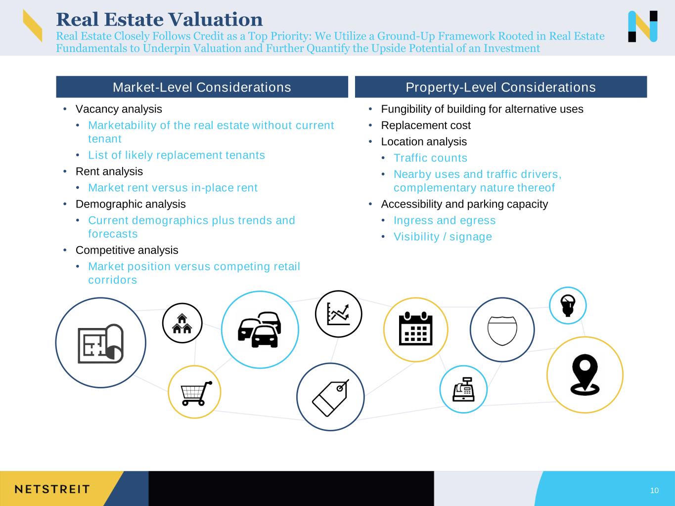 10 Market-Level Considerations Property-Level Considerations • Fungibility of building for alternative uses • Replacement cost • Location analysis • Traffic counts • Nearby uses and traffic drivers, complementary nature thereof • Accessibility and parking capacity • Ingress and egress • Visibility / signage • Vacancy analysis • Marketability of the real estate without current tenant • List of likely replacement tenants • Rent analysis • Market rent versus in-place rent • Demographic analysis • Current demographics plus trends and forecasts • Competitive analysis • Market position versus competing retail corridors Real Estate Valuation Real Estate Closely Follows Credit as a Top Priority: We Utilize a Ground-Up Framework Rooted in Real Estate Fundamentals to Underpin Valuation and Further Quantify the Upside Potential of an Investment