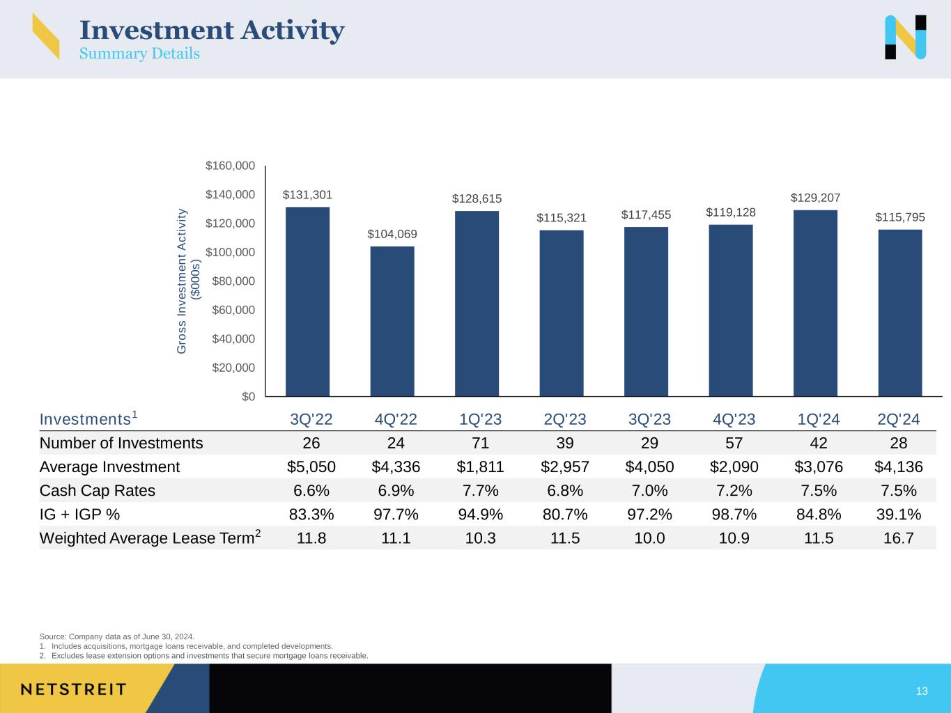 12 Source: Company filings from August 2020 through June 30, 2024. 1. Investments with investment grade credit metrics (more than $1.0 billion in annual sales and a debt to adjusted EBITDA ratio of less than 2.0x), but do not carry a published rating from S&P, Fitch, Moody’s, or NAIC. 2. Excludes lease extension options and investments that secure mortgage loans receivable. 3. Assumes cash cap rate is 30bps lower than reported GAAP cap rate. Volume $(000)s $1,863 $5,296 $2,564 $1,088 $3,900 Investment Grade % 66.7% 67.4% NA 54.5% NA Investment Grade Profile1 % 12.0% NA NA NA NA IG + IG Profile % 78.6% NA NA NA NA WALT2 10.4 9.5 10.4 10.4 14.6 Weighted Average Cash Yield 6.8% 6.2%3 6.9% 6.6% 7.4% History of Sourcing Investments at Attractive Yields Consistently Invested at Above-Market Yields Despite Focus on High-Quality Tenants Sourcing Volume Since 3Q’20