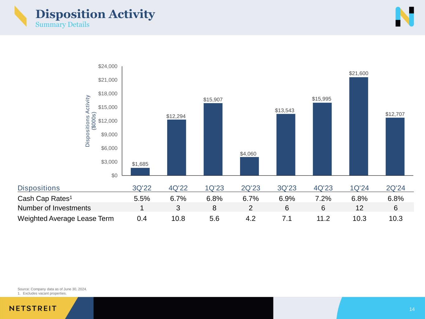 $131,301 $104,069 $128,615 $115,321 $117,455 $119,128 $129,207 $115,795 $0 $20,000 $40,000 $60,000 $80,000 $100,000 $120,000 $140,000 $160,000 3Q'22 4Q'22 1Q'23 2Q'23 3Q'23 4Q'23 1Q'24 2Q'24 G ro s s I n v e s tm e n t A c ti v it y ( $ 0 0 0 s ) 13 Investment Activity Summary Details Source: Company data as of June 30, 2024. 1. Includes acquisitions, mortgage loans receivable, and completed developments. 2. Excludes lease extension options and investments that secure mortgage loans receivable. Investments1 3Q'22 4Q'22 1Q'23 2Q'23 3Q'23 4Q'23 1Q'24 2Q'24 Number of Investments 26 24 71 39 29 57 42 28 Average Investment $5,050 $4,336 $1,811 $2,957 $4,050 $2,090 $3,076 $4,136 Cash Cap Rates 6.6% 6.9% 7.7% 6.8% 7.0% 7.2% 7.5% 7.5% IG + IGP % 83.3% 97.7% 94.9% 80.7% 97.2% 98.7% 84.8% 39.1% Weighted Average Lease Term2 11.8 11.1 10.3 11.5 10.0 10.9 11.5 16.7
