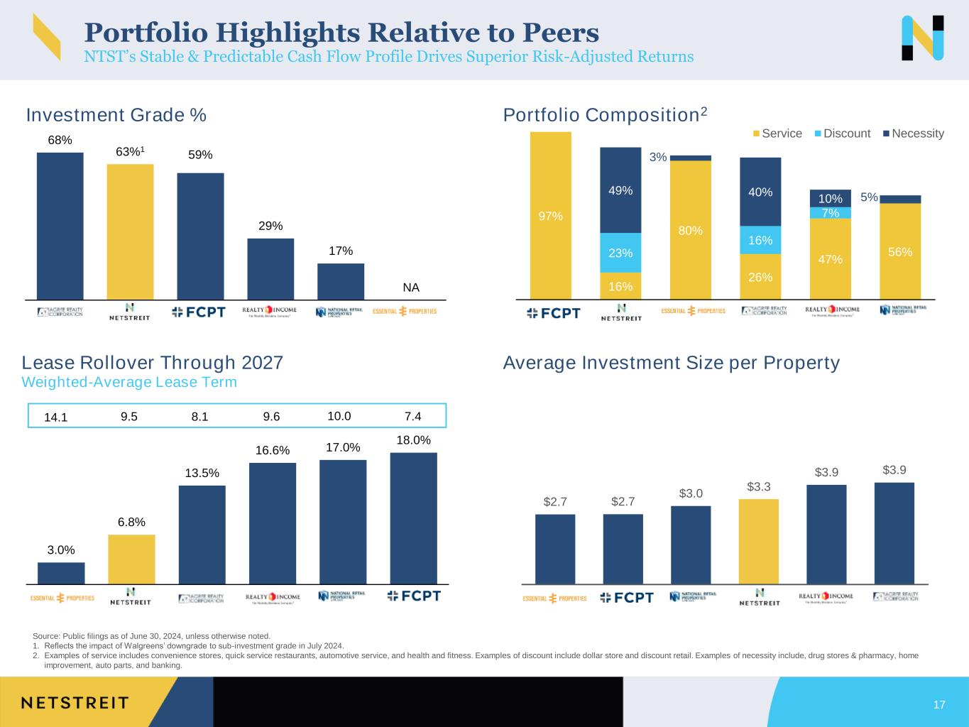 59% 68% 63%1 29% 17% NA ADC NTST FCPT O NNN EPRT 3.0% 6.8% 13.5% 16.6% 17.0% 18.0% EPRT NTST ADC O NNN FCPT 97% 16% 80% 26% 47% 56%23% 16% 7% 49% 3% 40% 10% 5% FCPT NTST EPRT ADC O NNN Service Discount Necessity Source: Public filings as of June 30, 2024, unless otherwise noted. 1. Reflects the impact of Walgreens’ downgrade to sub-investment grade in July 2024. 2. Examples of service includes convenience stores, quick service restaurants, automotive service, and health and fitness. Examples of discount include dollar store and discount retail. Examples of necessity include, drug stores & pharmacy, home improvement, auto parts, and banking. Portfolio Highlights Relative to Peers NTST’s Stable & Predictable Cash Flow Profile Drives Superior Risk-Adjusted Returns Lease Rollover Through 2027 Average Investment Size per Property Investment Grade % Portfolio Composition2 Weighted-Average Lease Term 17 14.1 9.5 8.1 9.6 10.0 7.4 $3.9 $3.9 $3.3 $3.0 $2.7 $2.7