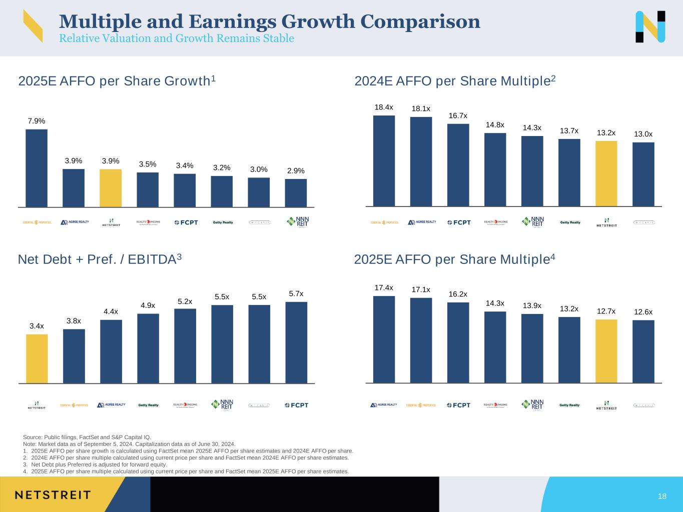 Disclaimer 2 This presentation contains forward-looking statements within the meaning of Section 27A of the Securities Act of 1933, as amended, and Section 21E of the Securities Exchange Act of 1934, as amended. Such forward-looking statements include, without limitation, statements concerning our business and growth strategies, investment, financing and leasing activities, including estimated development costs, and trends in our business, including trends in the market for single-tenant, retail commercial real estate. Words such as “expects,” “anticipates,” “intends,” “plans,” “likely,” “will,” “believes,” “seeks,” “estimates,” and variations of such words and similar expressions are intended to identify such forward-looking statements. Such statements involve known and unknown risks, uncertainties and other factors that may cause our actual results, performance or achievements to be materially different from the results of operations or plans expressed or implied by such forward-looking statements. Although we believe that the assumptions underlying the forward-looking statements contained herein are reasonable, any of the assumptions could be inaccurate, and therefore such statements included in this presentation may not prove to be accurate. In light of the significant uncertainties inherent in the forward-looking statements included herein, the inclusion of such information should not be regarded as a representation by us or any other person that the results or conditions described in such statements, or our objectives and plans will be achieved. For a further discussion of these and other factors that could impact future results, performance or transactions, see the information under the heading “Risk Factors” in our Form 10-K for the year ended December 31, 2023, filed with the SEC on February 14, 2024, and other reports filed with the SEC from time to time. Forward-looking statements and such risks, uncertainties and other factors speak only as of the date of this presentation. New risks and uncertainties may arise over time, and it is not possible for us to predict those events or how they may affect us. Many of the risks identified herein and in our periodic reports have been and will continue to be heightened as a result of the ongoing and numerous adverse effects arising from macroeconomic conditions, including inflation, interest rates and instability in the banking system. We expressly disclaim any obligation or undertaking to update or revise any forward-looking statement contained herein, to reflect any change in our expectations with regard thereto, or any other change in events, conditions or circumstances on which any such statement is based, except to the extent otherwise required by law. This presentation also includes certain financial measures not presented in accordance with generally accepted accounting principles (“GAAP”) including, but not limited to, FFO, Core FFO, AFFO, EBITDA, EBITDAre, Adjusted EBITDAre, Annualized Adjusted EBITDAre, NOI, Cash NOI, Normalized Cash NOI, Net Debt, Adjusted Net Debt, and Pro forma Adjusted Net Debt. These non-GAAP financial measures are not measures of financial performance in accordance with GAAP and may exclude items that are significant in understanding and assessing the Company’s financial results. Therefore, these measures should not be considered in isolation or as an alternative to net income, cash flows from operations or other measures of profitability, liquidity or performance under GAAP. You should be aware that the presentation of these measures may not be comparable to similarly-titled measures used by other companies. The Company believes these non-GAAP measures provide useful information to management and investors regarding certain financial and business trends relating to the Company’s financial condition and results of operations. The Company believes that the use of these non-GAAP financial measures provides an additional tool for investors to use in evaluating ongoing operating results and trends in and in comparing its financial results with other similar companies, many of which present similar non-GAAP financial measures to investors. These non-GAAP financial measures are subject to inherent limitations as they reflect the exercise of judgments by management about which expense and income are excluded or included in determining these non-GAAP financial measures. Certain monetary amounts, percentages and other figures included in this presentation have been subject to rounding adjustments. Certain other amounts that appear in this presentation may not sum due to rounding.