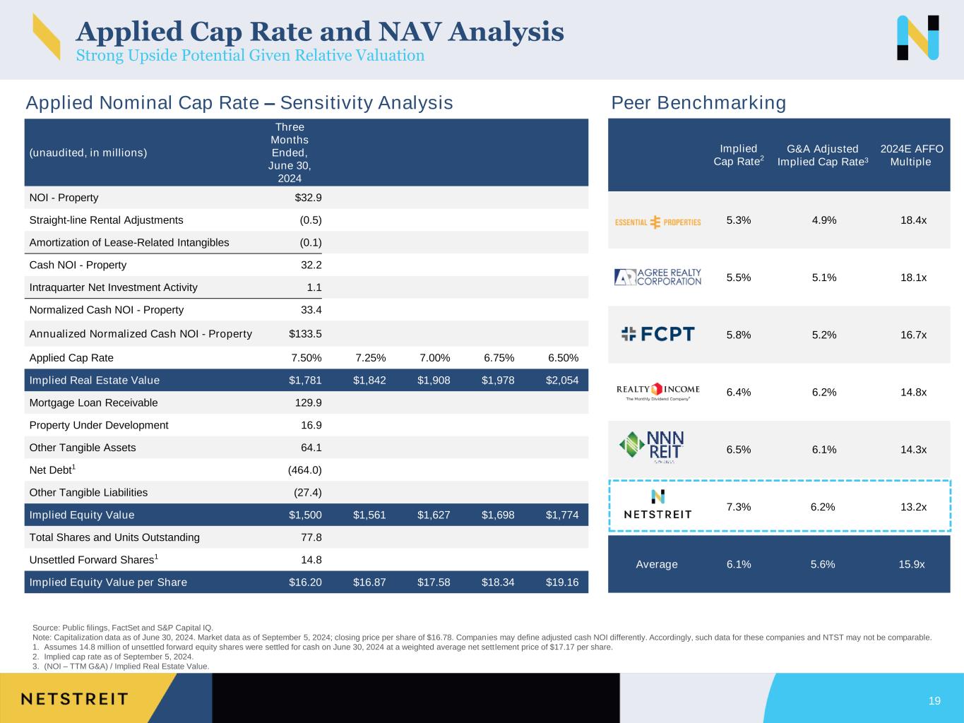 Applied Cap Rate and NAV Analysis Strong Upside Potential Given Relative Valuation Applied Nominal Cap Rate – Sensitivity Analysis Source: Public filings, FactSet and S&P Capital IQ. Note: Capitalization data as of June 30, 2024. Market data as of September 5, 2024; closing price per share of $16.78. Companies may define adjusted cash NOI differently. Accordingly, such data for these companies and NTST may not be comparable. 1. Assumes 14.8 million of unsettled forward equity shares were settled for cash on June 30, 2024 at a weighted average net sett lement price of $17.17 per share. 2. Implied cap rate as of September 5, 2024. 3. (NOI – TTM G&A) / Implied Real Estate Value. 19 Implied Cap Rate2 G&A Adjusted Implied Cap Rate3 2024E AFFO Multiple 5.3% 4.9% 18.4x 5.5% 5.1% 18.1x 5.8% 5.2% 16.7x 6.4% 6.2% 14.8x 6.5% 6.1% 14.3x 7.3% 6.2% 13.2x Average 6.1% 5.6% 15.9x Peer Benchmarking (unaudited, in millions) Three Months Ended, June 30, 2024 NOI - Property $32.9 Straight-line Rental Adjustments (0.5) Amortization of Lease-Related Intangibles (0.1) Cash NOI - Property 32.2 Intraquarter Net Investment Activity 1.1 Normalized Cash NOI - Property 33.4 Annualized Normalized Cash NOI - Property $133.5 Applied Cap Rate 7.50% 7.25% 7.00% 6.75% 6.50% Implied Real Estate Value $1,781 $1,842 $1,908 $1,978 $2,054 Mortgage Loan Receivable 129.9 Property Under Development 16.9 Other Tangible Assets 64.1 Net Debt1 (464.0) Other Tangible Liabilities (27.4) Implied Equity Value $1,500 $1,561 $1,627 $1,698 $1,774 Total Shares and Units Outstanding 77.8 Unsettled Forward Shares1 14.8 Implied Equity Value per Share $16.20 $16.87 $17.58 $18.34 $19.16