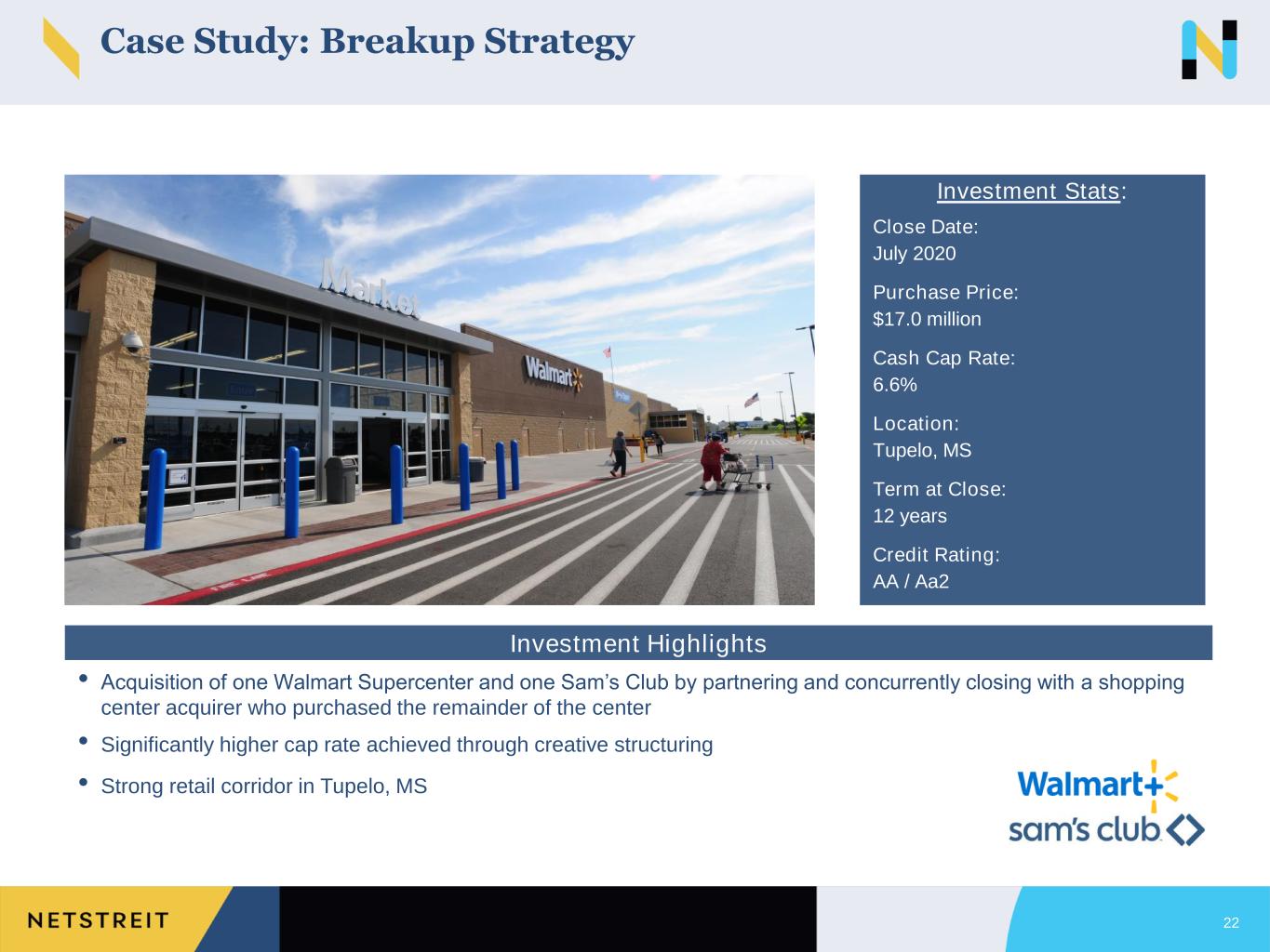 Close Date: March 2023 Loan Amount: $46.1 million Interest Rate: 9.3% Location: Multiple – Southeast Term at Close: 3 years Parent Credit Rating: A / Baa2 21 • Loan provided the borrower funding to acquire a 49 property Speedway portfolio • Loan-to-value of ~60%, with first lien senior secured priority with no capital ahead of NETSTREIT’s loan • Yield maintenance provides protection from refinancing • Valuation excludes pending uncapped CPI rent escalations Investment Stats: Investment Highlights Case Study: Loan Strategy