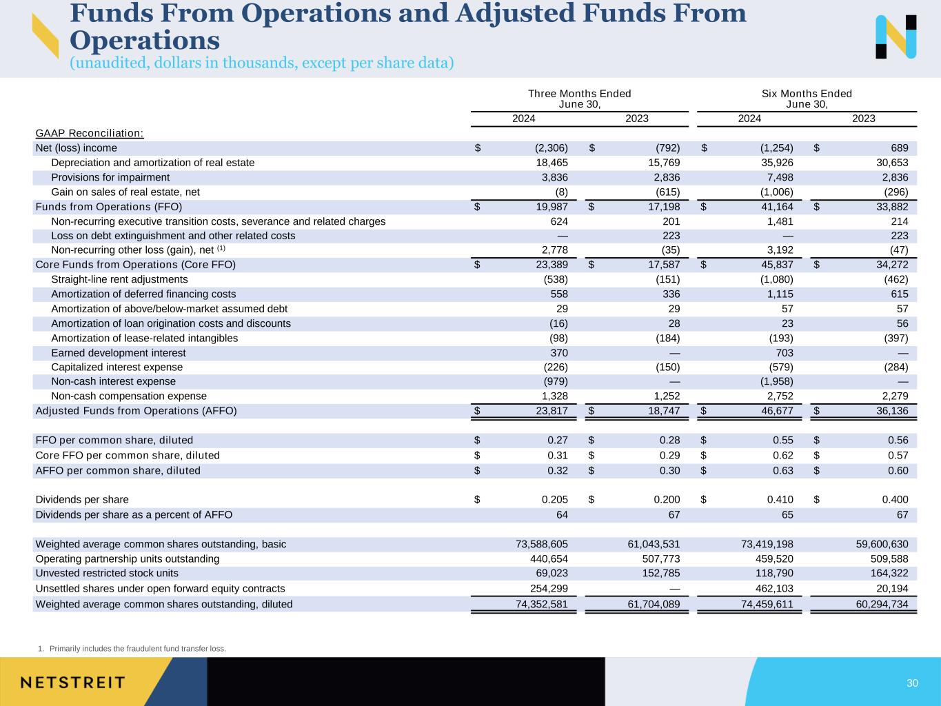 Three Months Ended June 30, Six Months Ended June 30, 2024 2023 2024 2023 GAAP Reconciliation: Net (loss) income $ (2,306) $ (792) $ (1,254) $ 689 Depreciation and amortization of real estate 18,465 15,769 35,926 30,653 Provisions for impairment 3,836 2,836 7,498 2,836 Gain on sales of real estate, net (8) (615) (1,006) (296) Funds from Operations (FFO) $ 19,987 $ 17,198 $ 41,164 $ 33,882 Non-recurring executive transition costs, severance and related charges 624 201 1,481 214 Loss on debt extinguishment and other related costs — 223 — 223 Non-recurring other loss (gain), net (1) 2,778 (35) 3,192 (47) Core Funds from Operations (Core FFO) $ 23,389 $ 17,587 $ 45,837 $ 34,272 Straight-line rent adjustments (538) (151) (1,080) (462) Amortization of deferred financing costs 558 336 1,115 615 Amortization of above/below-market assumed debt 29 29 57 57 Amortization of loan origination costs and discounts (16) 28 23 56 Amortization of lease-related intangibles (98) (184) (193) (397) Earned development interest 370 — 703 — Capitalized interest expense (226) (150) (579) (284) Non-cash interest expense (979) — (1,958) — Non-cash compensation expense 1,328 1,252 2,752 2,279 Adjusted Funds from Operations (AFFO) $ 23,817 $ 18,747 $ 46,677 $ 36,136 FFO per common share, diluted $ 0.27 $ 0.28 $ 0.55 $ 0.56 Core FFO per common share, diluted $ 0.31 $ 0.29 $ 0.62 $ 0.57 AFFO per common share, diluted $ 0.32 $ 0.30 $ 0.63 $ 0.60 Dividends per share $ 0.205 $ 0.200 $ 0.410 $ 0.400 Dividends per share as a percent of AFFO 64 67 65 67 Weighted average common shares outstanding, basic 73,588,605 61,043,531 73,419,198 59,600,630 Operating partnership units outstanding 440,654 507,773 459,520 509,588 Unvested restricted stock units 69,023 152,785 118,790 164,322 Unsettled shares under open forward equity contracts 254,299 — 462,103 20,194 Weighted average common shares outstanding, diluted 74,352,581 61,704,089 74,459,611 60,294,734 30 1. Primarily includes the fraudulent fund transfer loss. Funds From Operations and Adjusted Funds From Operations (unaudited, dollars in thousands, except per share data)
