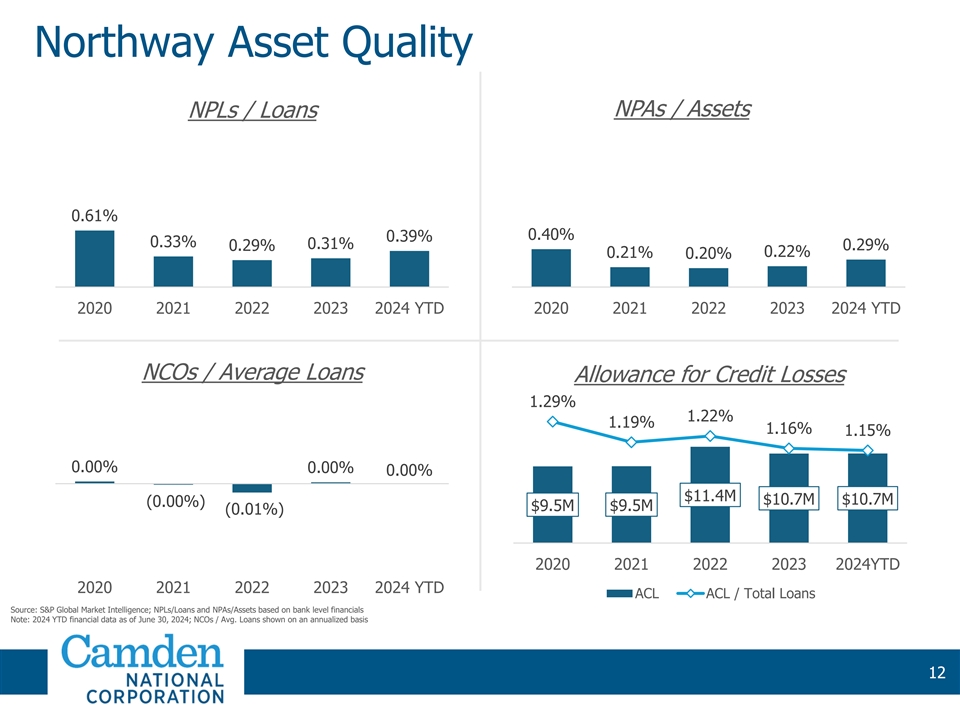 Northway Asset Quality NPAs / Assets NPLs / Loans 0.61% 0.40% 0.39% 0.33% 0.31% 0.29% 0.29% 0.22% 0.21% 0.20% 2020 2021 2022 2023 2024 YTD 2020 2021 2022 2023 2024 YTD NCOs / Average Loans Allowance for Credit Losses 1.29% 1.22% 1.3 1.19% 1.16% 1.15% 12 1.1 0.00% 0.00% 0.00% 7 $11.4M $10.7M $10.7M (0.00%) 0.9 $9.5M $9.5M (0.01%) 2 0.7 2020 2021 2022 2023 2024YTD 2020 2021 2022 2023 2024 YTD ACL ACL / Total Loans Source: S&P Global Market Intelligence; NPLs/Loans and NPAs/Assets based on bank level financials Note: 2024 YTD financial data as of June 30, 2024; NCOs / Avg. Loans shown on an annualized basis 12 12 12 12