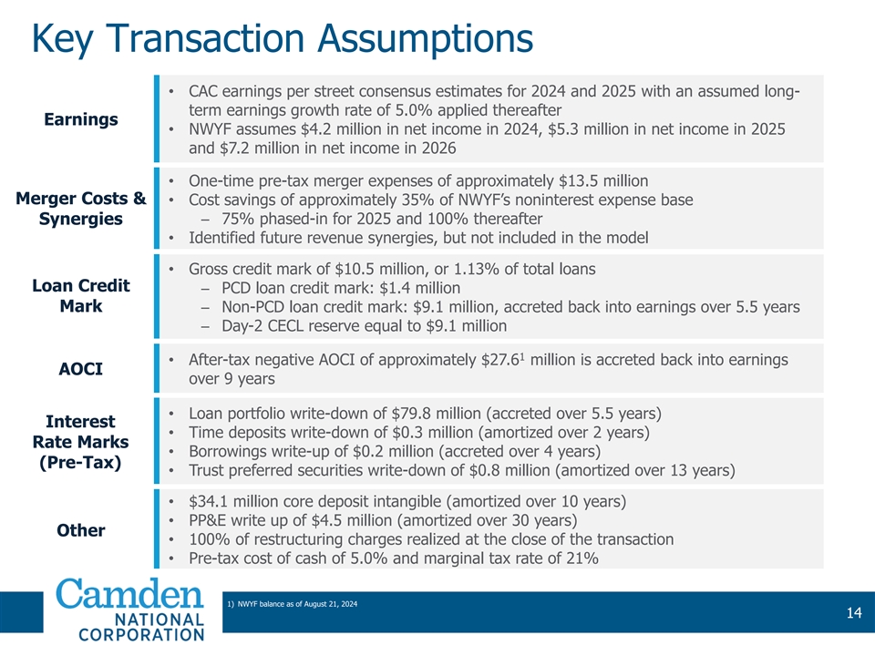 Transaction Structure and Overview • Northway Financial, Inc. to merge into Camden National Corporation; Northway Structure & Bank to merge into Camden National Bank Consideration • 100% stock consideration • 0.83x of a CAC share for each NWYF share Transaction 1 • Implied price per NWYF share of $31.46 for an aggregate deal value of $86.6M 1 Value Ownership / • Approximately 86% CAC / 14% NWYF Board • One director from NWYF to join the CAC board of directors • Price / TBV: 139% Transaction • Price / TBV excluding AOCI: 89% 1 Multiples • Price / 2025E EPS + cost saves: 6.1x • Core deposit premium: 2.6% Approvals • Subject to NWYF shareholder approval and customary regulatory approvals Timing • Anticipated closing in Q1 2025 1) Based on CAC’s market price of $37.90 as of September 9, 2024 13 13 13