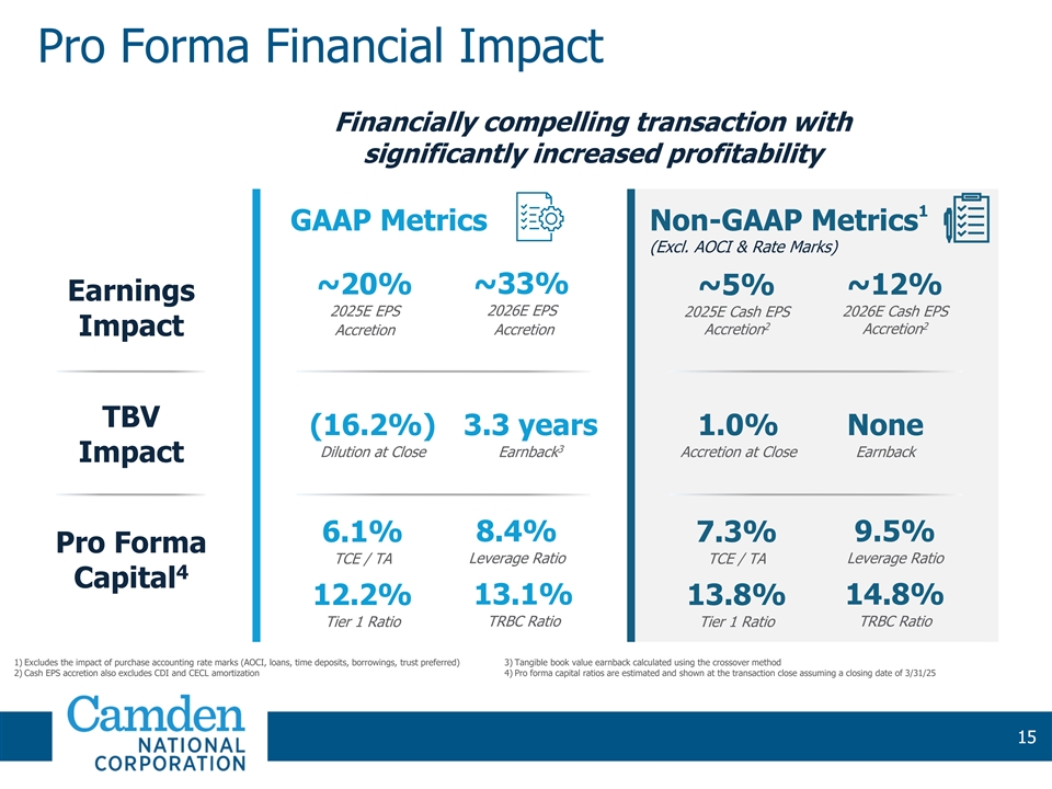 On a combined basis, the merger is expected to be approximately 19.9% accretive to Camden Nationals 2025 earnings per share and 32.7% accretive to Camden Nationals 2026 earnings per share. Following the completion of the merger, Camden Nationals capital ratios are expected to remain significantly above well-capitalized thresholds, with the pro forma company well-positioned for future growth.