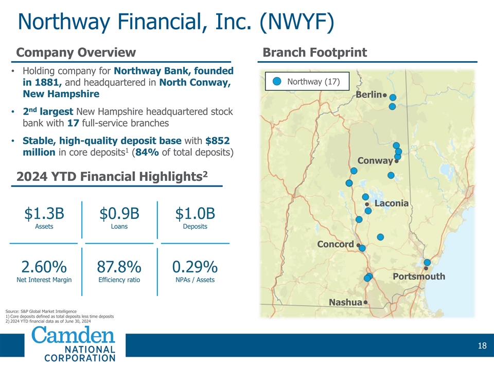 As of June 30, 2024, Northway had approximately $1.3 billion of total assets, $0.9 billion of total loans, and $1.0 billion of deposits.