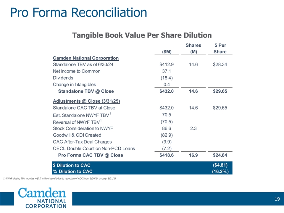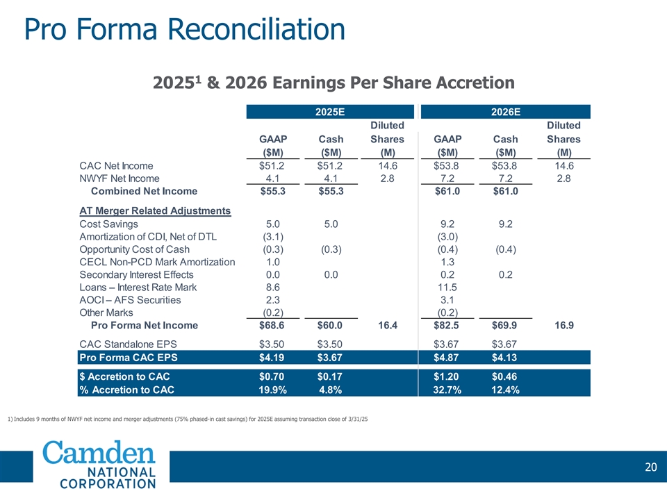 Pro Forma Reconciliation Tangible Book Value Per Share Dilution Shares $ Per ($M) (M) Share Camden National Corporation Standalone TBV as of 6/30/24 $412.9 14.6 $28.34 Net Income to Common 37.1 Dividends (18.4) Change in Intangibles 0.4 Standalone TBV @ Close $432.0 14.6 $29.65 Adjustments @ Close (3/31/25) Standalone CAC TBV at Close $432.0 14.6 $29.65 1 70.5 Est. Standalone NWYF TBV 1 (70.5) Reversal of NWYF TBV Stock Consideration to NWYF 86.6 2.3 Goodwill & CDI Created (82.9) CAC After-Tax Deal Charges (9.9) CECL Double Count on Non-PCD Loans (7.2) Pro Forma CAC TBV @ Close $418.6 16.9 $24.84 $ Dilution to CAC ($4.81) % Dilution to CAC (16.2%) 1) NWYF closing TBV includes ~$7.7 million benefit due to reduction of AOCI from 6/30/24 through 8/21/24 19 19 19 19