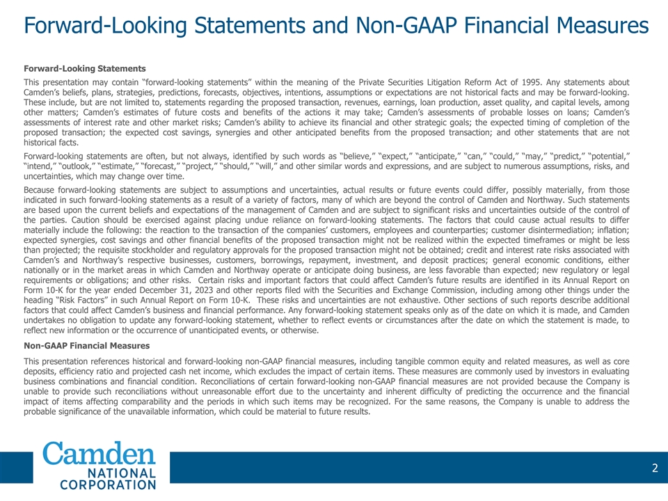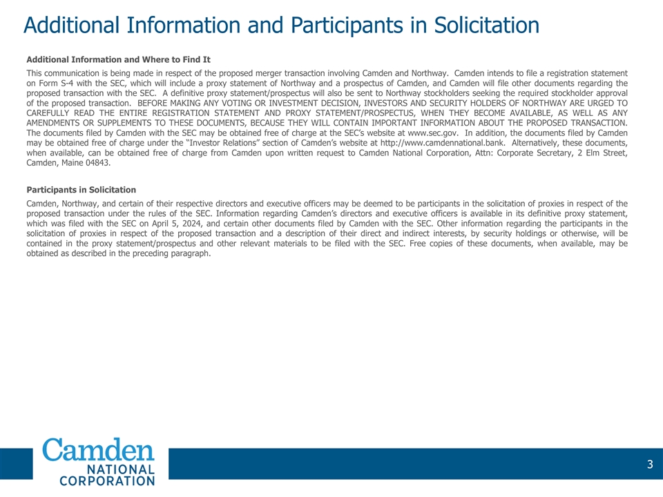 Forward-Looking Statements and Non-GAAP Financial Measures Forward-Looking Statements This presentation may contain “forward-looking statements” within the meaning of the Private Securities Litigation Reform Act of 1995. Any statements about Camden’s beliefs, plans, strategies, predictions, forecasts, objectives, intentions, assumptions or expectations are not historical facts and may be forward-looking. These include, but are not limited to, statements regarding the proposed transaction, revenues, earnings, loan production, asset quality, and capital levels, among other matters; Camden’s estimates of future costs and benefits of the actions it may take; Camden’s assessments of probable losses on loans; Camden’s assessments of interest rate and other market risks; Camden’s ability to achieve its financial and other strategic goals; the expected timing of completion of the proposed transaction; the expected cost savings, synergies and other anticipated benefits from the proposed transaction; and other statements that are not historical facts. Forward-looking statements are often, but not always, identified by such words as “believe,” “expect,” “anticipate,” “can,” “could,” “may,” “predict,” “potential,” “intend,” “outlook,” “estimate,” “forecast,” “project,” “should,” “will,” and other similar words and expressions, and are subject to numerous assumptions, risks, and uncertainties, which may change over time. Because forward-looking statements are subject to assumptions and uncertainties, actual results or future events could differ, possibly materially, from those indicated in such forward-looking statements as a result of a variety of factors, many of which are beyond the control of Camden and Northway. Such statements are based upon the current beliefs and expectations of the management of Camden and are subject to significant risks and uncertainties outside of the control of the parties. Caution should be exercised against placing undue reliance on forward-looking statements. The factors that could cause actual results to differ materially include the following: the reaction to the transaction of the companies’ customers, employees and counterparties; customer disintermediation; inflation; expected synergies, cost savings and other financial benefits of the proposed transaction might not be realized within the expected timeframes or might be less than projected; the requisite stockholder and regulatory approvals for the proposed transaction might not be obtained; credit and interest rate risks associated with Camden’s and Northway’s respective businesses, customers, borrowings, repayment, investment, and deposit practices; general economic conditions, either nationally or in the market areas in which Camden and Northway operate or anticipate doing business, are less favorable than expected; new regulatory or legal requirements or obligations; and other risks. Certain risks and important factors that could affect Camden’s future results are identified in its Annual Report on Form 10-K for the year ended December 31, 2023 and other reports filed with the Securities and Exchange Commission, including among other things under the heading “Risk Factors” in such Annual Report on Form 10-K. These risks and uncertainties are not exhaustive. Other sections of such reports describe additional factors that could affect Camden’s business and financial performance. Any forward-looking statement speaks only as of the date on which it is made, and Camden undertakes no obligation to update any forward-looking statement, whether to reflect events or circumstances after the date on which the statement is made, to reflect new information or the occurrence of unanticipated events, or otherwise. Non‐GAAP Financial Measures This presentation references historical and forward-looking non‐GAAP financial measures, including tangible common equity and related measures, as well as core deposits, efficiency ratio and projected cash net income, which excludes the impact of certain items. These measures are commonly used by investors in evaluating business combinations and financial condition. Reconciliations of certain forward-looking non-GAAP financial measures are not provided because the Company is unable to provide such reconciliations without unreasonable effort due to the uncertainty and inherent difficulty of predicting the occurrence and the financial impact of items affecting comparability and the periods in which such items may be recognized. For the same reasons, the Company is unable to address the probable significance of the unavailable information, which could be material to future results. 2 2 2 2