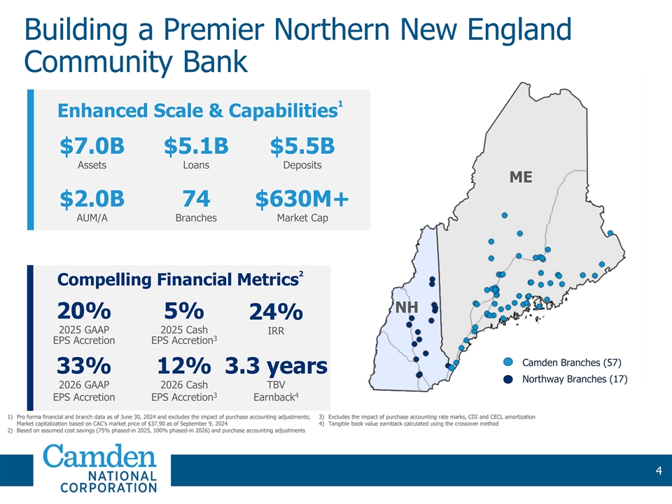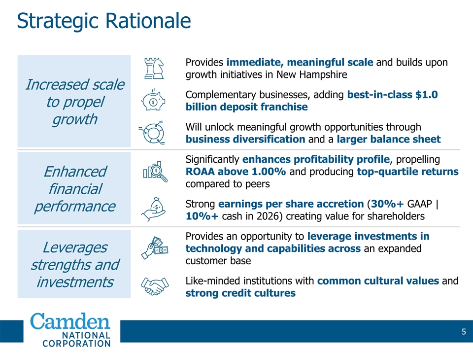 Building a Premier Northern New England Community Bank 1 Enhanced Scale & Capabilities $7.0B $5.1B $5.5B Assets Loans Deposits ME $2.0B 74 $630M+ AUM/A Branches Market Cap 2 Compelling Financial Metrics NH 20% 5% 24% 2025 GAAP 2025 Cash IRR 3 EPS Accretion EPS Accretion Camden Branches (57) 33% 12% 3.3 years Northway Branches (17) 2026 GAAP 2026 Cash TBV 3 4 EPS Accretion EPS Accretion Earnback 1) Pro forma financial and branch data as of June 30, 2024 and excludes the impact of purchase accounting adjustments; 3) Excludes the impact of purchase accounting rate marks, CDI and CECL amortization Market capitalization based on CAC’s market price of $37.90 as of September 9, 2024 4) Tangible book value earnback calculated using the crossover method 2) Based on assumed cost savings (75% phased-in 2025, 100% phased-in 2026) and purchase accounting adjustments 4 4 4 4