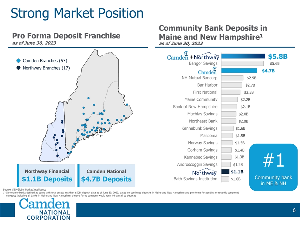 Strategic Rationale Provides immediate, meaningful scale and builds upon growth initiatives in New Hampshire Increased scale Complementary businesses, adding best-in-class $1.0 to propel billion deposit franchise growth Will unlock meaningful growth opportunities through business diversification and a larger balance sheet Significantly enhances profitability profile, propelling ROAA above 1.00% and producing top-quartile returns Enhanced compared to peers financial Strong earnings per share accretion (30%+ GAAP | performance 10%+ cash in 2026) creating value for shareholders Provides an opportunity to leverage investments in Leverages technology and capabilities across an expanded customer base strengths and Like-minded institutions with common cultural values and investments strong credit cultures 5 5 5 5
