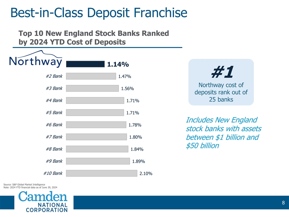 Strong Market Position Community Bank Deposits in 1 Pro Forma Deposit Franchise Maine and New Hampshire as of June 30, 2023 as of June 30, 2023 PF $5.8B + Camden Branches (57) Bangor Savings $5.6B Northway Branches (17) CAC $4.7B NH Mutual Bancorp $2.9B Bar Harbor $2.7B First National $2.5B Maine Community $2.2B Bank of New Hampshire $2.1B Machias Savings $2.0B Northeast Bank $2.0B Kennebunk Savings $1.6B Mascoma $1.5B Norway Savings $1.5B Gorham Savings $1.4B $1.3B Kennebec Savings Androscoggin Savings $1.2B #1 Northway Financial Camden National NWYF $1.1B Community bank Bath Savings Institution $1.0B $1.1B Deposits $4.7B Deposits in ME & NH Source: S&P Global Market Intelligence 1) Community banks defined as banks with total assets less than $50B; deposit data as of June 30, 2023, based on combined deposits in Maine and New Hampshire and pro forma for pending or recently completed mergers; Including all banks in Maine and New Hampshire, the pro forma company would rank #4 overall by deposits 6 6 6 6