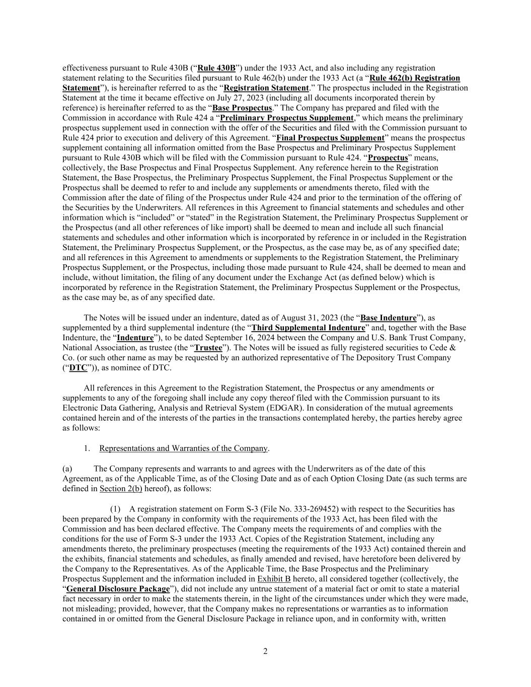 2 effectiveness pursuant to Rule 430B (“Rule 430B”) under the 1933 Act, and also including any registration statement relating to the Securities filed pursuant to Rule 462(b) under the 1933 Act (a “Rule 462(b) Registration Statement”), is hereinafter referred to as the “Registration Statement.” The prospectus included in the Registration Statement at the time it became effective on July 27, 2023 (including all documents incorporated therein by reference) is hereinafter referred to as the “Base Prospectus.” The Company has prepared and filed with the Commission in accordance with Rule 424 a “Preliminary Prospectus Supplement,” which means the preliminary prospectus supplement used in connection with the offer of the Securities and filed with the Commission pursuant to Rule 424 prior to execution and delivery of this Agreement. “Final Prospectus Supplement” means the prospectus supplement containing all information omitted from the Base Prospectus and Preliminary Prospectus Supplement pursuant to Rule 430B which will be filed with the Commission pursuant to Rule 424. “Prospectus” means, collectively, the Base Prospectus and Final Prospectus Supplement. Any reference herein to the Registration Statement, the Base Prospectus, the Preliminary Prospectus Supplement, the Final Prospectus Supplement or the Prospectus shall be deemed to refer to and include any supplements or amendments thereto, filed with the Commission after the date of filing of the Prospectus under Rule 424 and prior to the termination of the offering of the Securities by the Underwriters. All references in this Agreement to financial statements and schedules and other information which is “included” or “stated” in the Registration Statement, the Preliminary Prospectus Supplement or the Prospectus (and all other references of like import) shall be deemed to mean and include all such financial statements and schedules and other information which is incorporated by reference in or included in the Registration Statement, the Preliminary Prospectus Supplement, or the Prospectus, as the case may be, as of any specified date; and all references in this Agreement to amendments or supplements to the Registration Statement, the Preliminary Prospectus Supplement, or the Prospectus, including those made pursuant to Rule 424, shall be deemed to mean and include, without limitation, the filing of any document under the Exchange Act (as defined below) which is incorporated by reference in the Registration Statement, the Preliminary Prospectus Supplement or the Prospectus, as the case may be, as of any specified date. The Notes will be issued under an indenture, dated as of August 31, 2023 (the “Base Indenture”), as supplemented by a third supplemental indenture (the “Third Supplemental Indenture” and, together with the Base Indenture, the “Indenture”), to be dated September 16, 2024 between the Company and U.S. Bank Trust Company, National Association, as trustee (the “Trustee”). The Notes will be issued as fully registered securities to Cede & Co. (or such other name as may be requested by an authorized representative of The Depository Trust Company (“DTC”)), as nominee of DTC. All references in this Agreement to the Registration Statement, the Prospectus or any amendments or supplements to any of the foregoing shall include any copy thereof filed with the Commission pursuant to its Electronic Data Gathering, Analysis and Retrieval System (EDGAR). In consideration of the mutual agreements contained herein and of the interests of the parties in the transactions contemplated hereby, the parties hereby agree as follows: 1. Representations and Warranties of the Company. (a) The Company represents and warrants to and agrees with the Underwriters as of the date of this Agreement, as of the Applicable Time, as of the Closing Date and as of each Option Closing Date (as such terms are defined in Section 2(b) hereof), as follows: (1) A registration statement on Form S-3 (File No. 333-269452) with respect to the Securities has been prepared by the Company in conformity with the requirements of the 1933 Act, has been filed with the Commission and has been declared effective. The Company meets the requirements of and complies with the conditions for the use of Form S-3 under the 1933 Act. Copies of the Registration Statement, including any amendments thereto, the preliminary prospectuses (meeting the requirements of the 1933 Act) contained therein and the exhibits, financial statements and schedules, as finally amended and revised, have heretofore been delivered by the Company to the Representatives. As of the Applicable Time, the Base Prospectus and the Preliminary Prospectus Supplement and the information included in Exhibit B hereto, all considered together (collectively, the “General Disclosure Package”), did not include any untrue statement of a material fact or omit to state a material fact necessary in order to make the statements therein, in the light of the circumstances under which they were made, not misleading; provided, however, that the Company makes no representations or warranties as to information contained in or omitted from the General Disclosure Package in reliance upon, and in conformity with, written