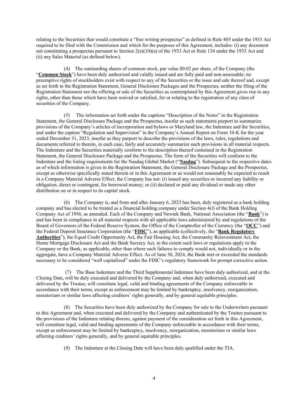 4 relating to the Securities that would constitute a “free writing prospectus” as defined in Rule 405 under the 1933 Act required to be filed with the Commission and which for the purposes of this Agreement, includes: (i) any document not constituting a prospectus pursuant to Section 2(a)(10)(a) of the 1933 Act or Rule 134 under the 1933 Act and (ii) any Sales Material (as defined below). (4) The outstanding shares of common stock, par value $0.02 per share, of the Company (the “Common Stock”) have been duly authorized and validly issued and are fully paid and non-assessable; no preemptive rights of stockholders exist with respect to any of the Securities or the issue and sale thereof and, except as set forth in the Registration Statement, General Disclosure Packages and the Prospectus, neither the filing of the Registration Statement nor the offering or sale of the Securities as contemplated by this Agreement gives rise to any rights, other than those which have been waived or satisfied, for or relating to the registration of any class of securities of the Company. (5) The information set forth under the captions “Description of the Notes” in the Registration Statement, the General Disclosure Package and the Prospectus, insofar as such statements purport to summarize provisions of the Company’s articles of incorporation and bylaws or Maryland law, the Indenture and the Securities, and under the caption “Regulation and Supervision” in the Company’s Annual Report on Form 10-K for the year ended December 31, 2023, insofar as they purport to describe the provisions of the laws, rules, regulations and documents referred to therein, in each case, fairly and accurately summarize such provisions in all material respects. The Indenture and the Securities materially conform to the description thereof contained in the Registration Statement, the General Disclosure Package and the Prospectus. The form of the Securities will conform to the Indenture and the listing requirements for the Nasdaq Global Market (“Nasdaq”). Subsequent to the respective dates as of which information is given in the Registration Statement, the General Disclosure Package and the Prospectus, except as otherwise specifically stated therein or in this Agreement or as would not reasonably be expected to result in a Company Material Adverse Effect, the Company has not: (i) issued any securities or incurred any liability or obligation, direct or contingent, for borrowed money; or (ii) declared or paid any dividend or made any other distribution on or in respect to its capital stock. (6) The Company is, and from and after January 6, 2023 has been, duly registered as a bank holding company and has elected to be treated as a financial holding company under Section 4(l) of the Bank Holding Company Act of 1956, as amended. Each of the Company and Newtek Bank, National Association (the “Bank”) is and has been in compliance in all material respects with all applicable laws administered by and regulations of the Board of Governors of the Federal Reserve System, the Office of the Comptroller of the Currency (the “OCC”) and the Federal Deposit Insurance Corporation (the “FDIC”), as applicable (collectively, the “Bank Regulatory Authorities”), the Equal Credit Opportunity Act, the Fair Housing Act, the Community Reinvestment Act, the Home Mortgage Disclosure Act and the Bank Secrecy Act, to the extent such laws or regulations apply to the Company or the Bank, as applicable, other than where such failures to comply would not, individually or in the aggregate, have a Company Material Adverse Effect. As of June 30, 2024, the Bank met or exceeded the standards necessary to be considered “well capitalized” under the FDIC’s regulatory framework for prompt corrective action. (7) The Base Indenture and the Third Supplemental Indenture have been duly authorized, and at the Closing Date, will be duly executed and delivered by the Company and, when duly authorized, executed and delivered by the Trustee, will constitute legal, valid and binding agreements of the Company enforceable in accordance with their terms, except as enforcement may be limited by bankruptcy, insolvency, reorganization, moratorium or similar laws affecting creditors’ rights generally, and by general equitable principles. (8) The Securities have been duly authorized by the Company for sale to the Underwriters pursuant to this Agreement and, when executed and delivered by the Company and authenticated by the Trustee pursuant to the provisions of the Indenture relating thereto, against payment of the consideration set forth in this Agreement, will constitute legal, valid and binding agreements of the Company enforceable in accordance with their terms, except as enforcement may be limited by bankruptcy, insolvency, reorganization, moratorium or similar laws affecting creditors’ rights generally, and by general equitable principles. (9) The Indenture at the Closing Date will have been duly qualified under the TIA.