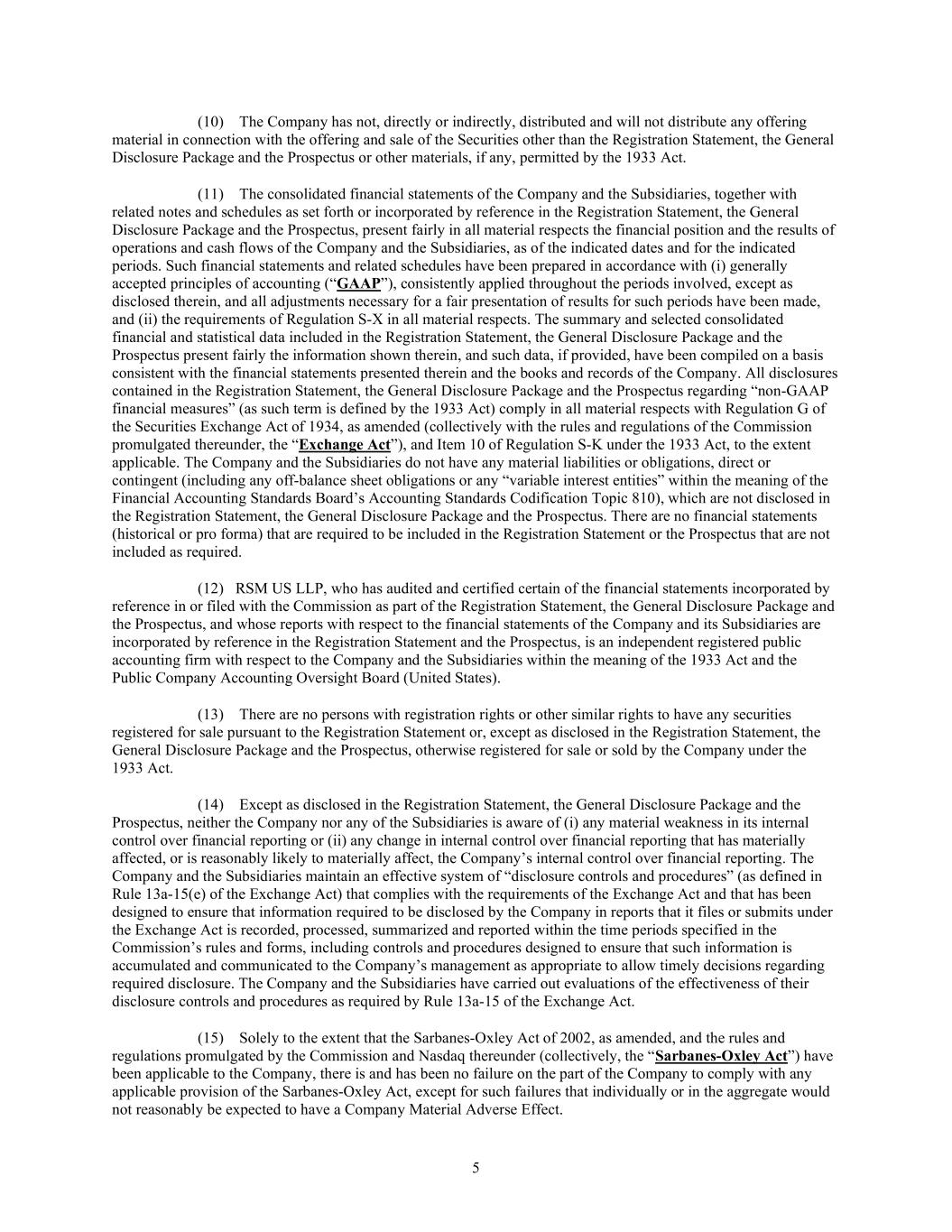 5 (10) The Company has not, directly or indirectly, distributed and will not distribute any offering material in connection with the offering and sale of the Securities other than the Registration Statement, the General Disclosure Package and the Prospectus or other materials, if any, permitted by the 1933 Act. (11) The consolidated financial statements of the Company and the Subsidiaries, together with related notes and schedules as set forth or incorporated by reference in the Registration Statement, the General Disclosure Package and the Prospectus, present fairly in all material respects the financial position and the results of operations and cash flows of the Company and the Subsidiaries, as of the indicated dates and for the indicated periods. Such financial statements and related schedules have been prepared in accordance with (i) generally accepted principles of accounting (“GAAP”), consistently applied throughout the periods involved, except as disclosed therein, and all adjustments necessary for a fair presentation of results for such periods have been made, and (ii) the requirements of Regulation S-X in all material respects. The summary and selected consolidated financial and statistical data included in the Registration Statement, the General Disclosure Package and the Prospectus present fairly the information shown therein, and such data, if provided, have been compiled on a basis consistent with the financial statements presented therein and the books and records of the Company. All disclosures contained in the Registration Statement, the General Disclosure Package and the Prospectus regarding “non-GAAP financial measures” (as such term is defined by the 1933 Act) comply in all material respects with Regulation G of the Securities Exchange Act of 1934, as amended (collectively with the rules and regulations of the Commission promulgated thereunder, the “Exchange Act”), and Item 10 of Regulation S-K under the 1933 Act, to the extent applicable. The Company and the Subsidiaries do not have any material liabilities or obligations, direct or contingent (including any off-balance sheet obligations or any “variable interest entities” within the meaning of the Financial Accounting Standards Board’s Accounting Standards Codification Topic 810), which are not disclosed in the Registration Statement, the General Disclosure Package and the Prospectus. There are no financial statements (historical or pro forma) that are required to be included in the Registration Statement or the Prospectus that are not included as required. (12) RSM US LLP, who has audited and certified certain of the financial statements incorporated by reference in or filed with the Commission as part of the Registration Statement, the General Disclosure Package and the Prospectus, and whose reports with respect to the financial statements of the Company and its Subsidiaries are incorporated by reference in the Registration Statement and the Prospectus, is an independent registered public accounting firm with respect to the Company and the Subsidiaries within the meaning of the 1933 Act and the Public Company Accounting Oversight Board (United States). (13) There are no persons with registration rights or other similar rights to have any securities registered for sale pursuant to the Registration Statement or, except as disclosed in the Registration Statement, the General Disclosure Package and the Prospectus, otherwise registered for sale or sold by the Company under the 1933 Act. (14) Except as disclosed in the Registration Statement, the General Disclosure Package and the Prospectus, neither the Company nor any of the Subsidiaries is aware of (i) any material weakness in its internal control over financial reporting or (ii) any change in internal control over financial reporting that has materially affected, or is reasonably likely to materially affect, the Company’s internal control over financial reporting. The Company and the Subsidiaries maintain an effective system of “disclosure controls and procedures” (as defined in Rule 13a-15(e) of the Exchange Act) that complies with the requirements of the Exchange Act and that has been designed to ensure that information required to be disclosed by the Company in reports that it files or submits under the Exchange Act is recorded, processed, summarized and reported within the time periods specified in the Commission’s rules and forms, including controls and procedures designed to ensure that such information is accumulated and communicated to the Company’s management as appropriate to allow timely decisions regarding required disclosure. The Company and the Subsidiaries have carried out evaluations of the effectiveness of their disclosure controls and procedures as required by Rule 13a-15 of the Exchange Act. (15) Solely to the extent that the Sarbanes-Oxley Act of 2002, as amended, and the rules and regulations promulgated by the Commission and Nasdaq thereunder (collectively, the “Sarbanes-Oxley Act”) have been applicable to the Company, there is and has been no failure on the part of the Company to comply with any applicable provision of the Sarbanes-Oxley Act, except for such failures that individually or in the aggregate would not reasonably be expected to have a Company Material Adverse Effect.