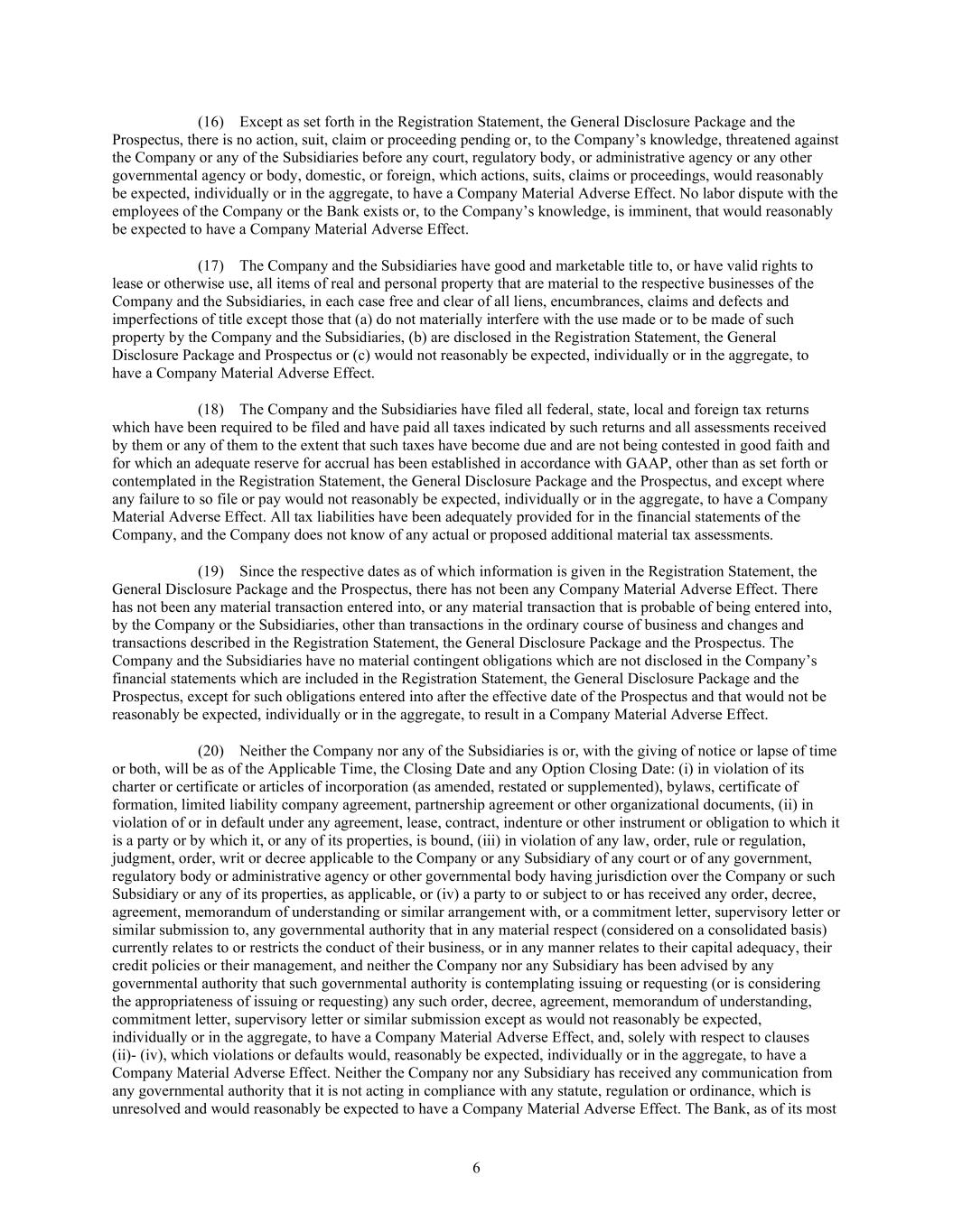 6 (16) Except as set forth in the Registration Statement, the General Disclosure Package and the Prospectus, there is no action, suit, claim or proceeding pending or, to the Company’s knowledge, threatened against the Company or any of the Subsidiaries before any court, regulatory body, or administrative agency or any other governmental agency or body, domestic, or foreign, which actions, suits, claims or proceedings, would reasonably be expected, individually or in the aggregate, to have a Company Material Adverse Effect. No labor dispute with the employees of the Company or the Bank exists or, to the Company’s knowledge, is imminent, that would reasonably be expected to have a Company Material Adverse Effect. (17) The Company and the Subsidiaries have good and marketable title to, or have valid rights to lease or otherwise use, all items of real and personal property that are material to the respective businesses of the Company and the Subsidiaries, in each case free and clear of all liens, encumbrances, claims and defects and imperfections of title except those that (a) do not materially interfere with the use made or to be made of such property by the Company and the Subsidiaries, (b) are disclosed in the Registration Statement, the General Disclosure Package and Prospectus or (c) would not reasonably be expected, individually or in the aggregate, to have a Company Material Adverse Effect. (18) The Company and the Subsidiaries have filed all federal, state, local and foreign tax returns which have been required to be filed and have paid all taxes indicated by such returns and all assessments received by them or any of them to the extent that such taxes have become due and are not being contested in good faith and for which an adequate reserve for accrual has been established in accordance with GAAP, other than as set forth or contemplated in the Registration Statement, the General Disclosure Package and the Prospectus, and except where any failure to so file or pay would not reasonably be expected, individually or in the aggregate, to have a Company Material Adverse Effect. All tax liabilities have been adequately provided for in the financial statements of the Company, and the Company does not know of any actual or proposed additional material tax assessments. (19) Since the respective dates as of which information is given in the Registration Statement, the General Disclosure Package and the Prospectus, there has not been any Company Material Adverse Effect. There has not been any material transaction entered into, or any material transaction that is probable of being entered into, by the Company or the Subsidiaries, other than transactions in the ordinary course of business and changes and transactions described in the Registration Statement, the General Disclosure Package and the Prospectus. The Company and the Subsidiaries have no material contingent obligations which are not disclosed in the Company’s financial statements which are included in the Registration Statement, the General Disclosure Package and the Prospectus, except for such obligations entered into after the effective date of the Prospectus and that would not be reasonably be expected, individually or in the aggregate, to result in a Company Material Adverse Effect. (20) Neither the Company nor any of the Subsidiaries is or, with the giving of notice or lapse of time or both, will be as of the Applicable Time, the Closing Date and any Option Closing Date: (i) in violation of its charter or certificate or articles of incorporation (as amended, restated or supplemented), bylaws, certificate of formation, limited liability company agreement, partnership agreement or other organizational documents, (ii) in violation of or in default under any agreement, lease, contract, indenture or other instrument or obligation to which it is a party or by which it, or any of its properties, is bound, (iii) in violation of any law, order, rule or regulation, judgment, order, writ or decree applicable to the Company or any Subsidiary of any court or of any government, regulatory body or administrative agency or other governmental body having jurisdiction over the Company or such Subsidiary or any of its properties, as applicable, or (iv) a party to or subject to or has received any order, decree, agreement, memorandum of understanding or similar arrangement with, or a commitment letter, supervisory letter or similar submission to, any governmental authority that in any material respect (considered on a consolidated basis) currently relates to or restricts the conduct of their business, or in any manner relates to their capital adequacy, their credit policies or their management, and neither the Company nor any Subsidiary has been advised by any governmental authority that such governmental authority is contemplating issuing or requesting (or is considering the appropriateness of issuing or requesting) any such order, decree, agreement, memorandum of understanding, commitment letter, supervisory letter or similar submission except as would not reasonably be expected, individually or in the aggregate, to have a Company Material Adverse Effect, and, solely with respect to clauses (ii)- (iv), which violations or defaults would, reasonably be expected, individually or in the aggregate, to have a Company Material Adverse Effect. Neither the Company nor any Subsidiary has received any communication from any governmental authority that it is not acting in compliance with any statute, regulation or ordinance, which is unresolved and would reasonably be expected to have a Company Material Adverse Effect. The Bank, as of its most