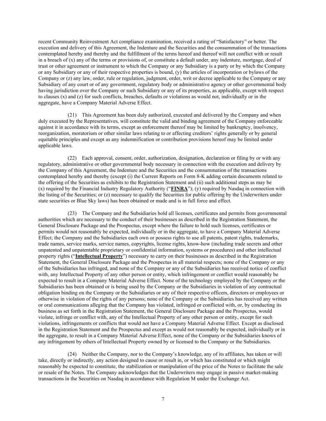 7 recent Community Reinvestment Act compliance examination, received a rating of “Satisfactory” or better. The execution and delivery of this Agreement, the Indenture and the Securities and the consummation of the transactions contemplated hereby and thereby and the fulfillment of the terms hereof and thereof will not conflict with or result in a breach of (x) any of the terms or provisions of, or constitute a default under, any indenture, mortgage, deed of trust or other agreement or instrument to which the Company or any Subsidiary is a party or by which the Company or any Subsidiary or any of their respective properties is bound, (y) the articles of incorporation or bylaws of the Company or (z) any law, order, rule or regulation, judgment, order, writ or decree applicable to the Company or any Subsidiary of any court or of any government, regulatory body or administrative agency or other governmental body having jurisdiction over the Company or such Subsidiary or any of its properties, as applicable, except with respect to clauses (x) and (z) for such conflicts, breaches, defaults or violations as would not, individually or in the aggregate, have a Company Material Adverse Effect. (21) This Agreement has been duly authorized, executed and delivered by the Company and when duly executed by the Representatives, will constitute the valid and binding agreement of the Company enforceable against it in accordance with its terms, except as enforcement thereof may be limited by bankruptcy, insolvency, reorganization, moratorium or other similar laws relating to or affecting creditors’ rights generally or by general equitable principles and except as any indemnification or contribution provisions hereof may be limited under applicable laws. (22) Each approval, consent, order, authorization, designation, declaration or filing by or with any regulatory, administrative or other governmental body necessary in connection with the execution and delivery by the Company of this Agreement, the Indenture and the Securities and the consummation of the transactions contemplated hereby and thereby (except (i) the Current Reports on Form 8-K adding certain documents related to the offering of the Securities as exhibits to the Registration Statement and (ii) such additional steps as may be (x) required by the Financial Industry Regulatory Authority (“FINRA”); (y) required by Nasdaq in connection with the listing of the Securities; or (z) necessary to qualify the Securities for public offering by the Underwriters under state securities or Blue Sky laws) has been obtained or made and is in full force and effect. (23) The Company and the Subsidiaries hold all licenses, certificates and permits from governmental authorities which are necessary to the conduct of their businesses as described in the Registration Statement, the General Disclosure Package and the Prospectus, except where the failure to hold such licenses, certificates or permits would not reasonably be expected, individually or in the aggregate, to have a Company Material Adverse Effect; the Company and the Subsidiaries each own or possess rights to use all patents, patent rights, trademarks, trade names, service marks, service names, copyrights, license rights, know-how (including trade secrets and other unpatented and unpatentable proprietary or confidential information, systems or procedures) and other intellectual property rights (“Intellectual Property”) necessary to carry on their businesses as described in the Registration Statement, the General Disclosure Package and the Prospectus in all material respects; none of the Company or any of the Subsidiaries has infringed, and none of the Company or any of the Subsidiaries has received notice of conflict with, any Intellectual Property of any other person or entity, which infringement or conflict would reasonably be expected to result in a Company Material Adverse Effect. None of the technology employed by the Company or the Subsidiaries has been obtained or is being used by the Company or the Subsidiaries in violation of any contractual obligation binding on the Company or the Subsidiaries or any of their respective officers, directors or employees or otherwise in violation of the rights of any persons; none of the Company or the Subsidiaries has received any written or oral communications alleging that the Company has violated, infringed or conflicted with, or, by conducting its business as set forth in the Registration Statement, the General Disclosure Package and the Prospectus, would violate, infringe or conflict with, any of the Intellectual Property of any other person or entity, except for such violations, infringements or conflicts that would not have a Company Material Adverse Effect. Except as disclosed in the Registration Statement and the Prospectus and except as would not reasonably be expected, individually or in the aggregate, to result in a Company Material Adverse Effect, none of the Company or the Subsidiaries knows of any infringement by others of Intellectual Property owned by or licensed to the Company or the Subsidiaries. (24) Neither the Company, nor to the Company’s knowledge, any of its affiliates, has taken or will take, directly or indirectly, any action designed to cause or result in, or which has constituted or which might reasonably be expected to constitute, the stabilization or manipulation of the price of the Notes to facilitate the sale or resale of the Notes. The Company acknowledges that the Underwriters may engage in passive market-making transactions in the Securities on Nasdaq in accordance with Regulation M under the Exchange Act.