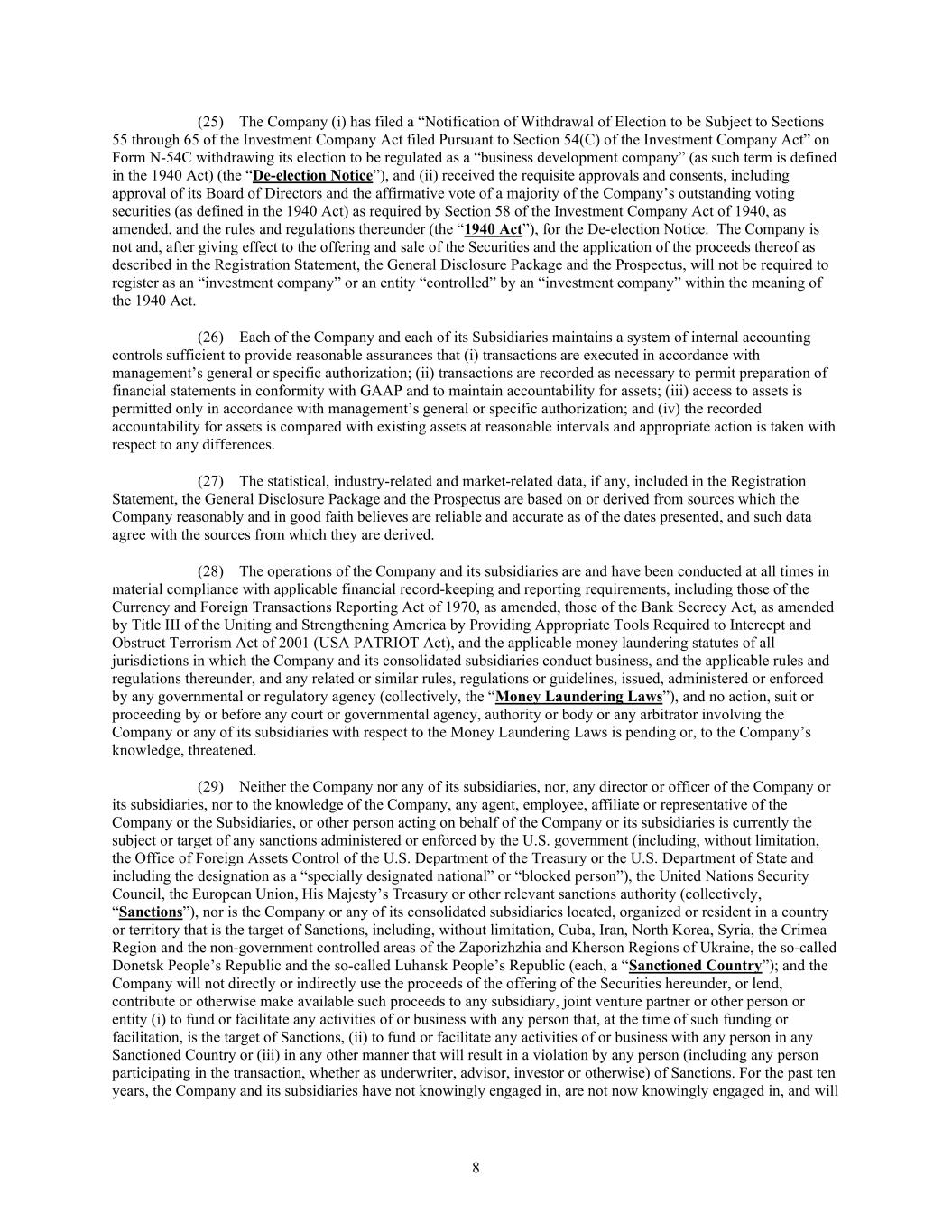 8 (25) The Company (i) has filed a “Notification of Withdrawal of Election to be Subject to Sections 55 through 65 of the Investment Company Act filed Pursuant to Section 54(C) of the Investment Company Act” on Form N-54C withdrawing its election to be regulated as a “business development company” (as such term is defined in the 1940 Act) (the “De-election Notice”), and (ii) received the requisite approvals and consents, including approval of its Board of Directors and the affirmative vote of a majority of the Company’s outstanding voting securities (as defined in the 1940 Act) as required by Section 58 of the Investment Company Act of 1940, as amended, and the rules and regulations thereunder (the “1940 Act”), for the De-election Notice. The Company is not and, after giving effect to the offering and sale of the Securities and the application of the proceeds thereof as described in the Registration Statement, the General Disclosure Package and the Prospectus, will not be required to register as an “investment company” or an entity “controlled” by an “investment company” within the meaning of the 1940 Act. (26) Each of the Company and each of its Subsidiaries maintains a system of internal accounting controls sufficient to provide reasonable assurances that (i) transactions are executed in accordance with management’s general or specific authorization; (ii) transactions are recorded as necessary to permit preparation of financial statements in conformity with GAAP and to maintain accountability for assets; (iii) access to assets is permitted only in accordance with management’s general or specific authorization; and (iv) the recorded accountability for assets is compared with existing assets at reasonable intervals and appropriate action is taken with respect to any differences. (27) The statistical, industry-related and market-related data, if any, included in the Registration Statement, the General Disclosure Package and the Prospectus are based on or derived from sources which the Company reasonably and in good faith believes are reliable and accurate as of the dates presented, and such data agree with the sources from which they are derived. (28) The operations of the Company and its subsidiaries are and have been conducted at all times in material compliance with applicable financial record-keeping and reporting requirements, including those of the Currency and Foreign Transactions Reporting Act of 1970, as amended, those of the Bank Secrecy Act, as amended by Title III of the Uniting and Strengthening America by Providing Appropriate Tools Required to Intercept and Obstruct Terrorism Act of 2001 (USA PATRIOT Act), and the applicable money laundering statutes of all jurisdictions in which the Company and its consolidated subsidiaries conduct business, and the applicable rules and regulations thereunder, and any related or similar rules, regulations or guidelines, issued, administered or enforced by any governmental or regulatory agency (collectively, the “Money Laundering Laws”), and no action, suit or proceeding by or before any court or governmental agency, authority or body or any arbitrator involving the Company or any of its subsidiaries with respect to the Money Laundering Laws is pending or, to the Company’s knowledge, threatened. (29) Neither the Company nor any of its subsidiaries, nor, any director or officer of the Company or its subsidiaries, nor to the knowledge of the Company, any agent, employee, affiliate or representative of the Company or the Subsidiaries, or other person acting on behalf of the Company or its subsidiaries is currently the subject or target of any sanctions administered or enforced by the U.S. government (including, without limitation, the Office of Foreign Assets Control of the U.S. Department of the Treasury or the U.S. Department of State and including the designation as a “specially designated national” or “blocked person”), the United Nations Security Council, the European Union, His Majesty’s Treasury or other relevant sanctions authority (collectively, “Sanctions”), nor is the Company or any of its consolidated subsidiaries located, organized or resident in a country or territory that is the target of Sanctions, including, without limitation, Cuba, Iran, North Korea, Syria, the Crimea Region and the non-government controlled areas of the Zaporizhzhia and Kherson Regions of Ukraine, the so-called Donetsk People’s Republic and the so-called Luhansk People’s Republic (each, a “Sanctioned Country”); and the Company will not directly or indirectly use the proceeds of the offering of the Securities hereunder, or lend, contribute or otherwise make available such proceeds to any subsidiary, joint venture partner or other person or entity (i) to fund or facilitate any activities of or business with any person that, at the time of such funding or facilitation, is the target of Sanctions, (ii) to fund or facilitate any activities of or business with any person in any Sanctioned Country or (iii) in any other manner that will result in a violation by any person (including any person participating in the transaction, whether as underwriter, advisor, investor or otherwise) of Sanctions. For the past ten years, the Company and its subsidiaries have not knowingly engaged in, are not now knowingly engaged in, and will