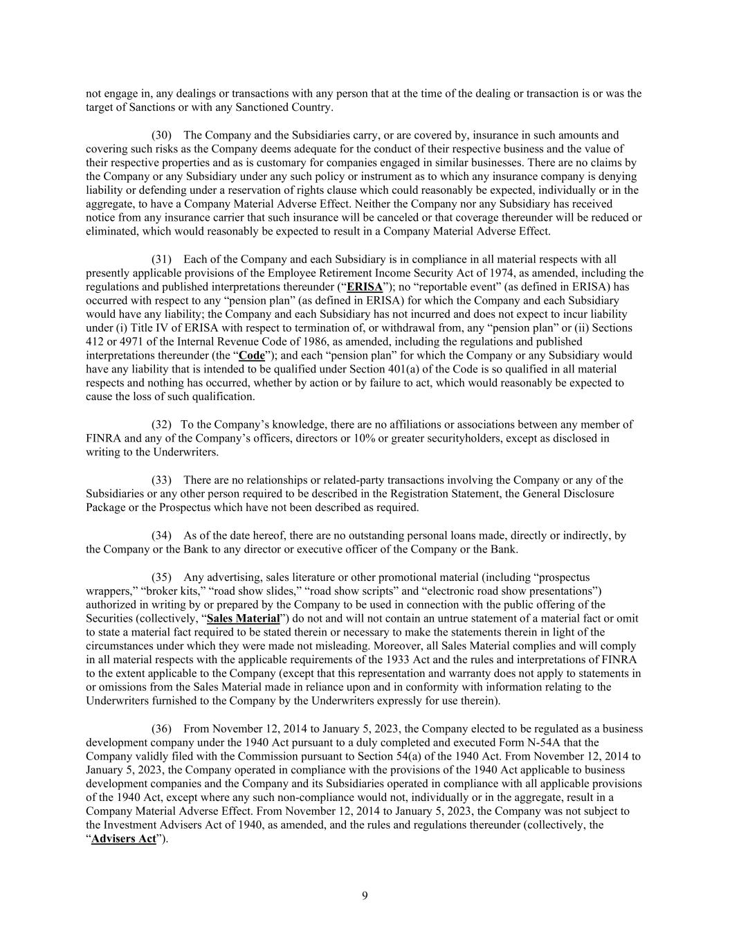 9 not engage in, any dealings or transactions with any person that at the time of the dealing or transaction is or was the target of Sanctions or with any Sanctioned Country. (30) The Company and the Subsidiaries carry, or are covered by, insurance in such amounts and covering such risks as the Company deems adequate for the conduct of their respective business and the value of their respective properties and as is customary for companies engaged in similar businesses. There are no claims by the Company or any Subsidiary under any such policy or instrument as to which any insurance company is denying liability or defending under a reservation of rights clause which could reasonably be expected, individually or in the aggregate, to have a Company Material Adverse Effect. Neither the Company nor any Subsidiary has received notice from any insurance carrier that such insurance will be canceled or that coverage thereunder will be reduced or eliminated, which would reasonably be expected to result in a Company Material Adverse Effect. (31) Each of the Company and each Subsidiary is in compliance in all material respects with all presently applicable provisions of the Employee Retirement Income Security Act of 1974, as amended, including the regulations and published interpretations thereunder (“ERISA”); no “reportable event” (as defined in ERISA) has occurred with respect to any “pension plan” (as defined in ERISA) for which the Company and each Subsidiary would have any liability; the Company and each Subsidiary has not incurred and does not expect to incur liability under (i) Title IV of ERISA with respect to termination of, or withdrawal from, any “pension plan” or (ii) Sections 412 or 4971 of the Internal Revenue Code of 1986, as amended, including the regulations and published interpretations thereunder (the “Code”); and each “pension plan” for which the Company or any Subsidiary would have any liability that is intended to be qualified under Section 401(a) of the Code is so qualified in all material respects and nothing has occurred, whether by action or by failure to act, which would reasonably be expected to cause the loss of such qualification. (32) To the Company’s knowledge, there are no affiliations or associations between any member of FINRA and any of the Company’s officers, directors or 10% or greater securityholders, except as disclosed in writing to the Underwriters. (33) There are no relationships or related-party transactions involving the Company or any of the Subsidiaries or any other person required to be described in the Registration Statement, the General Disclosure Package or the Prospectus which have not been described as required. (34) As of the date hereof, there are no outstanding personal loans made, directly or indirectly, by the Company or the Bank to any director or executive officer of the Company or the Bank. (35) Any advertising, sales literature or other promotional material (including “prospectus wrappers,” “broker kits,” “road show slides,” “road show scripts” and “electronic road show presentations”) authorized in writing by or prepared by the Company to be used in connection with the public offering of the Securities (collectively, “Sales Material”) do not and will not contain an untrue statement of a material fact or omit to state a material fact required to be stated therein or necessary to make the statements therein in light of the circumstances under which they were made not misleading. Moreover, all Sales Material complies and will comply in all material respects with the applicable requirements of the 1933 Act and the rules and interpretations of FINRA to the extent applicable to the Company (except that this representation and warranty does not apply to statements in or omissions from the Sales Material made in reliance upon and in conformity with information relating to the Underwriters furnished to the Company by the Underwriters expressly for use therein). (36) From November 12, 2014 to January 5, 2023, the Company elected to be regulated as a business development company under the 1940 Act pursuant to a duly completed and executed Form N-54A that the Company validly filed with the Commission pursuant to Section 54(a) of the 1940 Act. From November 12, 2014 to January 5, 2023, the Company operated in compliance with the provisions of the 1940 Act applicable to business development companies and the Company and its Subsidiaries operated in compliance with all applicable provisions of the 1940 Act, except where any such non-compliance would not, individually or in the aggregate, result in a Company Material Adverse Effect. From November 12, 2014 to January 5, 2023, the Company was not subject to the Investment Advisers Act of 1940, as amended, and the rules and regulations thereunder (collectively, the “Advisers Act”).