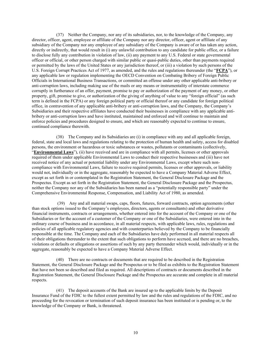 10 (37) Neither the Company, nor any of its subsidiaries, nor, to the knowledge of the Company, any director, officer, agent, employee or affiliate of the Company nor any director, officer, agent or affiliate of any subsidiary of the Company nor any employee of any subsidiary of the Company is aware of or has taken any action, directly or indirectly, that would result in (i) any unlawful contribution to any candidate for public office, or a failure to disclose fully any contribution in violation of law, (ii) any payment to any U.S. Federal or state governmental officer or official, or other person charged with similar public or quasi-public duties, other than payments required or permitted by the laws of the United States or any jurisdiction thereof, or (iii) a violation by such persons of the U.S. Foreign Corrupt Practices Act of 1977, as amended, and the rules and regulations thereunder (the “FCPA”), or any applicable law or regulation implementing the OECD Convention on Combating Bribery of Foreign Public Officials in International Business Transactions, or committed an offense under any other applicable anti-bribery or anti-corruption laws, including making use of the mails or any means or instrumentality of interstate commerce corruptly in furtherance of an offer, payment, promise to pay or authorization of the payment of any money, or other property, gift, promise to give, or authorization of the giving of anything of value to any “foreign official” (as such term is defined in the FCPA) or any foreign political party or official thereof or any candidate for foreign political office, in contravention of any applicable anti-bribery or anti-corruption laws, and the Company, the Company’s Subsidiaries and their respective affiliates have conducted their businesses in compliance with any applicable anti- bribery or anti-corruption laws and have instituted, maintained and enforced and will continue to maintain and enforce policies and procedures designed to ensure, and which are reasonably expected to continue to ensure, continued compliance therewith. (38) The Company and its Subsidiaries are (i) in compliance with any and all applicable foreign, federal, state and local laws and regulations relating to the protection of human health and safety, access for disabled persons, the environment or hazardous or toxic substances or wastes, pollutants or contaminants (collectively, “Environmental Laws”), (ii) have received and are in compliance with all permits, licenses or other approvals required of them under applicable Environmental Laws to conduct their respective businesses and (iii) have not received notice of any actual or potential liability under any Environmental Laws, except where such non- compliance with Environmental Laws, failure to receive required permits, licenses or other approvals, or liability would not, individually or in the aggregate, reasonably be expected to have a Company Material Adverse Effect, except as set forth in or contemplated in the Registration Statement, the General Disclosure Package and the Prospectus. Except as set forth in the Registration Statement, the General Disclosure Package and the Prospectus, neither the Company nor any of the Subsidiaries has been named as a “potentially responsible party” under the Comprehensive Environmental Response, Compensation, and Liability Act of 1980, as amended. (39) Any and all material swaps, caps, floors, futures, forward contracts, option agreements (other than stock options issued to the Company’s employees, directors, agents or consultants) and other derivative financial instruments, contracts or arrangements, whether entered into for the account of the Company or one of the Subsidiaries or for the account of a customer of the Company or one of the Subsidiaries, were entered into in the ordinary course of business and in accordance, in all material respects, with applicable laws, rules, regulations and policies of all applicable regulatory agencies and with counterparties believed by the Company to be financially responsible at the time. The Company and each of the Subsidiaries have duly performed in all material respects all of their obligations thereunder to the extent that such obligations to perform have accrued, and there are no breaches, violations or defaults or allegations or assertions of such by any party thereunder which would, individually or in the aggregate, reasonably be expected to have a Company Material Adverse Effect. (40) There are no contracts or documents that are required to be described in the Registration Statement, the General Disclosure Package and the Prospectus or to be filed as exhibits to the Registration Statement that have not been so described and filed as required. All descriptions of contracts or documents described in the Registration Statement, the General Disclosure Package and the Prospectus are accurate and complete in all material respects. (41) The deposit accounts of the Bank are insured up to the applicable limits by the Deposit Insurance Fund of the FDIC to the fullest extent permitted by law and the rules and regulations of the FDIC, and no proceeding for the revocation or termination of such deposit insurance has been instituted or is pending or, to the knowledge of the Company or Bank, is threatened.