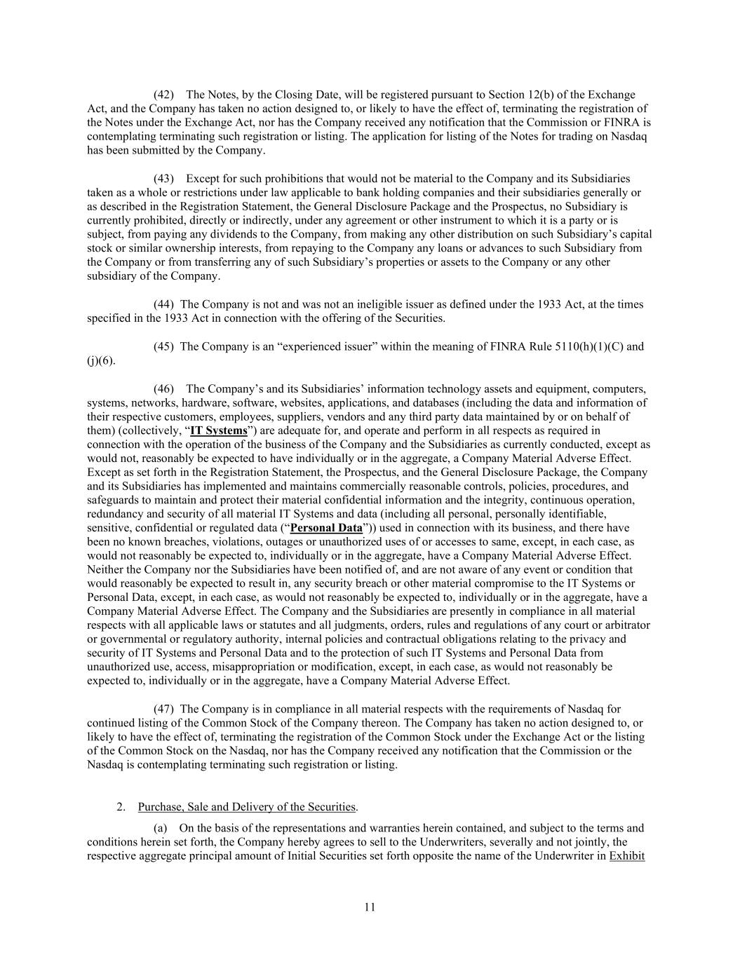11 (42) The Notes, by the Closing Date, will be registered pursuant to Section 12(b) of the Exchange Act, and the Company has taken no action designed to, or likely to have the effect of, terminating the registration of the Notes under the Exchange Act, nor has the Company received any notification that the Commission or FINRA is contemplating terminating such registration or listing. The application for listing of the Notes for trading on Nasdaq has been submitted by the Company. (43) Except for such prohibitions that would not be material to the Company and its Subsidiaries taken as a whole or restrictions under law applicable to bank holding companies and their subsidiaries generally or as described in the Registration Statement, the General Disclosure Package and the Prospectus, no Subsidiary is currently prohibited, directly or indirectly, under any agreement or other instrument to which it is a party or is subject, from paying any dividends to the Company, from making any other distribution on such Subsidiary’s capital stock or similar ownership interests, from repaying to the Company any loans or advances to such Subsidiary from the Company or from transferring any of such Subsidiary’s properties or assets to the Company or any other subsidiary of the Company. (44) The Company is not and was not an ineligible issuer as defined under the 1933 Act, at the times specified in the 1933 Act in connection with the offering of the Securities. (45) The Company is an “experienced issuer” within the meaning of FINRA Rule 5110(h)(1)(C) and (j)(6). (46) The Company’s and its Subsidiaries’ information technology assets and equipment, computers, systems, networks, hardware, software, websites, applications, and databases (including the data and information of their respective customers, employees, suppliers, vendors and any third party data maintained by or on behalf of them) (collectively, “IT Systems”) are adequate for, and operate and perform in all respects as required in connection with the operation of the business of the Company and the Subsidiaries as currently conducted, except as would not, reasonably be expected to have individually or in the aggregate, a Company Material Adverse Effect. Except as set forth in the Registration Statement, the Prospectus, and the General Disclosure Package, the Company and its Subsidiaries has implemented and maintains commercially reasonable controls, policies, procedures, and safeguards to maintain and protect their material confidential information and the integrity, continuous operation, redundancy and security of all material IT Systems and data (including all personal, personally identifiable, sensitive, confidential or regulated data (“Personal Data”)) used in connection with its business, and there have been no known breaches, violations, outages or unauthorized uses of or accesses to same, except, in each case, as would not reasonably be expected to, individually or in the aggregate, have a Company Material Adverse Effect. Neither the Company nor the Subsidiaries have been notified of, and are not aware of any event or condition that would reasonably be expected to result in, any security breach or other material compromise to the IT Systems or Personal Data, except, in each case, as would not reasonably be expected to, individually or in the aggregate, have a Company Material Adverse Effect. The Company and the Subsidiaries are presently in compliance in all material respects with all applicable laws or statutes and all judgments, orders, rules and regulations of any court or arbitrator or governmental or regulatory authority, internal policies and contractual obligations relating to the privacy and security of IT Systems and Personal Data and to the protection of such IT Systems and Personal Data from unauthorized use, access, misappropriation or modification, except, in each case, as would not reasonably be expected to, individually or in the aggregate, have a Company Material Adverse Effect. (47) The Company is in compliance in all material respects with the requirements of Nasdaq for continued listing of the Common Stock of the Company thereon. The Company has taken no action designed to, or likely to have the effect of, terminating the registration of the Common Stock under the Exchange Act or the listing of the Common Stock on the Nasdaq, nor has the Company received any notification that the Commission or the Nasdaq is contemplating terminating such registration or listing. 2. Purchase, Sale and Delivery of the Securities. (a) On the basis of the representations and warranties herein contained, and subject to the terms and conditions herein set forth, the Company hereby agrees to sell to the Underwriters, severally and not jointly, the respective aggregate principal amount of Initial Securities set forth opposite the name of the Underwriter in Exhibit