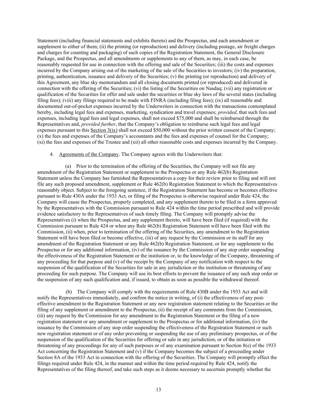 13 Statement (including financial statements and exhibits thereto) and the Prospectus, and each amendment or supplement to either of them; (ii) the printing (or reproduction) and delivery (including postage, air freight charges and charges for counting and packaging) of such copies of the Registration Statement, the General Disclosure Package, and the Prospectus, and all amendments or supplements to any of them, as may, in each case, be reasonably requested for use in connection with the offering and sale of the Securities; (iii) the costs and expenses incurred by the Company arising out of the marketing of the sale of the Securities to investors; (iv) the preparation, printing, authentication, issuance and delivery of the Securities; (v) the printing (or reproduction) and delivery of this Agreement, any blue sky memorandum and all closing documents printed (or reproduced) and delivered in connection with the offering of the Securities; (vi) the listing of the Securities on Nasdaq; (vii) any registration or qualification of the Securities for offer and sale under the securities or blue sky laws of the several states (including filing fees); (viii) any filings required to be made with FINRA (including filing fees); (ix) all reasonable and documented out-of-pocket expenses incurred by the Underwriters in connection with the transactions contemplated hereby, including legal fees and expenses, marketing, syndication and travel expenses; provided, that such fees and expenses, including legal fees and legal expenses, shall not exceed $75,000 and shall be reimbursed through the Representatives and, provided further, that the Company’s obligation to reimburse such legal fees and legal expenses pursuant to this Section 3(ix) shall not exceed $50,000 without the prior written consent of the Company; (x) the fees and expenses of the Company’s accountants and the fees and expenses of counsel for the Company; (xi) the fees and expenses of the Trustee and (xii) all other reasonable costs and expenses incurred by the Company. 4. Agreements of the Company. The Company agrees with the Underwriters that: (a) Prior to the termination of the offering of the Securities, the Company will not file any amendment of the Registration Statement or supplement to the Prospectus or any Rule 462(b) Registration Statement unless the Company has furnished the Representatives a copy for their review prior to filing and will not file any such proposed amendment, supplement or Rule 462(b) Registration Statement to which the Representatives reasonably object. Subject to the foregoing sentence, if the Registration Statement has become or becomes effective pursuant to Rule 430A under the 1933 Act, or filing of the Prospectus is otherwise required under Rule 424, the Company will cause the Prospectus, properly completed, and any supplement thereto to be filed in a form approved by the Representatives with the Commission pursuant to Rule 424 within the time period prescribed and will provide evidence satisfactory to the Representatives of such timely filing. The Company will promptly advise the Representatives (i) when the Prospectus, and any supplement thereto, will have been filed (if required) with the Commission pursuant to Rule 424 or when any Rule 462(b) Registration Statement will have been filed with the Commission, (ii) when, prior to termination of the offering of the Securities, any amendment to the Registration Statement will have been filed or become effective, (iii) of any request by the Commission or its staff for any amendment of the Registration Statement or any Rule 462(b) Registration Statement, or for any supplement to the Prospectus or for any additional information, (iv) of the issuance by the Commission of any stop order suspending the effectiveness of the Registration Statement or the institution or, to the knowledge of the Company, threatening of any proceeding for that purpose and (v) of the receipt by the Company of any notification with respect to the suspension of the qualification of the Securities for sale in any jurisdiction or the institution or threatening of any proceeding for such purpose. The Company will use its best efforts to prevent the issuance of any such stop order or the suspension of any such qualification and, if issued, to obtain as soon as possible the withdrawal thereof. (b) The Company will comply with the requirements of Rule 430B under the 1933 Act and will notify the Representatives immediately, and confirm the notice in writing, of (i) the effectiveness of any post- effective amendment to the Registration Statement or any new registration statement relating to the Securities or the filing of any supplement or amendment to the Prospectus, (ii) the receipt of any comments from the Commission, (iii) any request by the Commission for any amendment to the Registration Statement or the filing of a new registration statement or any amendment or supplement to the Prospectus or for additional information, (iv) the issuance by the Commission of any stop order suspending the effectiveness of the Registration Statement or such new registration statement or of any order preventing or suspending the use of any preliminary prospectus, or of the suspension of the qualification of the Securities for offering or sale in any jurisdiction, or of the initiation or threatening of any proceedings for any of such purposes or of any examination pursuant to Section 8(e) of the 1933 Act concerning the Registration Statement and (v) if the Company becomes the subject of a proceeding under Section 8A of the 1933 Act in connection with the offering of the Securities. The Company will promptly effect the filings required under Rule 424, in the manner and within the time period required by Rule 424, notify the Representatives of the filing thereof, and take such steps as it deems necessary to ascertain promptly whether the