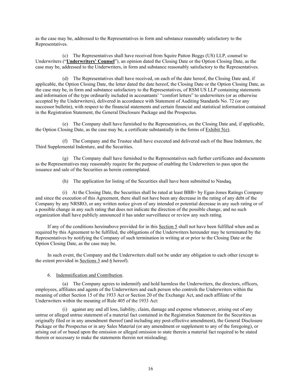 16 as the case may be, addressed to the Representatives in form and substance reasonably satisfactory to the Representatives. (c) The Representatives shall have received from Squire Patton Boggs (US) LLP, counsel to Underwriters (“Underwriters’ Counsel”), an opinion dated the Closing Date or the Option Closing Date, as the case may be, addressed to the Underwriters, in form and substance reasonably satisfactory to the Representatives. (d) The Representatives shall have received, on each of the date hereof, the Closing Date and, if applicable, the Option Closing Date, the letter dated the date hereof, the Closing Date or the Option Closing Date, as the case may be, in form and substance satisfactory to the Representatives, of RSM US LLP containing statements and information of the type ordinarily included in accountants’ “comfort letters” to underwriters (or as otherwise accepted by the Underwriters), delivered in accordance with Statement of Auditing Standards No. 72 (or any successor bulletin), with respect to the financial statements and certain financial and statistical information contained in the Registration Statement, the General Disclosure Package and the Prospectus. (e) The Company shall have furnished to the Representatives, on the Closing Date and, if applicable, the Option Closing Date, as the case may be, a certificate substantially in the forms of Exhibit 5(e). (f) The Company and the Trustee shall have executed and delivered each of the Base Indenture, the Third Supplemental Indenture, and the Securities. (g) The Company shall have furnished to the Representatives such further certificates and documents as the Representatives may reasonably require for the purpose of enabling the Underwriters to pass upon the issuance and sale of the Securities as herein contemplated. (h) The application for listing of the Securities shall have been submitted to Nasdaq. (i) At the Closing Date, the Securities shall be rated at least BBB+ by Egan-Jones Ratings Company and since the execution of this Agreement, there shall not have been any decrease in the rating of any debt of the Company by any NRSRO, or any written notice given of any intended or potential decrease in any such rating or of a possible change in any such rating that does not indicate the direction of the possible change, and no such organization shall have publicly announced it has under surveillance or review any such rating. If any of the conditions hereinabove provided for in this Section 5 shall not have been fulfilled when and as required by this Agreement to be fulfilled, the obligations of the Underwriters hereunder may be terminated by the Representatives by notifying the Company of such termination in writing at or prior to the Closing Date or the Option Closing Date, as the case may be. In such event, the Company and the Underwriters shall not be under any obligation to each other (except to the extent provided in Sections 3 and 6 hereof). 6. Indemnification and Contribution. (a) The Company agrees to indemnify and hold harmless the Underwriters, the directors, officers, employees, affiliates and agents of the Underwriters and each person who controls the Underwriters within the meaning of either Section 15 of the 1933 Act or Section 20 of the Exchange Act, and each affiliate of the Underwriters within the meaning of Rule 405 of the 1933 Act: (i) against any and all loss, liability, claim, damage and expense whatsoever, arising out of any untrue or alleged untrue statement of a material fact contained in the Registration Statement for the Securities as originally filed or in any amendment thereof (and including any post-effective amendment), the General Disclosure Package or the Prospectus or in any Sales Material (or any amendment or supplement to any of the foregoing), or arising out of or based upon the omission or alleged omission to state therein a material fact required to be stated therein or necessary to make the statements therein not misleading;