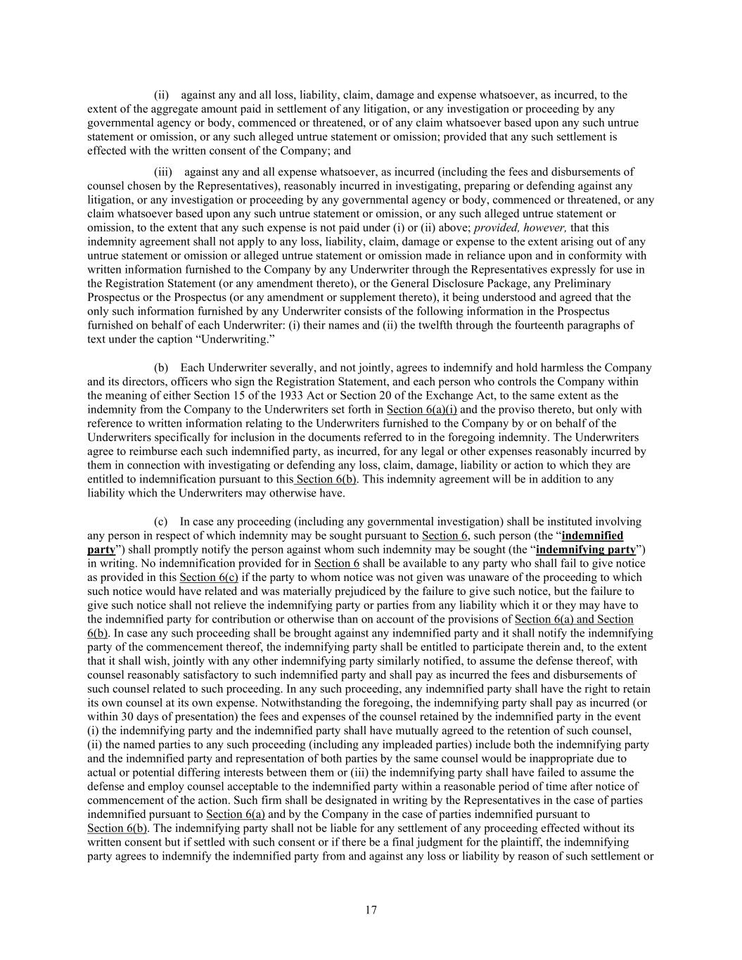 17 (ii) against any and all loss, liability, claim, damage and expense whatsoever, as incurred, to the extent of the aggregate amount paid in settlement of any litigation, or any investigation or proceeding by any governmental agency or body, commenced or threatened, or of any claim whatsoever based upon any such untrue statement or omission, or any such alleged untrue statement or omission; provided that any such settlement is effected with the written consent of the Company; and (iii) against any and all expense whatsoever, as incurred (including the fees and disbursements of counsel chosen by the Representatives), reasonably incurred in investigating, preparing or defending against any litigation, or any investigation or proceeding by any governmental agency or body, commenced or threatened, or any claim whatsoever based upon any such untrue statement or omission, or any such alleged untrue statement or omission, to the extent that any such expense is not paid under (i) or (ii) above; provided, however, that this indemnity agreement shall not apply to any loss, liability, claim, damage or expense to the extent arising out of any untrue statement or omission or alleged untrue statement or omission made in reliance upon and in conformity with written information furnished to the Company by any Underwriter through the Representatives expressly for use in the Registration Statement (or any amendment thereto), or the General Disclosure Package, any Preliminary Prospectus or the Prospectus (or any amendment or supplement thereto), it being understood and agreed that the only such information furnished by any Underwriter consists of the following information in the Prospectus furnished on behalf of each Underwriter: (i) their names and (ii) the twelfth through the fourteenth paragraphs of text under the caption “Underwriting.” (b) Each Underwriter severally, and not jointly, agrees to indemnify and hold harmless the Company and its directors, officers who sign the Registration Statement, and each person who controls the Company within the meaning of either Section 15 of the 1933 Act or Section 20 of the Exchange Act, to the same extent as the indemnity from the Company to the Underwriters set forth in Section 6(a)(i) and the proviso thereto, but only with reference to written information relating to the Underwriters furnished to the Company by or on behalf of the Underwriters specifically for inclusion in the documents referred to in the foregoing indemnity. The Underwriters agree to reimburse each such indemnified party, as incurred, for any legal or other expenses reasonably incurred by them in connection with investigating or defending any loss, claim, damage, liability or action to which they are entitled to indemnification pursuant to this Section 6(b). This indemnity agreement will be in addition to any liability which the Underwriters may otherwise have. (c) In case any proceeding (including any governmental investigation) shall be instituted involving any person in respect of which indemnity may be sought pursuant to Section 6, such person (the “indemnified party”) shall promptly notify the person against whom such indemnity may be sought (the “indemnifying party”) in writing. No indemnification provided for in Section 6 shall be available to any party who shall fail to give notice as provided in this Section 6(c) if the party to whom notice was not given was unaware of the proceeding to which such notice would have related and was materially prejudiced by the failure to give such notice, but the failure to give such notice shall not relieve the indemnifying party or parties from any liability which it or they may have to the indemnified party for contribution or otherwise than on account of the provisions of Section 6(a) and Section 6(b). In case any such proceeding shall be brought against any indemnified party and it shall notify the indemnifying party of the commencement thereof, the indemnifying party shall be entitled to participate therein and, to the extent that it shall wish, jointly with any other indemnifying party similarly notified, to assume the defense thereof, with counsel reasonably satisfactory to such indemnified party and shall pay as incurred the fees and disbursements of such counsel related to such proceeding. In any such proceeding, any indemnified party shall have the right to retain its own counsel at its own expense. Notwithstanding the foregoing, the indemnifying party shall pay as incurred (or within 30 days of presentation) the fees and expenses of the counsel retained by the indemnified party in the event (i) the indemnifying party and the indemnified party shall have mutually agreed to the retention of such counsel, (ii) the named parties to any such proceeding (including any impleaded parties) include both the indemnifying party and the indemnified party and representation of both parties by the same counsel would be inappropriate due to actual or potential differing interests between them or (iii) the indemnifying party shall have failed to assume the defense and employ counsel acceptable to the indemnified party within a reasonable period of time after notice of commencement of the action. Such firm shall be designated in writing by the Representatives in the case of parties indemnified pursuant to Section 6(a) and by the Company in the case of parties indemnified pursuant to Section 6(b). The indemnifying party shall not be liable for any settlement of any proceeding effected without its written consent but if settled with such consent or if there be a final judgment for the plaintiff, the indemnifying party agrees to indemnify the indemnified party from and against any loss or liability by reason of such settlement or
