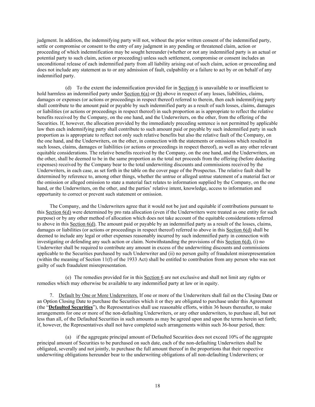 18 judgment. In addition, the indemnifying party will not, without the prior written consent of the indemnified party, settle or compromise or consent to the entry of any judgment in any pending or threatened claim, action or proceeding of which indemnification may be sought hereunder (whether or not any indemnified party is an actual or potential party to such claim, action or proceeding) unless such settlement, compromise or consent includes an unconditional release of each indemnified party from all liability arising out of such claim, action or proceeding and does not include any statement as to or any admission of fault, culpability or a failure to act by or on behalf of any indemnified party. (d) To the extent the indemnification provided for in Section 6 is unavailable to or insufficient to hold harmless an indemnified party under Section 6(a) or (b) above in respect of any losses, liabilities, claims, damages or expenses (or actions or proceedings in respect thereof) referred to therein, then each indemnifying party shall contribute to the amount paid or payable by such indemnified party as a result of such losses, claims, damages or liabilities (or actions or proceedings in respect thereof) in such proportion as is appropriate to reflect the relative benefits received by the Company, on the one hand, and the Underwriters, on the other, from the offering of the Securities. If, however, the allocation provided by the immediately preceding sentence is not permitted by applicable law then each indemnifying party shall contribute to such amount paid or payable by such indemnified party in such proportion as is appropriate to reflect not only such relative benefits but also the relative fault of the Company, on the one hand, and the Underwriters, on the other, in connection with the statements or omissions which resulted in such losses, claims, damages or liabilities (or actions or proceedings in respect thereof), as well as any other relevant equitable considerations. The relative benefits received by the Company, on the one hand, and the Underwriters, on the other, shall be deemed to be in the same proportion as the total net proceeds from the offering (before deducting expenses) received by the Company bear to the total underwriting discounts and commissions received by the Underwriters, in each case, as set forth in the table on the cover page of the Prospectus. The relative fault shall be determined by reference to, among other things, whether the untrue or alleged untrue statement of a material fact or the omission or alleged omission to state a material fact relates to information supplied by the Company, on the one hand, or the Underwriters, on the other, and the parties’ relative intent, knowledge, access to information and opportunity to correct or prevent such statement or omission. The Company, and the Underwriters agree that it would not be just and equitable if contributions pursuant to this Section 6(d) were determined by pro rata allocation (even if the Underwriters were treated as one entity for such purpose) or by any other method of allocation which does not take account of the equitable considerations referred to above in this Section 6(d). The amount paid or payable by an indemnified party as a result of the losses, claims, damages or liabilities (or actions or proceedings in respect thereof) referred to above in this Section 6(d) shall be deemed to include any legal or other expenses reasonably incurred by such indemnified party in connection with investigating or defending any such action or claim. Notwithstanding the provisions of this Section 6(d), (i) no Underwriter shall be required to contribute any amount in excess of the underwriting discounts and commissions applicable to the Securities purchased by such Underwriter and (ii) no person guilty of fraudulent misrepresentation (within the meaning of Section 11(f) of the 1933 Act) shall be entitled to contribution from any person who was not guilty of such fraudulent misrepresentation. (e) The remedies provided for in this Section 6 are not exclusive and shall not limit any rights or remedies which may otherwise be available to any indemnified party at law or in equity. 7. Default by One or More Underwriters. If one or more of the Underwriters shall fail on the Closing Date or an Option Closing Date to purchase the Securities which it or they are obligated to purchase under this Agreement (the “Defaulted Securities”), the Representatives shall use reasonable efforts, within 36 hours thereafter, to make arrangements for one or more of the non-defaulting Underwriters, or any other underwriters, to purchase all, but not less than all, of the Defaulted Securities in such amounts as may be agreed upon and upon the terms herein set forth; if, however, the Representatives shall not have completed such arrangements within such 36-hour period, then: (a) if the aggregate principal amount of Defaulted Securities does not exceed 10% of the aggregate principal amount of Securities to be purchased on such date, each of the non-defaulting Underwriters shall be obligated, severally and not jointly, to purchase the full amount thereof in the proportions that their respective underwriting obligations hereunder bear to the underwriting obligations of all non-defaulting Underwriters; or