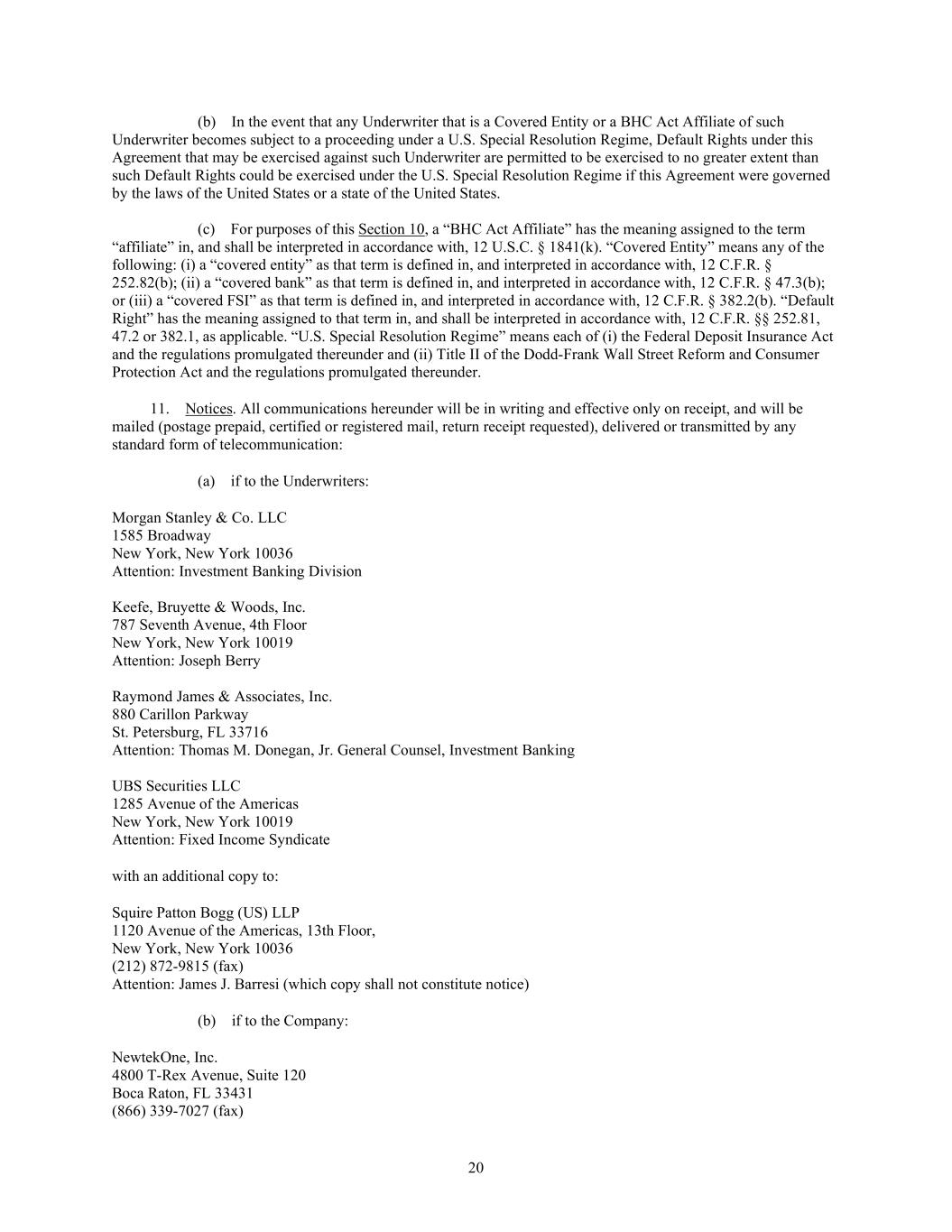 20 (b) In the event that any Underwriter that is a Covered Entity or a BHC Act Affiliate of such Underwriter becomes subject to a proceeding under a U.S. Special Resolution Regime, Default Rights under this Agreement that may be exercised against such Underwriter are permitted to be exercised to no greater extent than such Default Rights could be exercised under the U.S. Special Resolution Regime if this Agreement were governed by the laws of the United States or a state of the United States. (c) For purposes of this Section 10, a “BHC Act Affiliate” has the meaning assigned to the term “affiliate” in, and shall be interpreted in accordance with, 12 U.S.C. § 1841(k). “Covered Entity” means any of the following: (i) a “covered entity” as that term is defined in, and interpreted in accordance with, 12 C.F.R. § 252.82(b); (ii) a “covered bank” as that term is defined in, and interpreted in accordance with, 12 C.F.R. § 47.3(b); or (iii) a “covered FSI” as that term is defined in, and interpreted in accordance with, 12 C.F.R. § 382.2(b). “Default Right” has the meaning assigned to that term in, and shall be interpreted in accordance with, 12 C.F.R. §§ 252.81, 47.2 or 382.1, as applicable. “U.S. Special Resolution Regime” means each of (i) the Federal Deposit Insurance Act and the regulations promulgated thereunder and (ii) Title II of the Dodd-Frank Wall Street Reform and Consumer Protection Act and the regulations promulgated thereunder. 11. Notices. All communications hereunder will be in writing and effective only on receipt, and will be mailed (postage prepaid, certified or registered mail, return receipt requested), delivered or transmitted by any standard form of telecommunication: (a) if to the Underwriters: Morgan Stanley & Co. LLC 1585 Broadway New York, New York 10036 Attention: Investment Banking Division Keefe, Bruyette & Woods, Inc. 787 Seventh Avenue, 4th Floor New York, New York 10019 Attention: Joseph Berry Raymond James & Associates, Inc. 880 Carillon Parkway St. Petersburg, FL 33716 Attention: Thomas M. Donegan, Jr. General Counsel, Investment Banking UBS Securities LLC 1285 Avenue of the Americas New York, New York 10019 Attention: Fixed Income Syndicate with an additional copy to: Squire Patton Bogg (US) LLP 1120 Avenue of the Americas, 13th Floor, New York, New York 10036 (212) 872-9815 (fax) Attention: James J. Barresi (which copy shall not constitute notice) (b) if to the Company: NewtekOne, Inc. 4800 T-Rex Avenue, Suite 120 Boca Raton, FL 33431 (866) 339-7027 (fax)