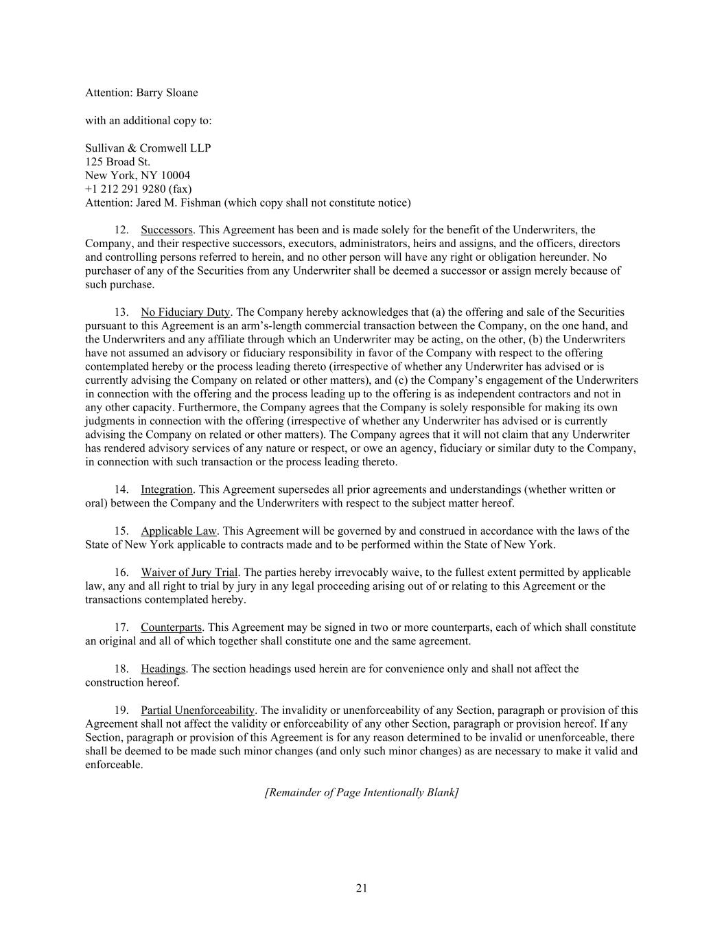 21 Attention: Barry Sloane with an additional copy to: Sullivan & Cromwell LLP 125 Broad St. New York, NY 10004 +1 212 291 9280 (fax) Attention: Jared M. Fishman (which copy shall not constitute notice) 12. Successors. This Agreement has been and is made solely for the benefit of the Underwriters, the Company, and their respective successors, executors, administrators, heirs and assigns, and the officers, directors and controlling persons referred to herein, and no other person will have any right or obligation hereunder. No purchaser of any of the Securities from any Underwriter shall be deemed a successor or assign merely because of such purchase. 13. No Fiduciary Duty. The Company hereby acknowledges that (a) the offering and sale of the Securities pursuant to this Agreement is an arm’s-length commercial transaction between the Company, on the one hand, and the Underwriters and any affiliate through which an Underwriter may be acting, on the other, (b) the Underwriters have not assumed an advisory or fiduciary responsibility in favor of the Company with respect to the offering contemplated hereby or the process leading thereto (irrespective of whether any Underwriter has advised or is currently advising the Company on related or other matters), and (c) the Company’s engagement of the Underwriters in connection with the offering and the process leading up to the offering is as independent contractors and not in any other capacity. Furthermore, the Company agrees that the Company is solely responsible for making its own judgments in connection with the offering (irrespective of whether any Underwriter has advised or is currently advising the Company on related or other matters). The Company agrees that it will not claim that any Underwriter has rendered advisory services of any nature or respect, or owe an agency, fiduciary or similar duty to the Company, in connection with such transaction or the process leading thereto. 14. Integration. This Agreement supersedes all prior agreements and understandings (whether written or oral) between the Company and the Underwriters with respect to the subject matter hereof. 15. Applicable Law. This Agreement will be governed by and construed in accordance with the laws of the State of New York applicable to contracts made and to be performed within the State of New York. 16. Waiver of Jury Trial. The parties hereby irrevocably waive, to the fullest extent permitted by applicable law, any and all right to trial by jury in any legal proceeding arising out of or relating to this Agreement or the transactions contemplated hereby. 17. Counterparts. This Agreement may be signed in two or more counterparts, each of which shall constitute an original and all of which together shall constitute one and the same agreement. 18. Headings. The section headings used herein are for convenience only and shall not affect the construction hereof. 19. Partial Unenforceability. The invalidity or unenforceability of any Section, paragraph or provision of this Agreement shall not affect the validity or enforceability of any other Section, paragraph or provision hereof. If any Section, paragraph or provision of this Agreement is for any reason determined to be invalid or unenforceable, there shall be deemed to be made such minor changes (and only such minor changes) as are necessary to make it valid and enforceable. [Remainder of Page Intentionally Blank]