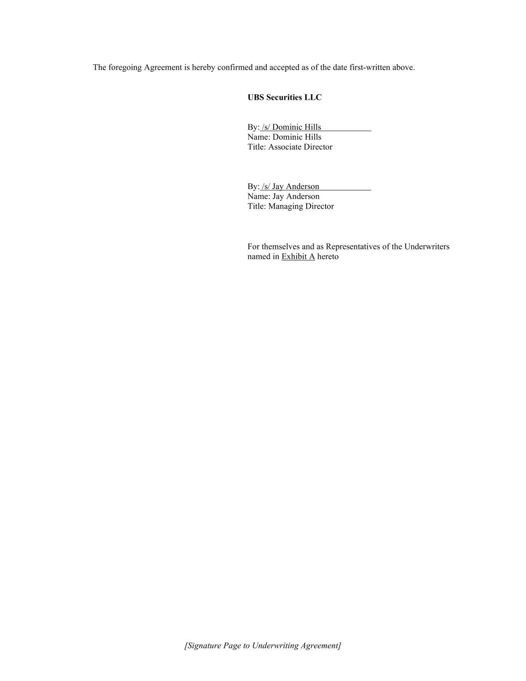 [Signature Page to Underwriting Agreement] The foregoing Agreement is hereby confirmed and accepted as of the date first-written above. UBS Securities LLC By: /s/ Dominic Hills Name: Dominic Hills Title: Associate Director By: /s/ Jay Anderson Name: Jay Anderson Title: Managing Director For themselves and as Representatives of the Underwriters named in Exhibit A hereto