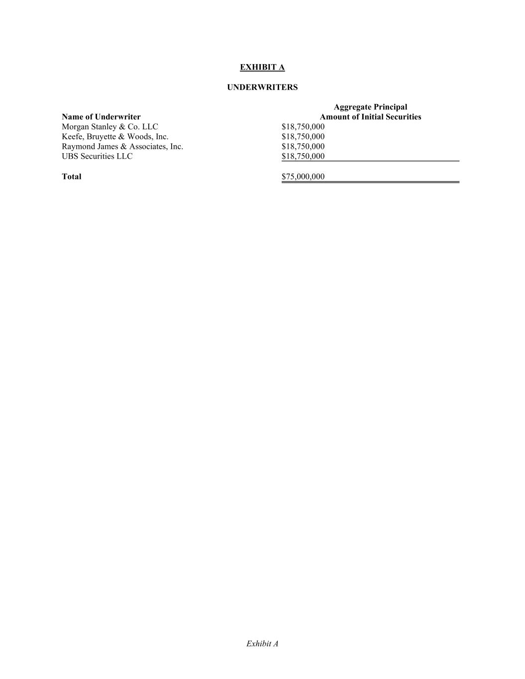 Exhibit A EXHIBIT A UNDERWRITERS Name of Underwriter Aggregate Principal Amount of Initial Securities Morgan Stanley & Co. LLC $18,750,000 Keefe, Bruyette & Woods, Inc. $18,750,000 Raymond James & Associates, Inc. $18,750,000 UBS Securities LLC $18,750,000 Total $75,000,000