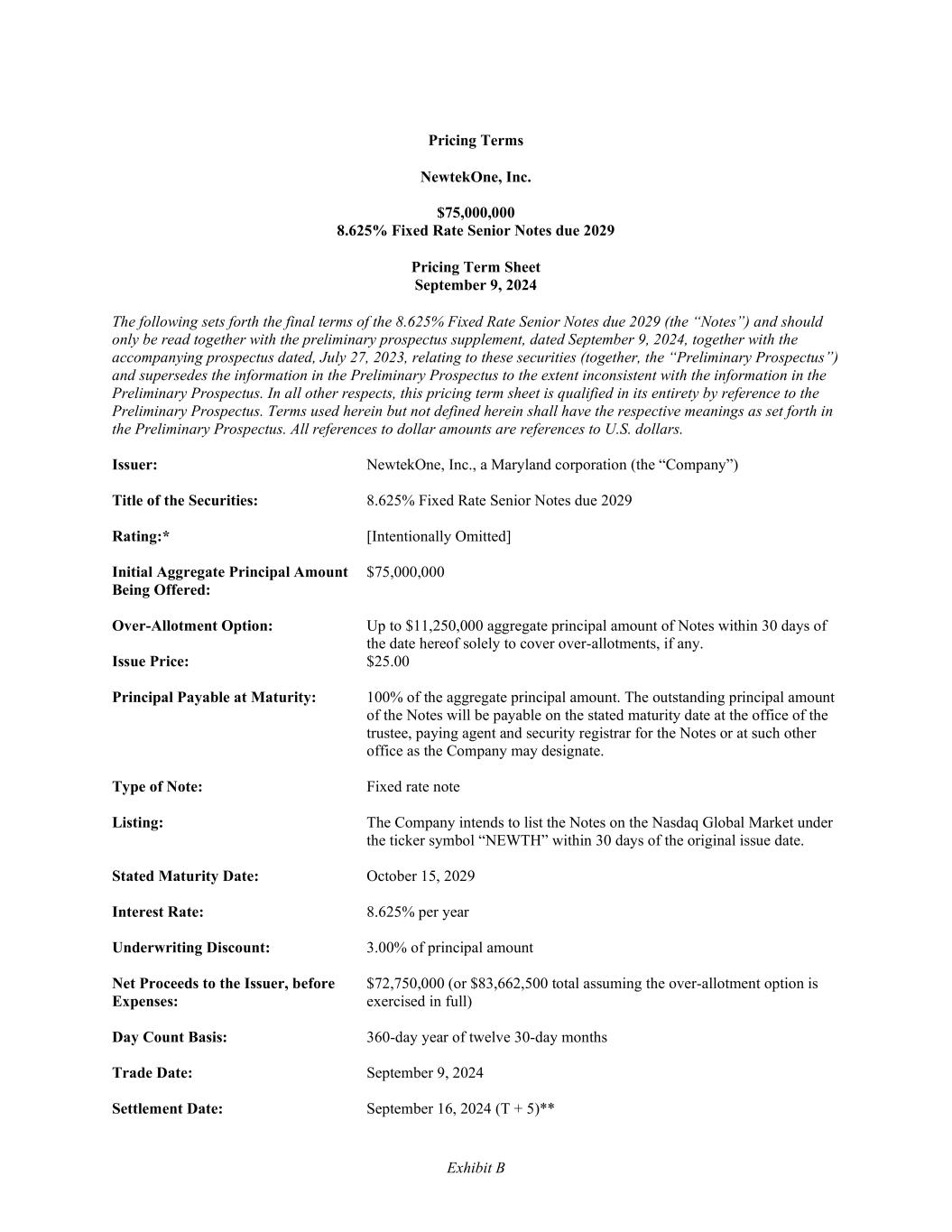 Exhibit B Pricing Terms NewtekOne, Inc. $75,000,000 8.625% Fixed Rate Senior Notes due 2029 Pricing Term Sheet September 9, 2024 The following sets forth the final terms of the 8.625% Fixed Rate Senior Notes due 2029 (the “Notes”) and should only be read together with the preliminary prospectus supplement, dated September 9, 2024, together with the accompanying prospectus dated, July 27, 2023, relating to these securities (together, the “Preliminary Prospectus”) and supersedes the information in the Preliminary Prospectus to the extent inconsistent with the information in the Preliminary Prospectus. In all other respects, this pricing term sheet is qualified in its entirety by reference to the Preliminary Prospectus. Terms used herein but not defined herein shall have the respective meanings as set forth in the Preliminary Prospectus. All references to dollar amounts are references to U.S. dollars. Issuer: NewtekOne, Inc., a Maryland corporation (the “Company”) Title of the Securities: 8.625% Fixed Rate Senior Notes due 2029 Rating:* [Intentionally Omitted] Initial Aggregate Principal Amount Being Offered: $75,000,000 Over-Allotment Option: Up to $11,250,000 aggregate principal amount of Notes within 30 days of the date hereof solely to cover over-allotments, if any. Issue Price: $25.00 Principal Payable at Maturity: 100% of the aggregate principal amount. The outstanding principal amount of the Notes will be payable on the stated maturity date at the office of the trustee, paying agent and security registrar for the Notes or at such other office as the Company may designate. Type of Note: Fixed rate note Listing: The Company intends to list the Notes on the Nasdaq Global Market under the ticker symbol “NEWTH” within 30 days of the original issue date. Stated Maturity Date: October 15, 2029 Interest Rate: 8.625% per year Underwriting Discount: 3.00% of principal amount Net Proceeds to the Issuer, before Expenses: $72,750,000 (or $83,662,500 total assuming the over-allotment option is exercised in full) Day Count Basis: 360-day year of twelve 30-day months Trade Date: September 9, 2024 Settlement Date: September 16, 2024 (T + 5)**